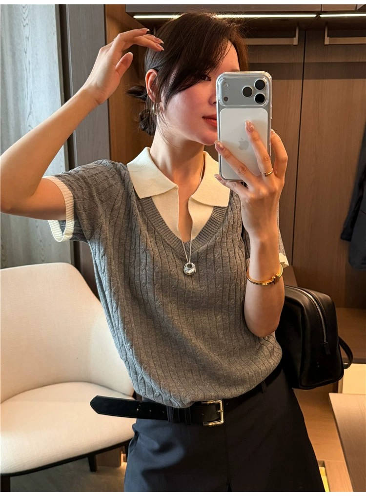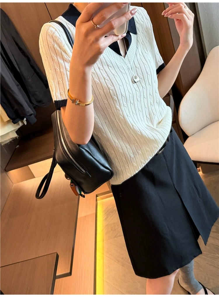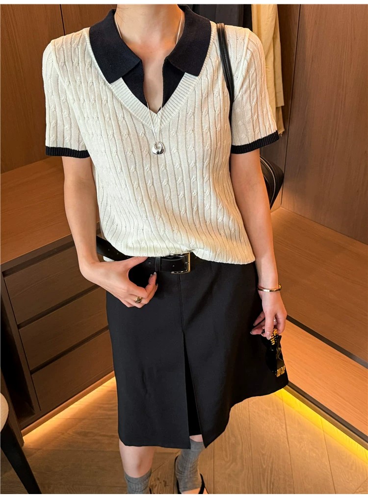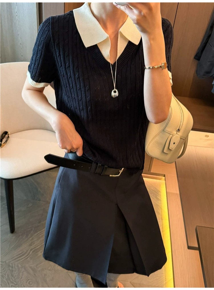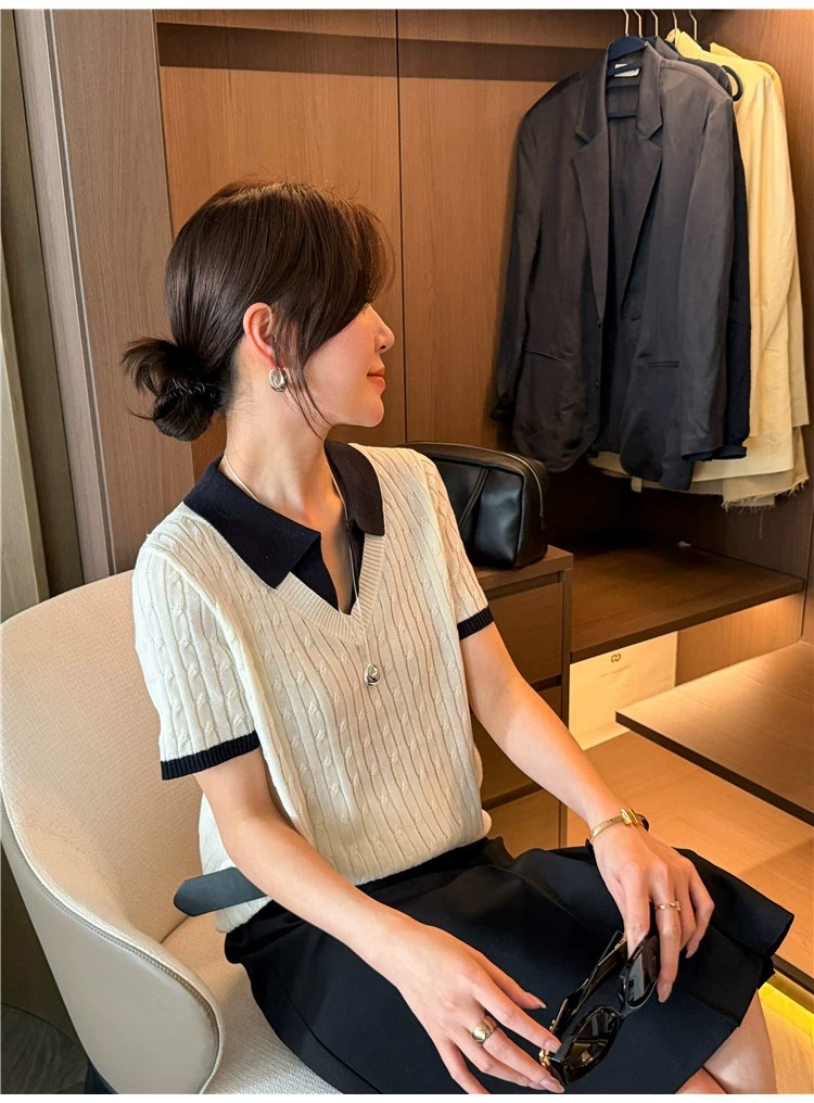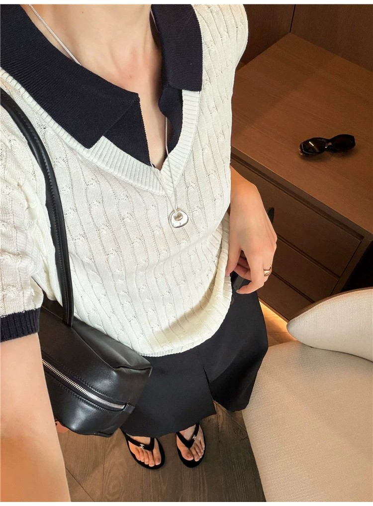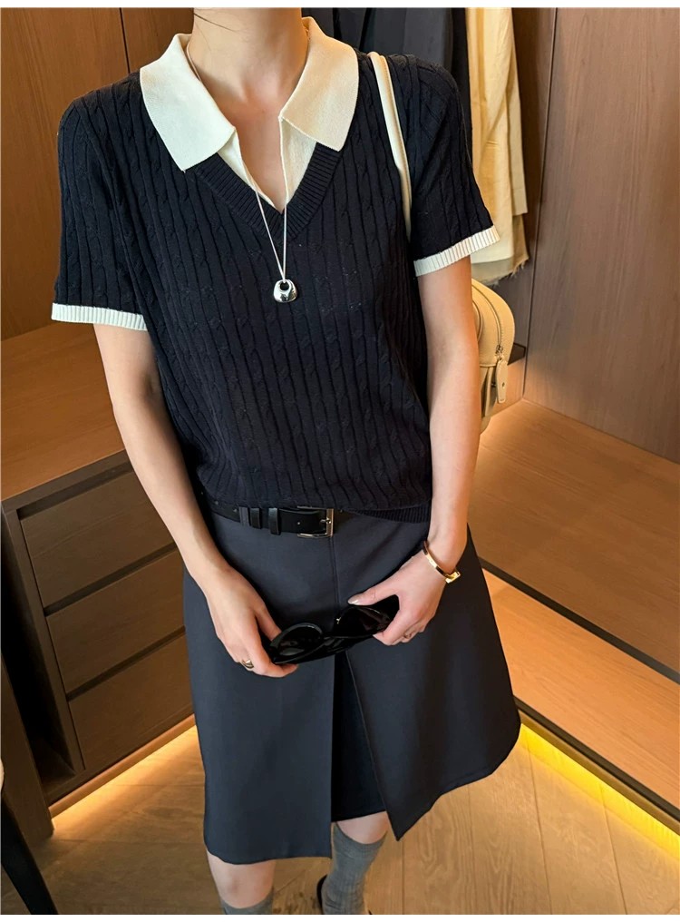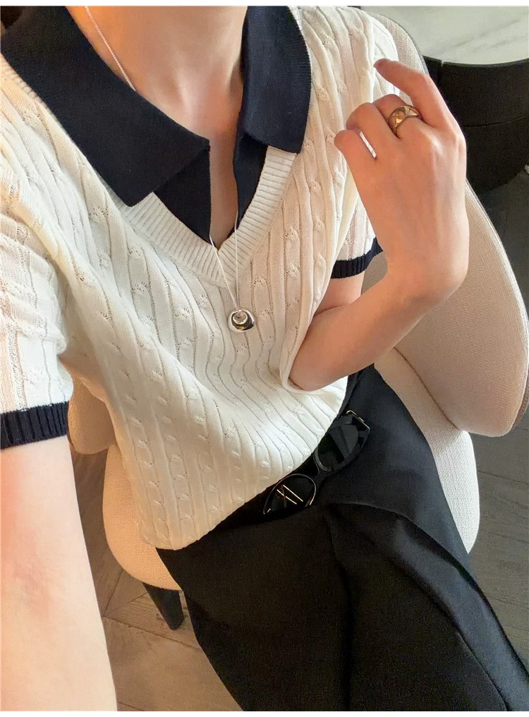 all in 여름 2026 새로운 한 부서 디자인 센스 행침 목 페이크 레이어드 니트 스웨터 여성 배색 몸매 가꾸기 반팔 맨위