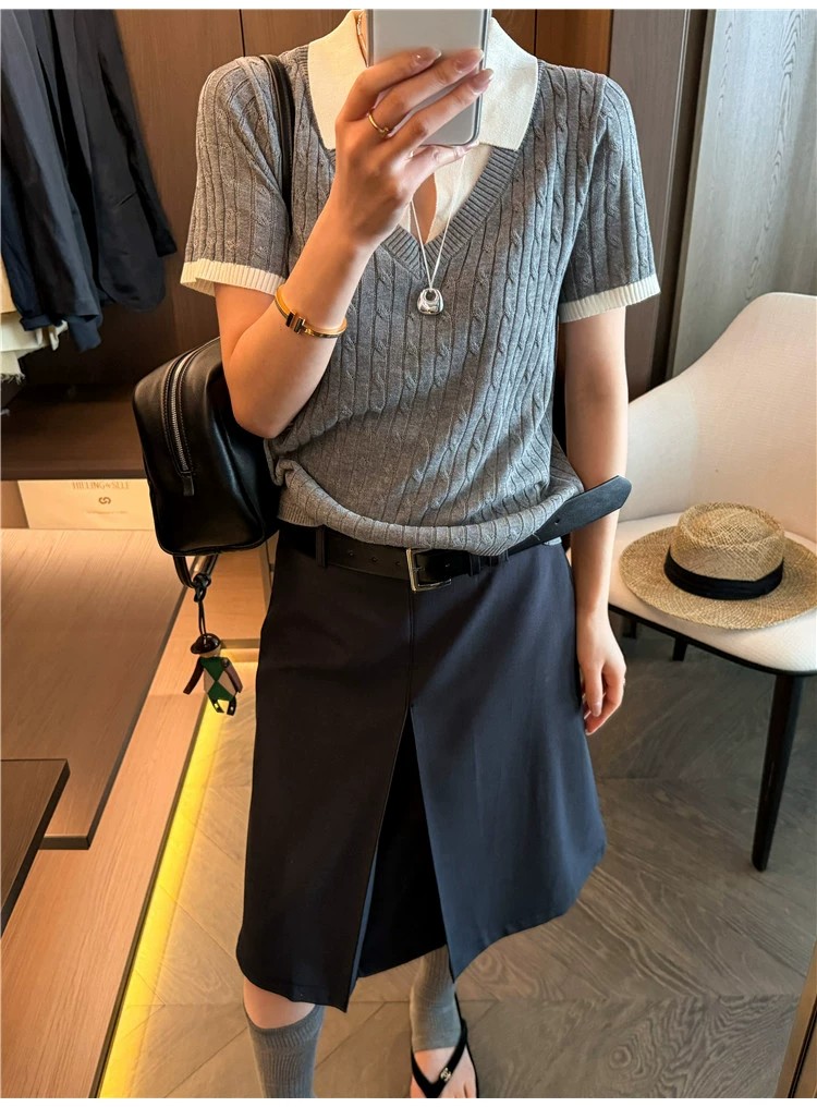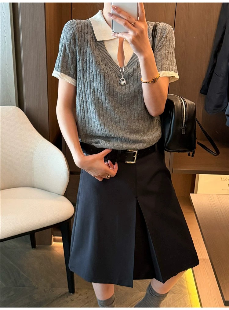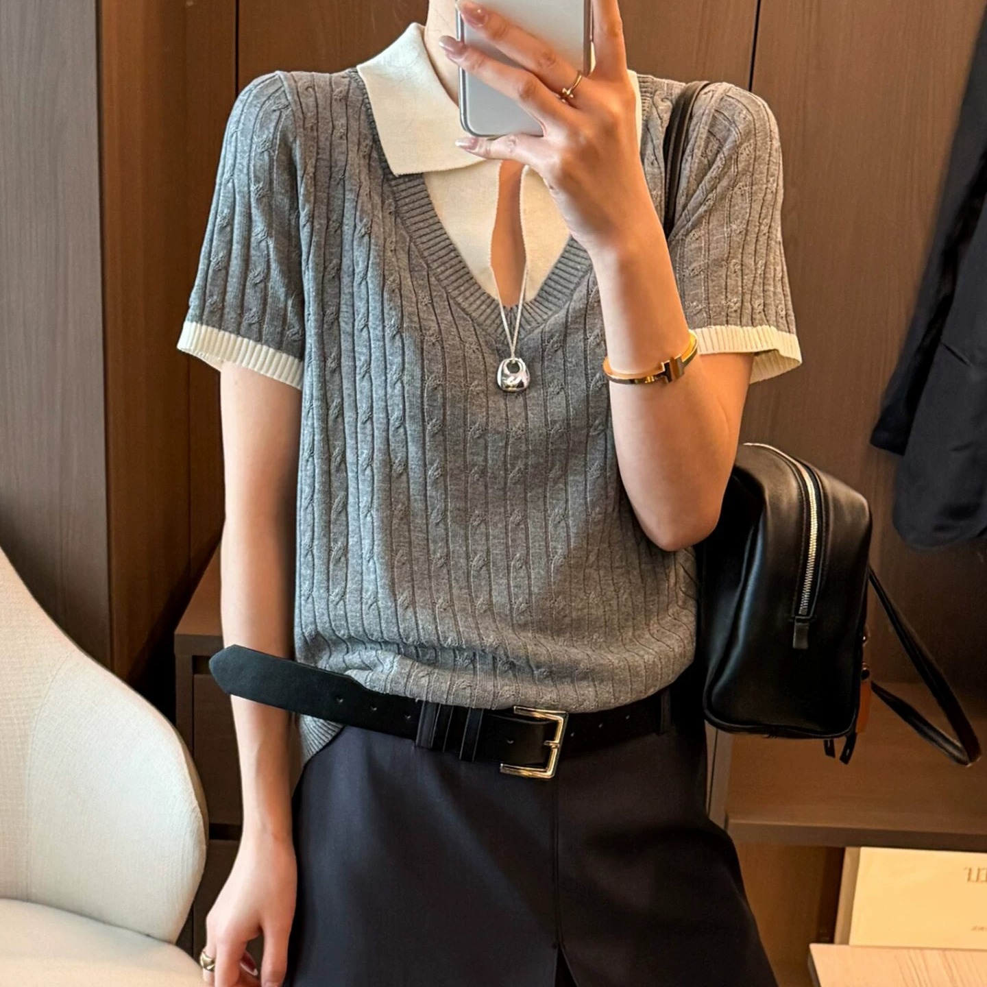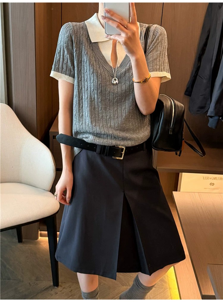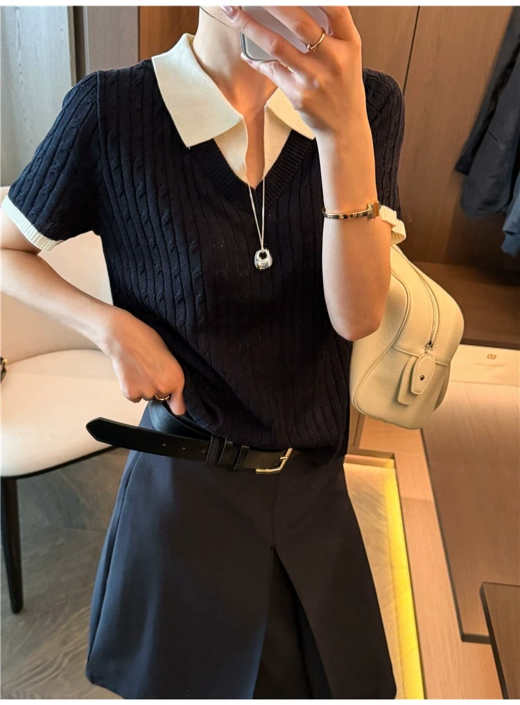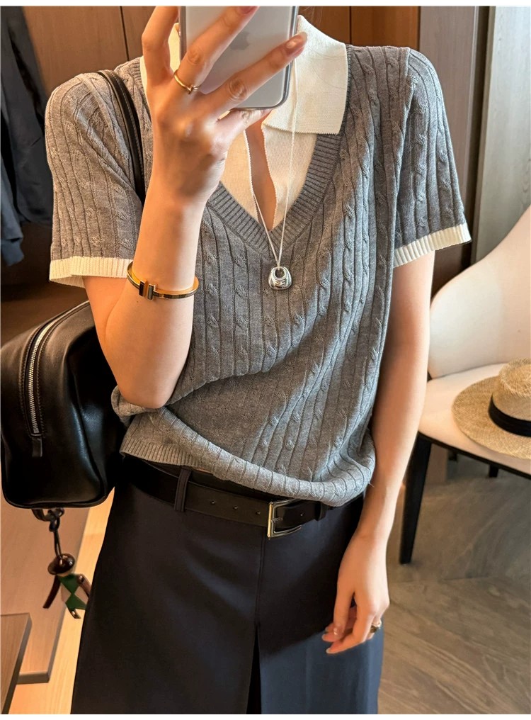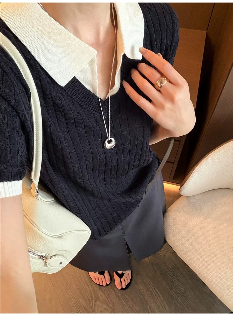 all in 여름 2026 새로운 한 부서 디자인 센스 행침 목 페이크 레이어드 니트 스웨터 여성 배색 몸매 가꾸기 반팔 맨위