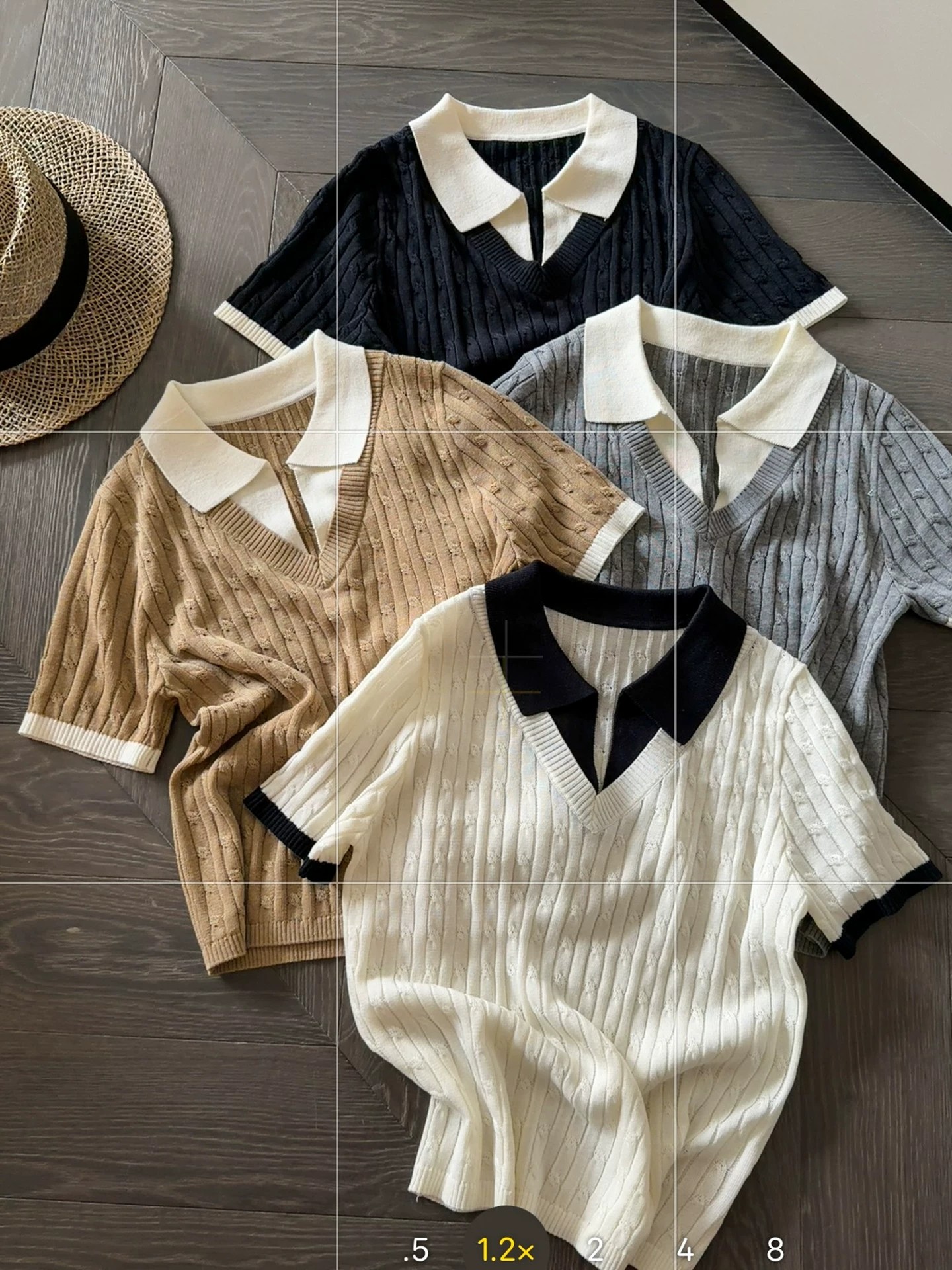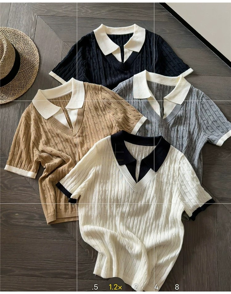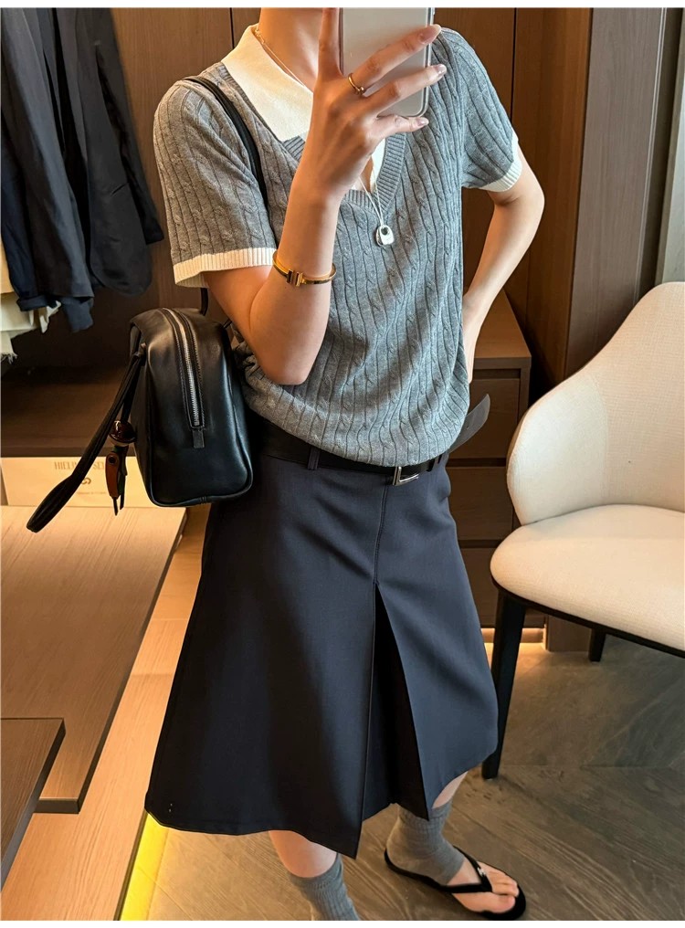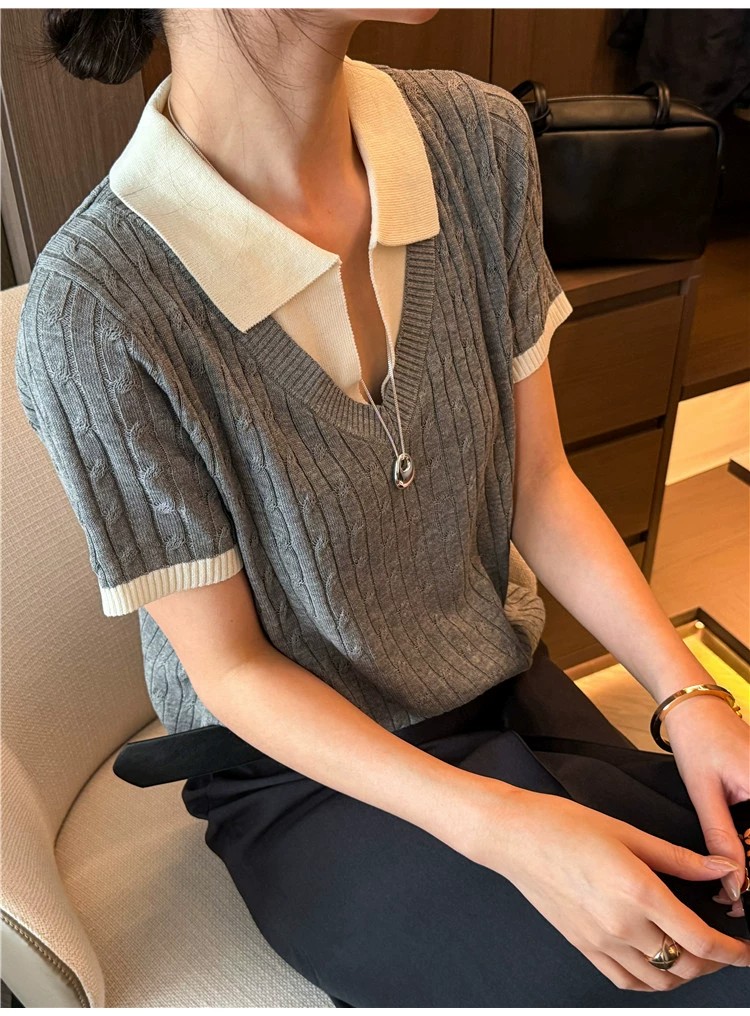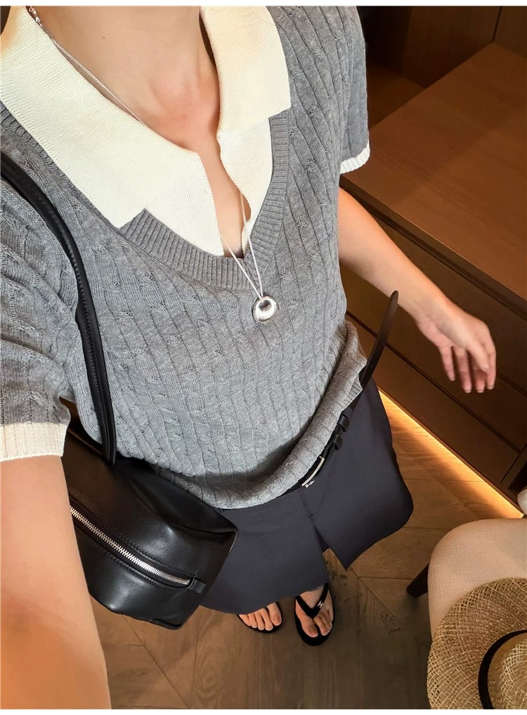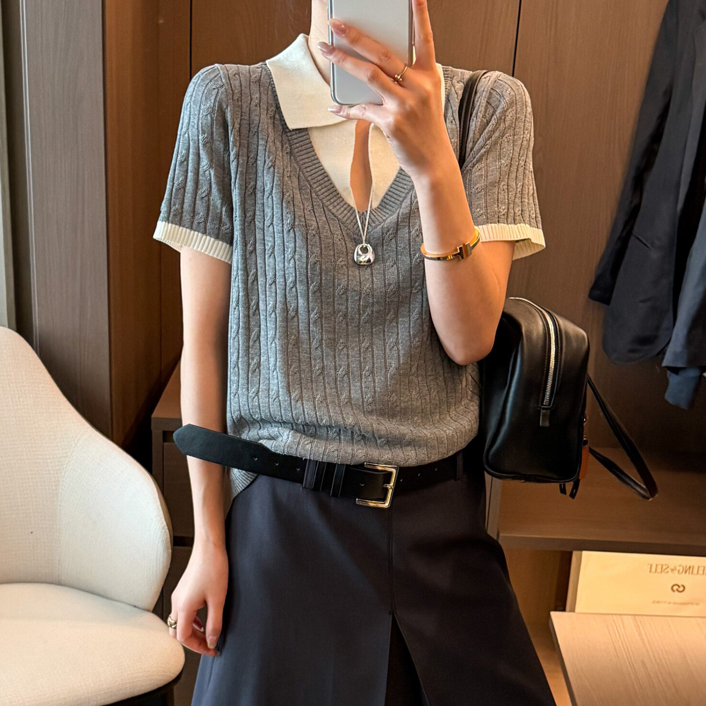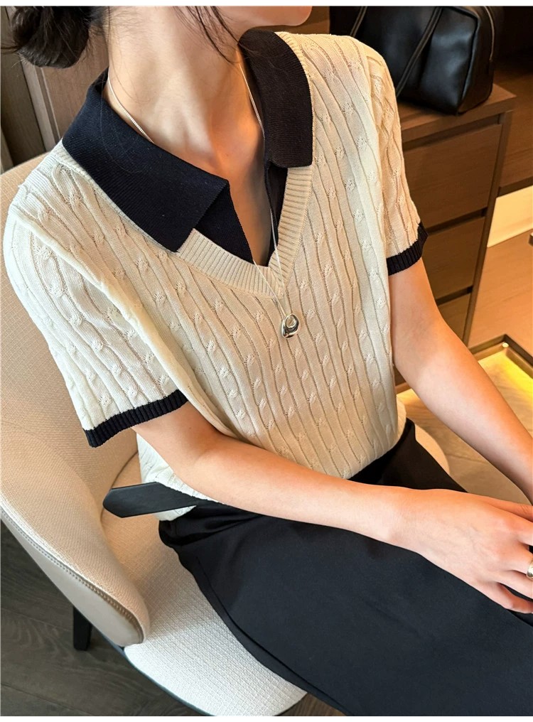 all in 여름 2026 새로운 한 부서 디자인 센스 행침 목 페이크 레이어드 니트 스웨터 여성 배색 몸매 가꾸기 반팔 맨위