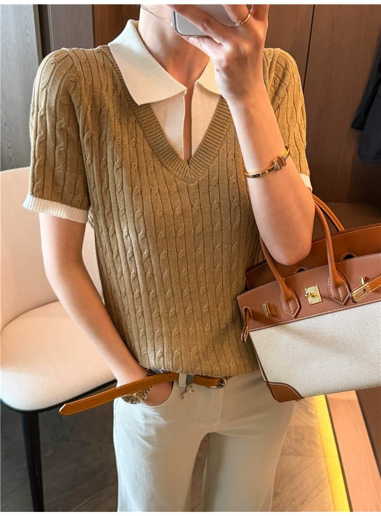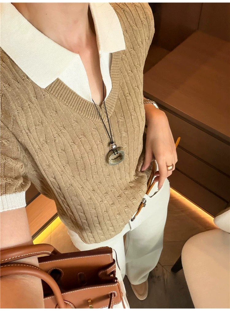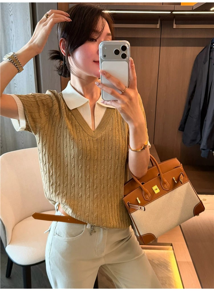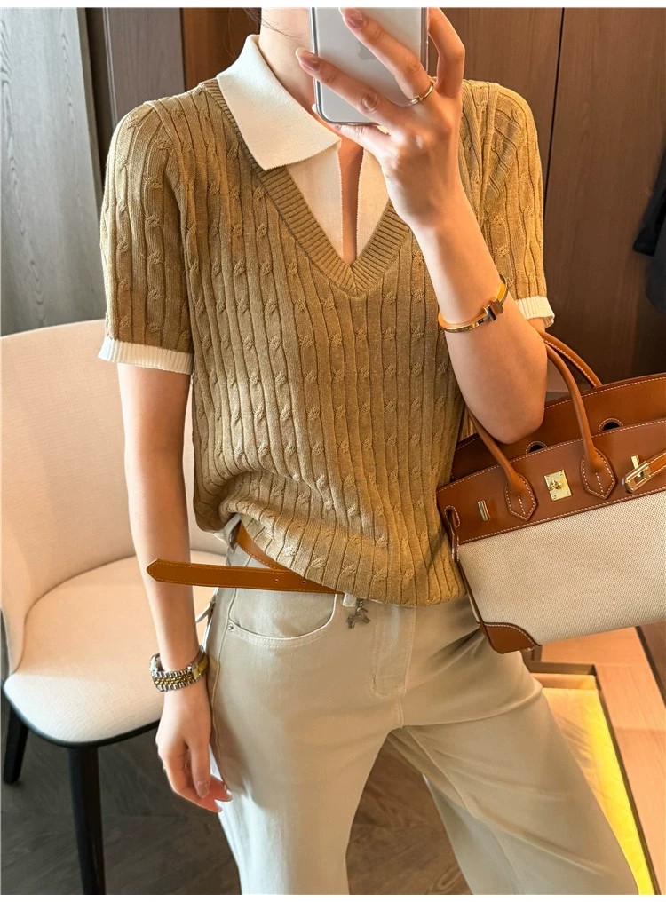 한 부서 착용 가져 가라. 낙타 스카프 V넥 니트 반팔 티셔츠 여성 여름 고급 센스 품격 긍정적 인 어깨 작은 맨위