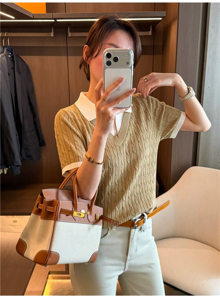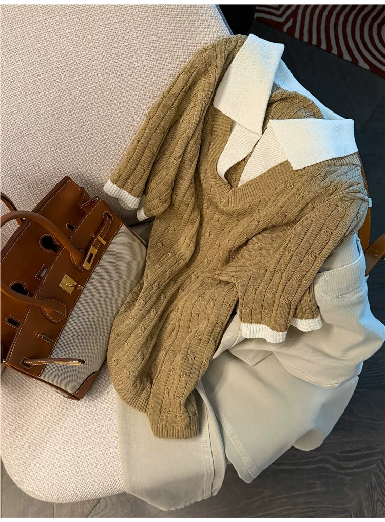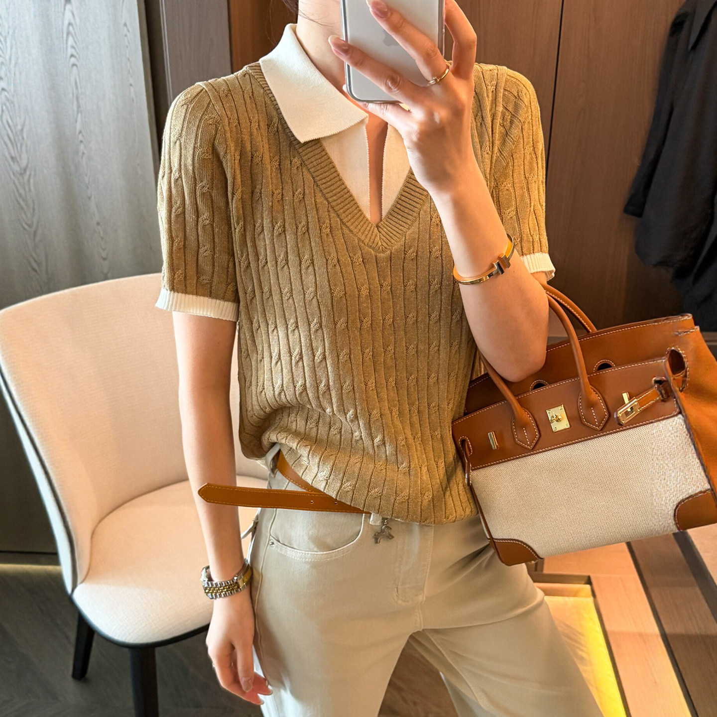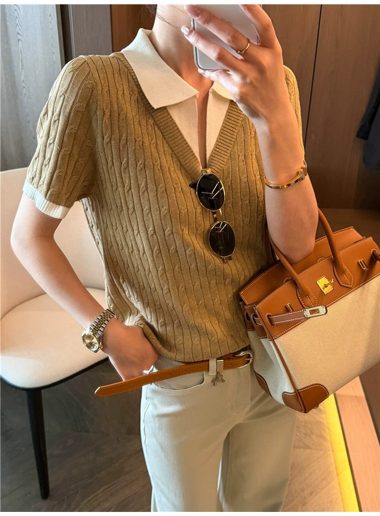한 부서 착용 가져 가라. 낙타 스카프 V넥 니트 반팔 티셔츠 여성 여름 고급 센스 품격 긍정적 인 어깨 작은 맨위