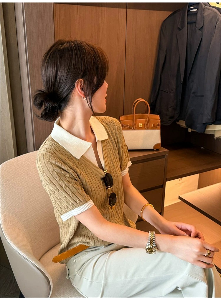 오래된 돈 바람 착용 가져 가라. POLO 칼라 긍정적 인 어깨 반팔 니트 오픈 가디건 여성 여름 외부 가져 가라. 홀로우 아웃 얇은 스타일 아니요 명중 섹션 맨위