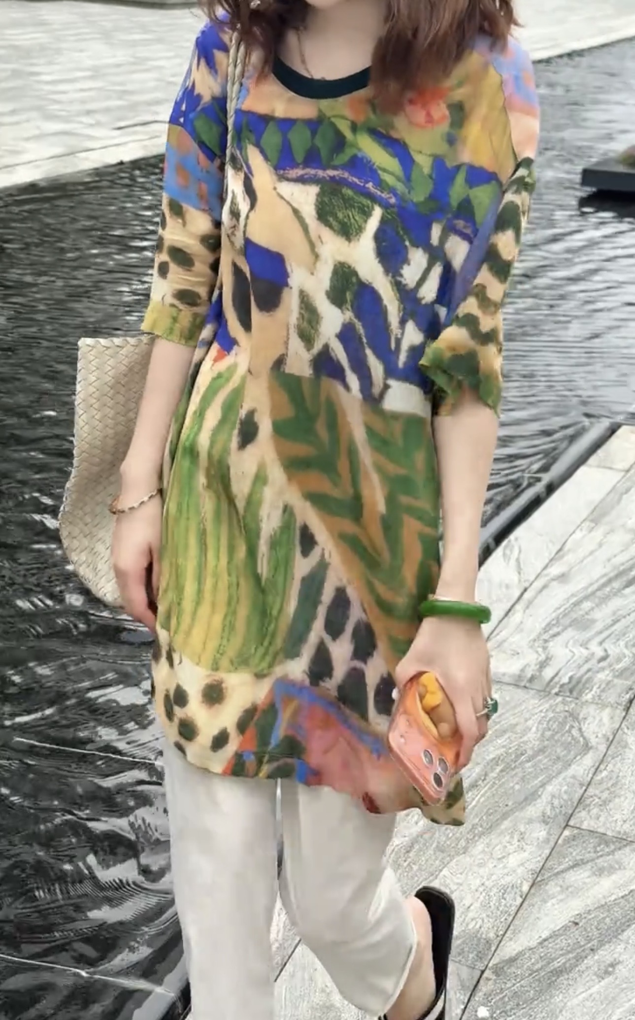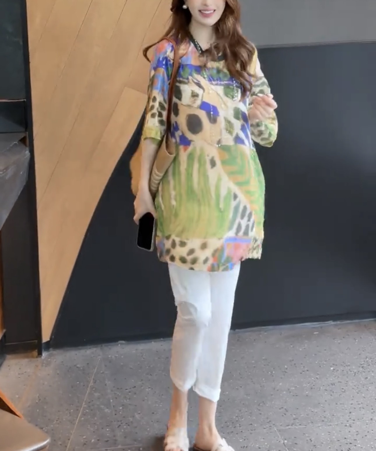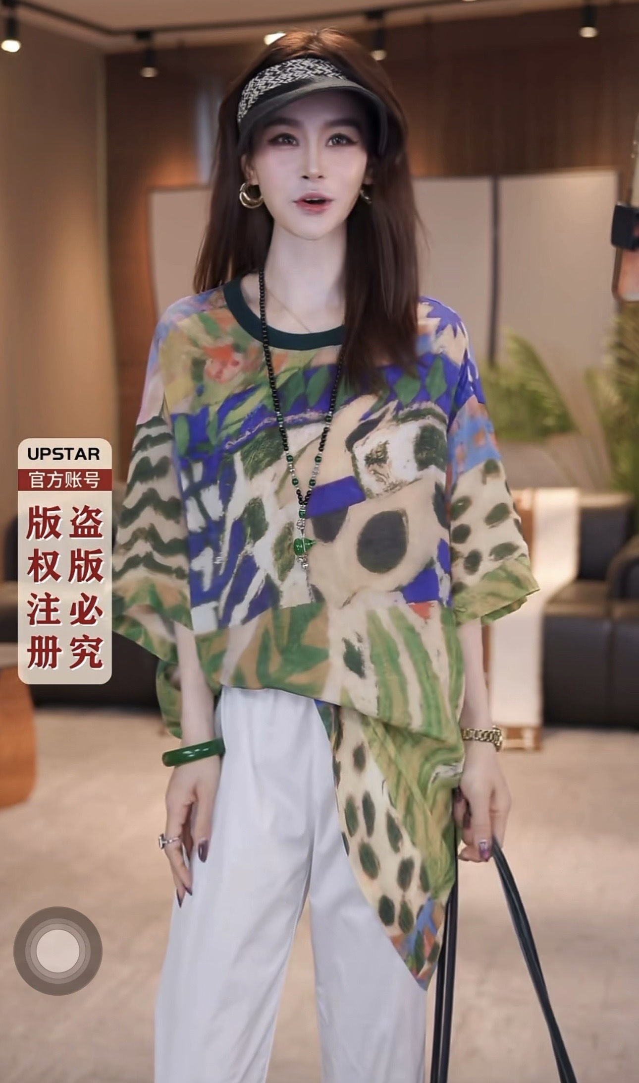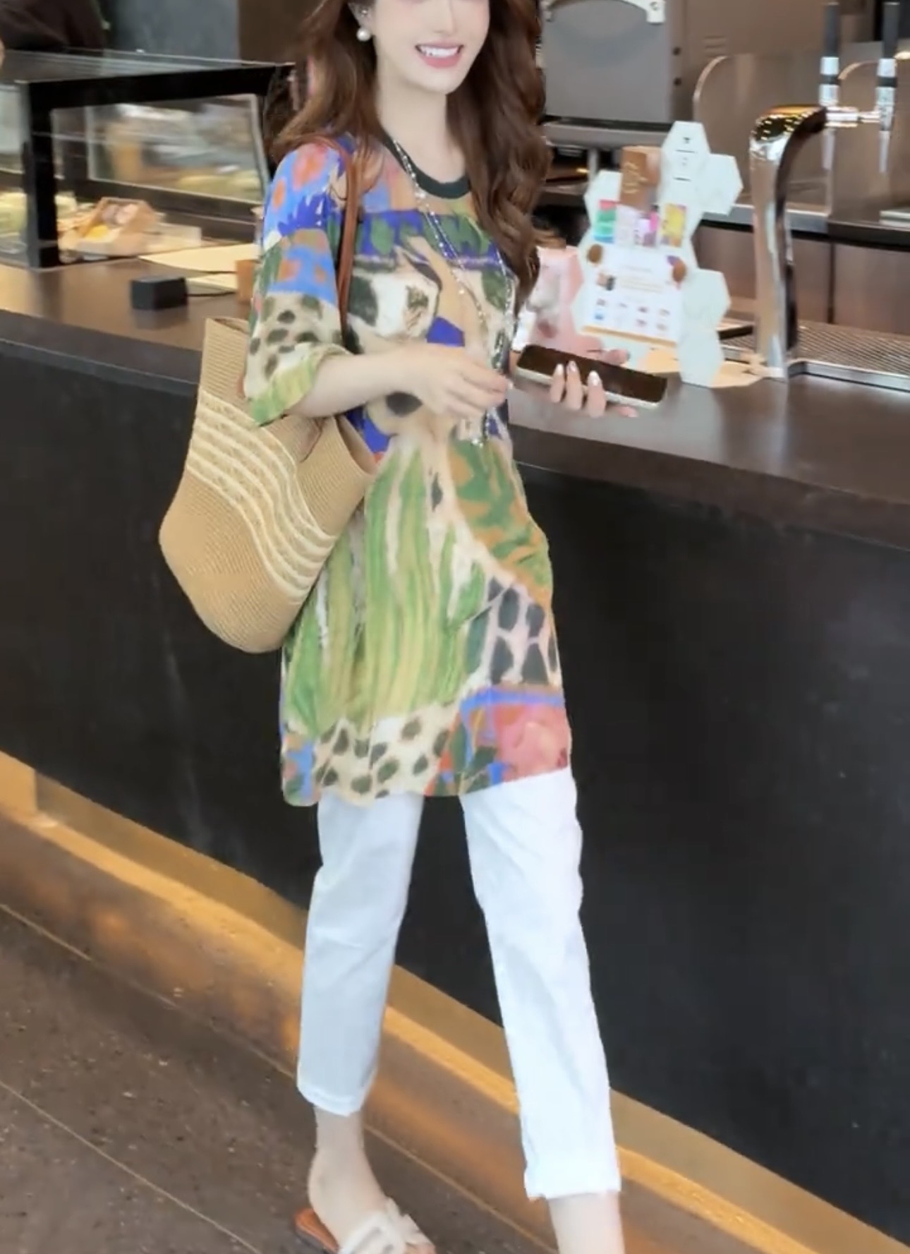 프랑스식 예술 센스 추상 프린트 라운드 넥 중간 소매 티셔츠 여성 여름 얇은 스타일 슬림해 보이는 품격 맨위