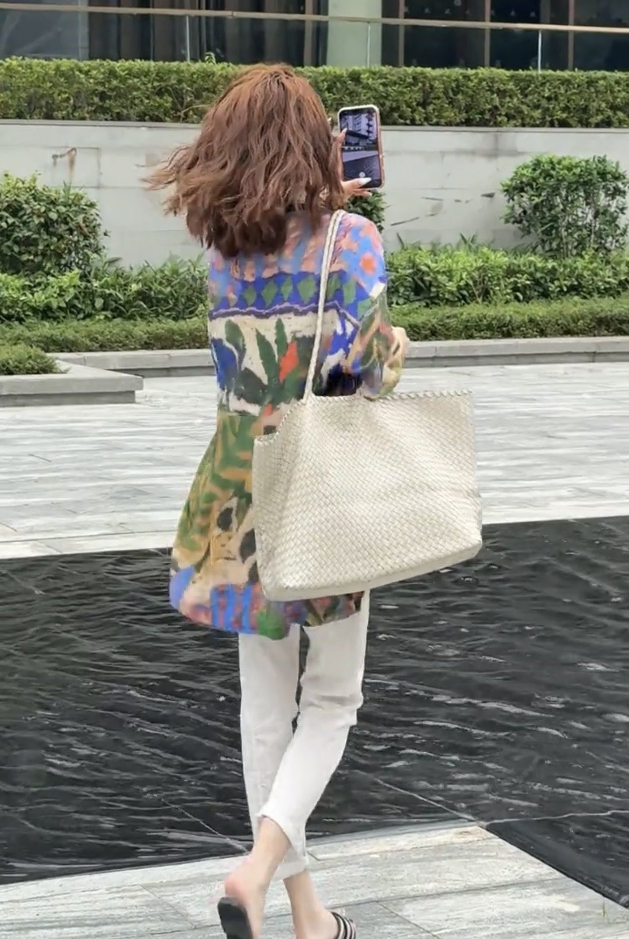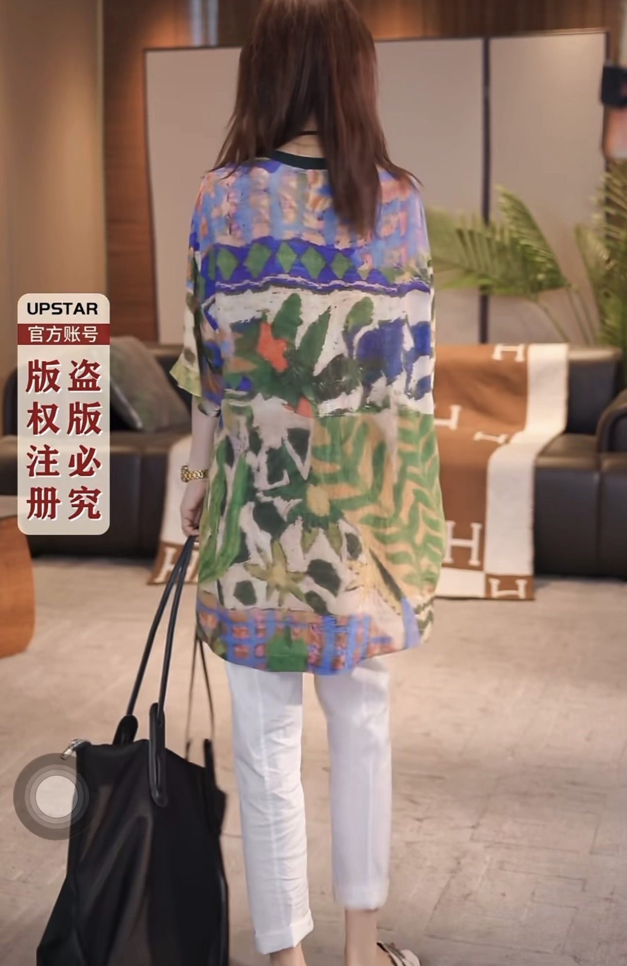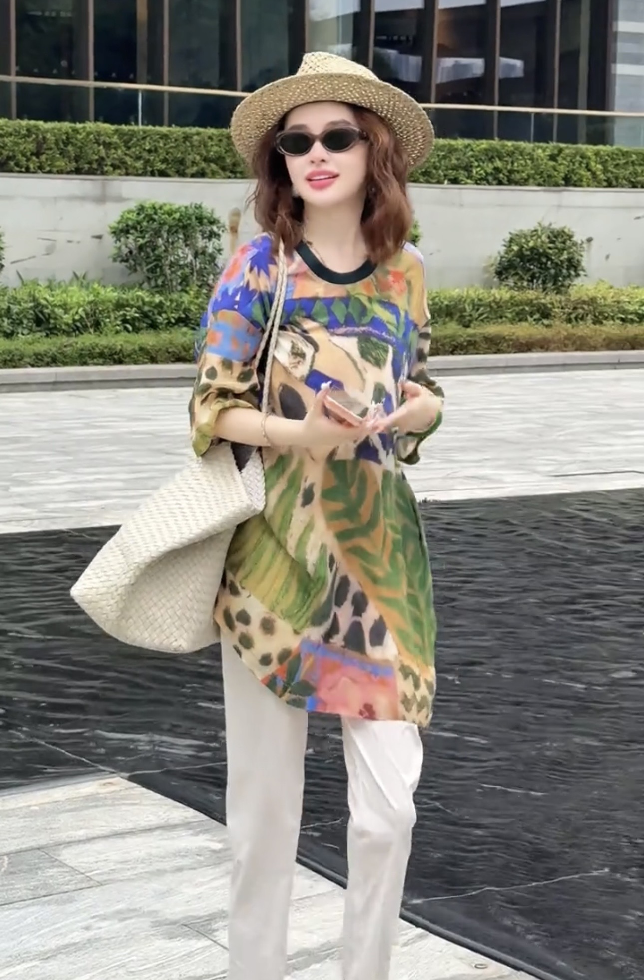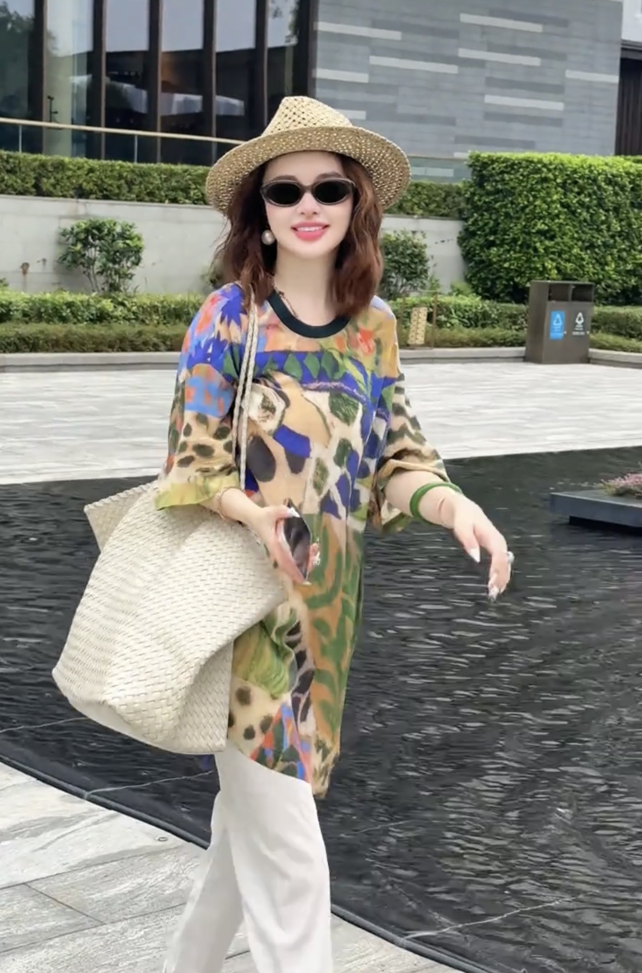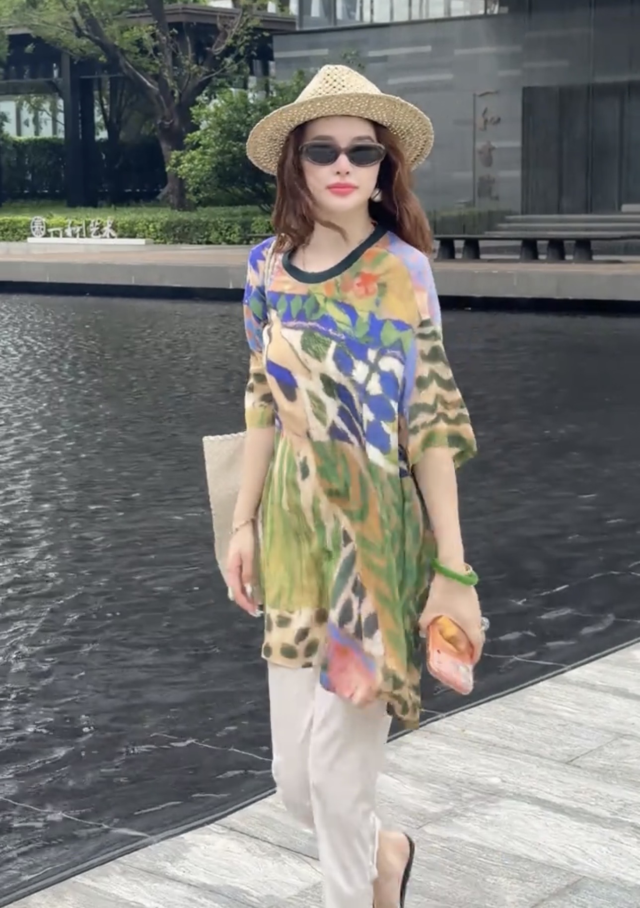 프랑스식 예술 센스 추상 프린트 라운드 넥 중간 소매 티셔츠 여성 여름 얇은 스타일 슬림해 보이는 품격 맨위