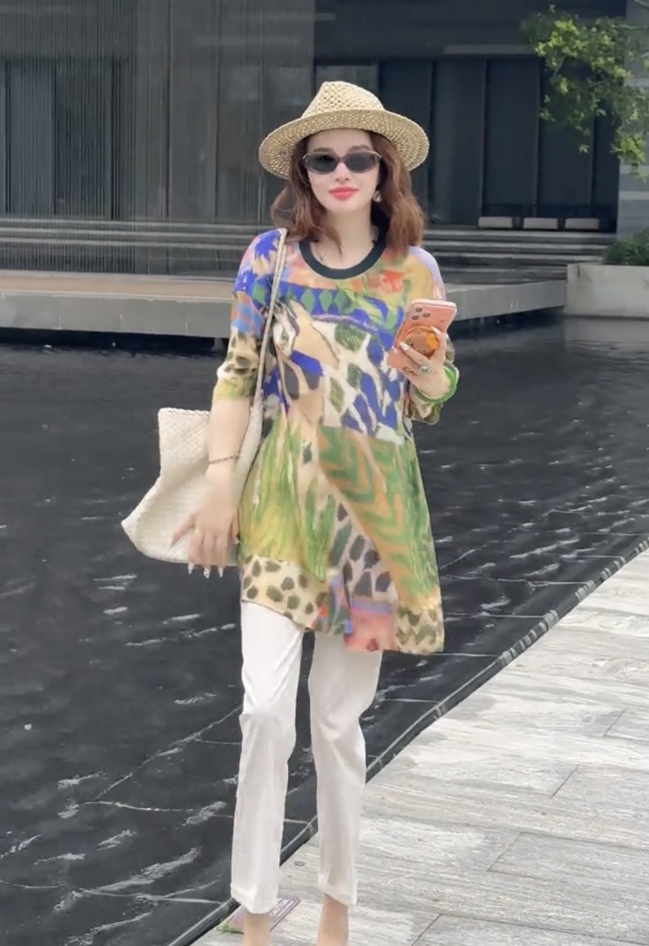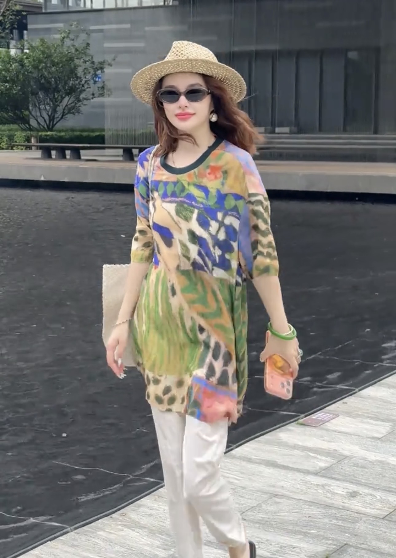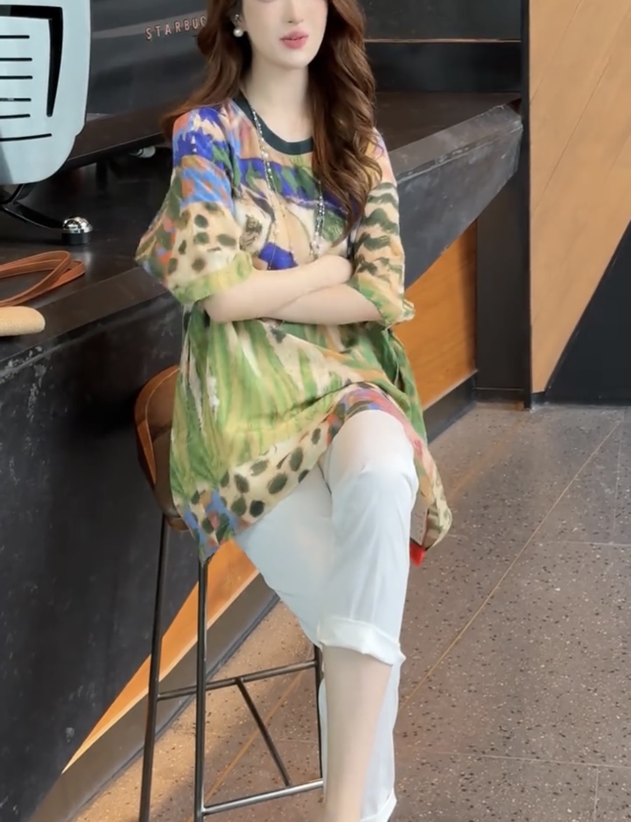 프랑스식 예술 센스 추상 프린트 라운드 넥 중간 소매 티셔츠 여성 여름 얇은 스타일 슬림해 보이는 품격 맨위