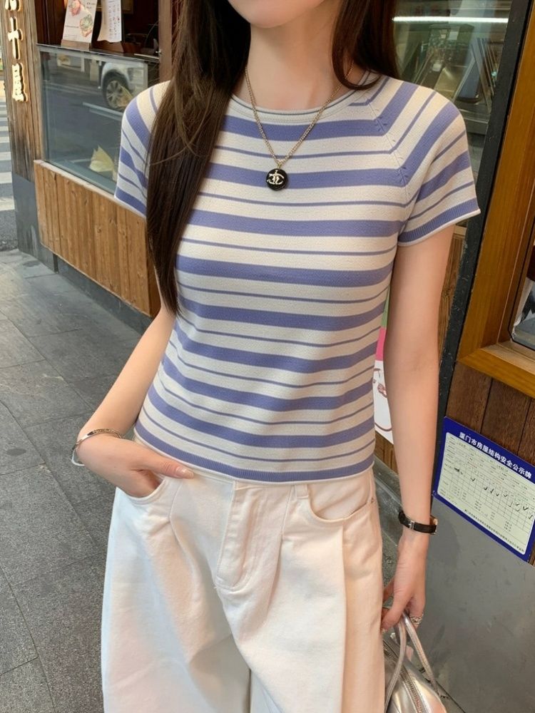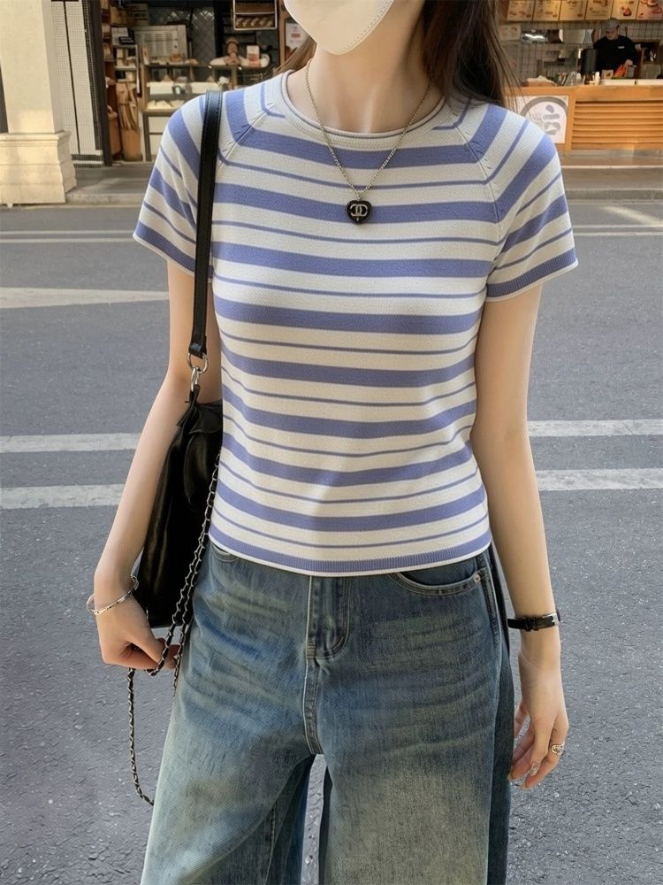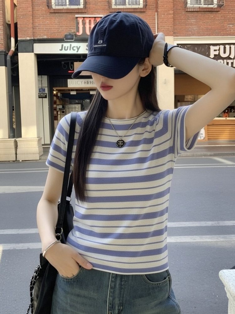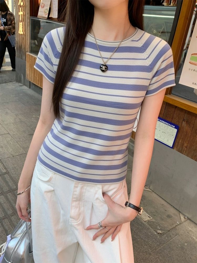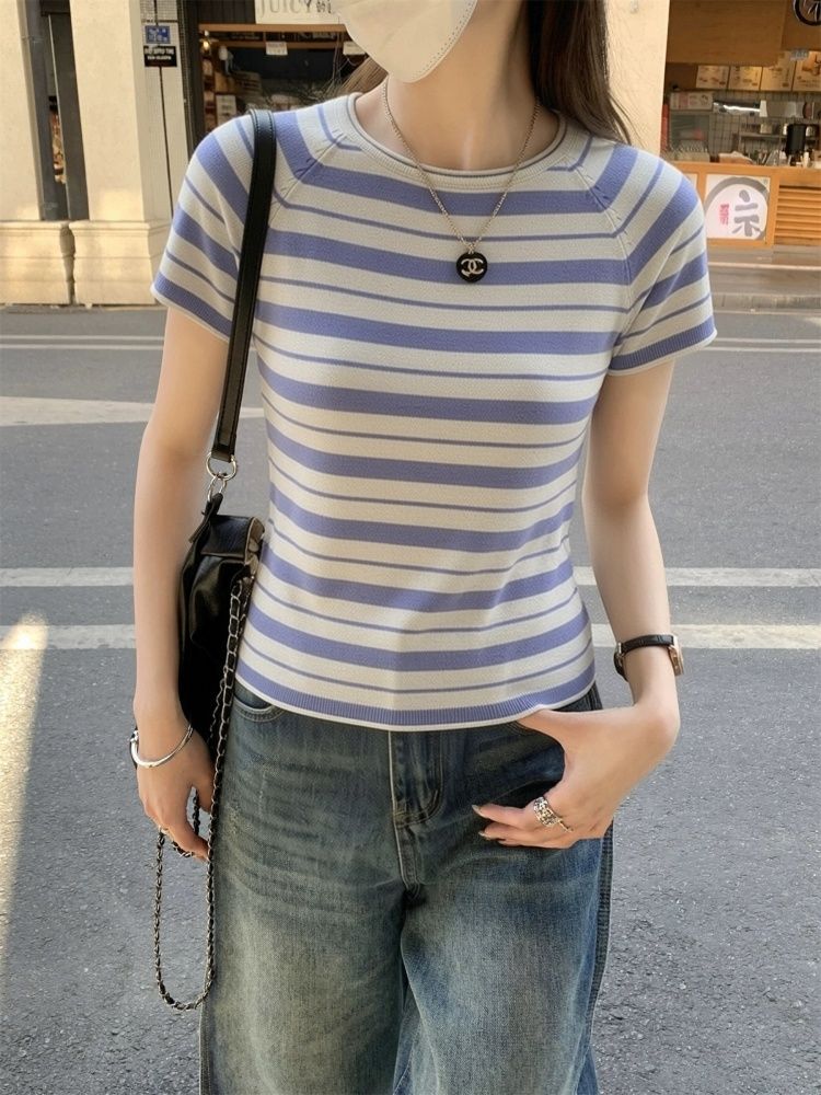한 부서 chic 블루 회색 스트라이프 니트 반팔 여성 2026 새로운 품격 부드러운 바람 몸매 가꾸기 슬림해 보이는 티셔츠 맨위