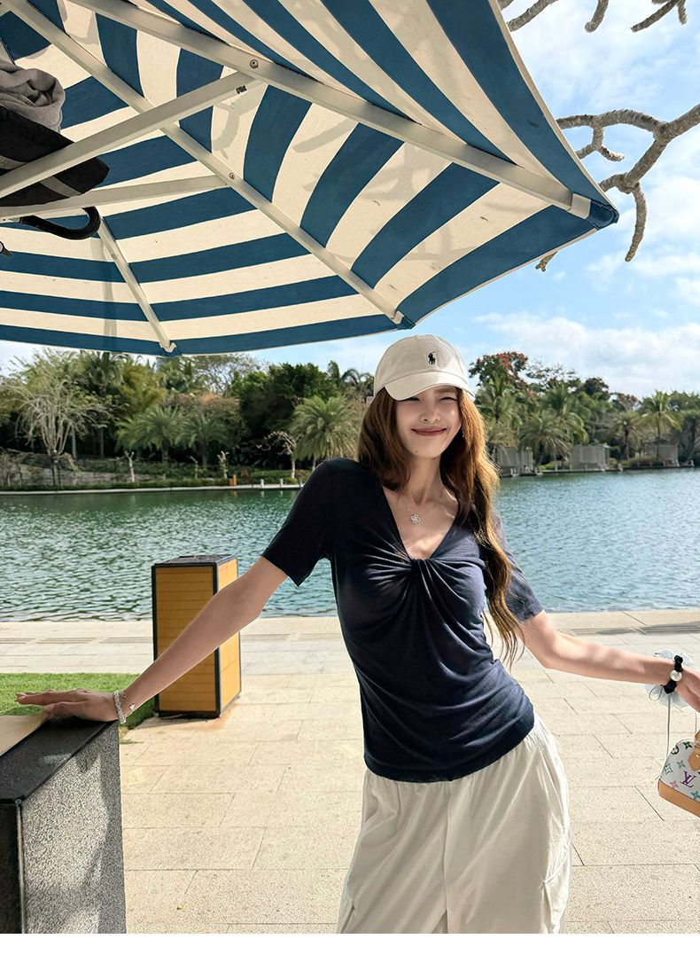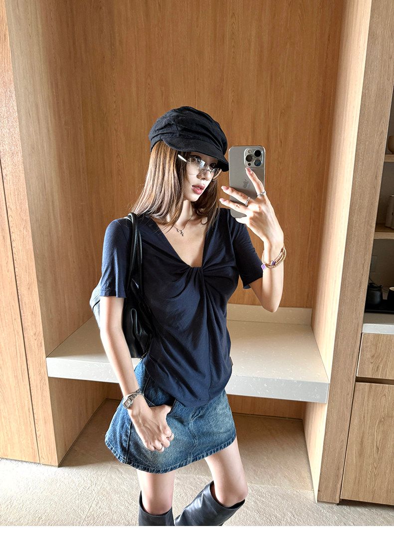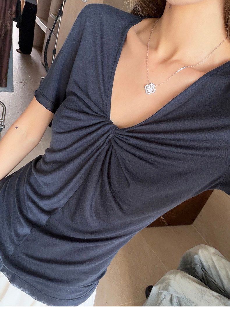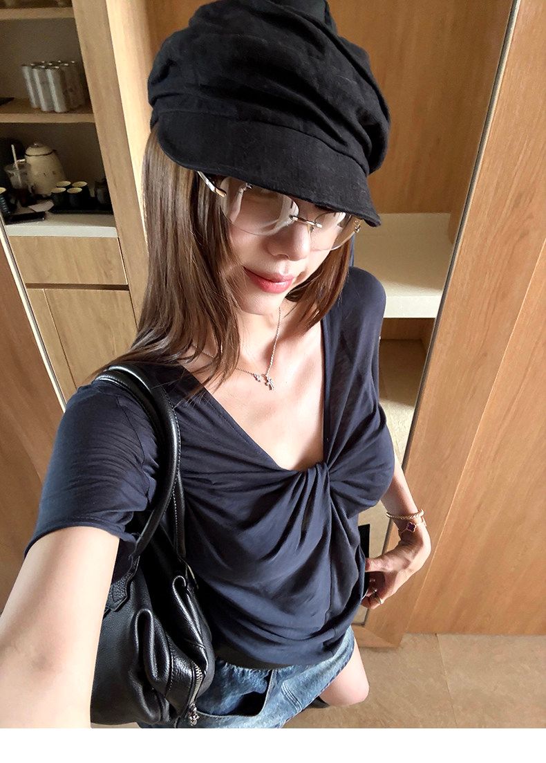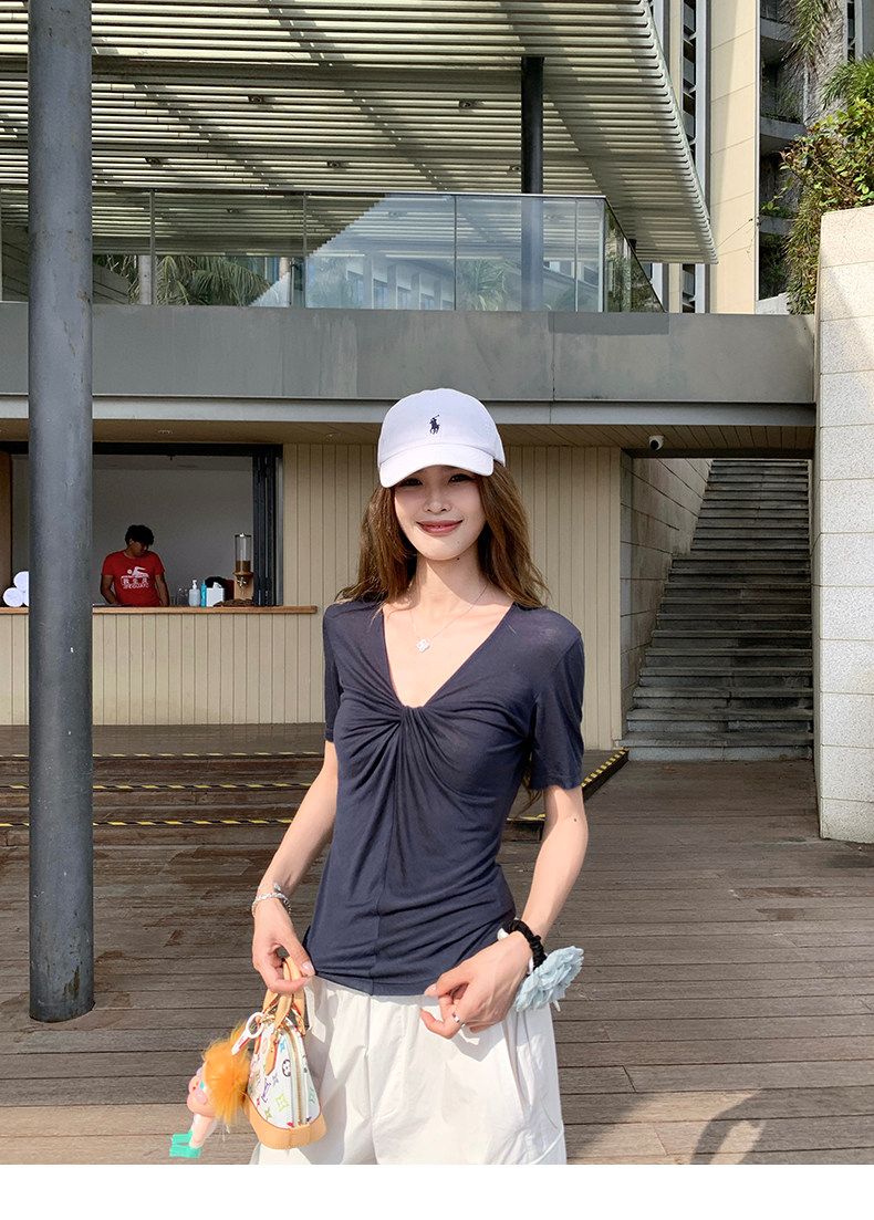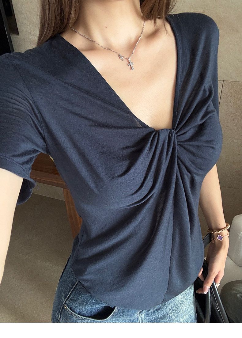 실사 정가 회색 V넥 불규칙 긍정적 인 어깨 반팔 티셔츠 여성 여름 디자인 센스 작은 대중 몸매 가꾸기 허리 수축 맨위