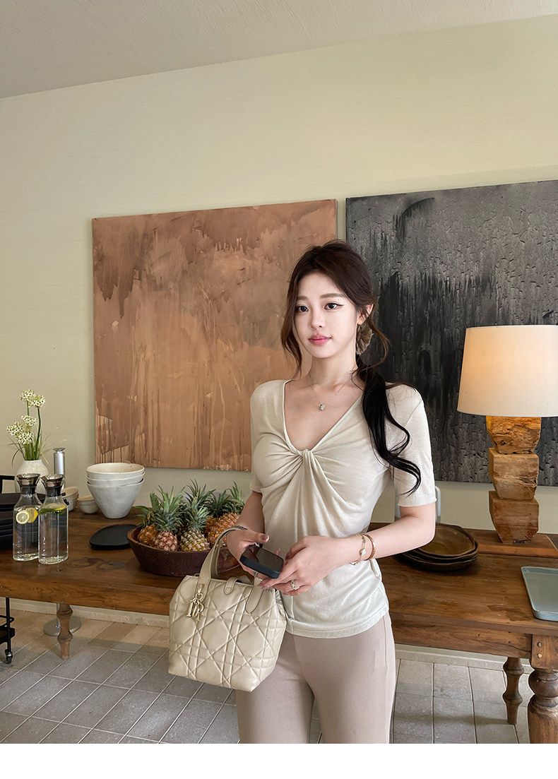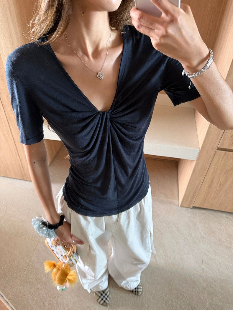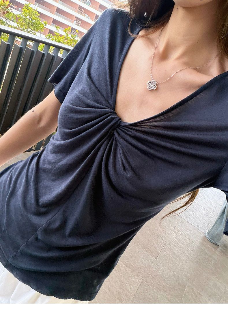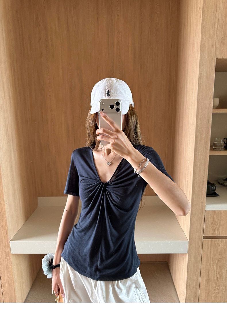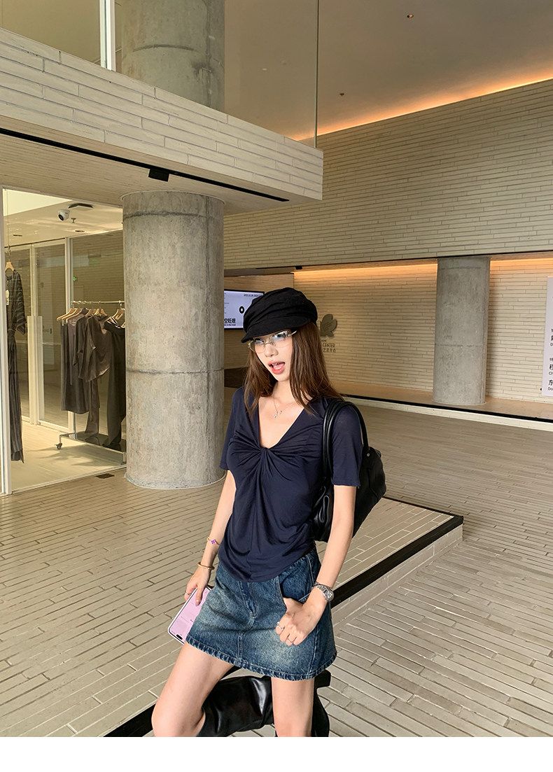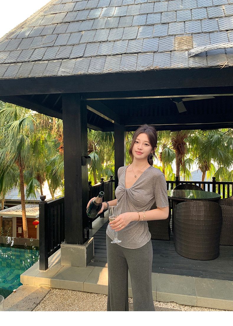 실사 정가 회색 V넥 불규칙 긍정적 인 어깨 반팔 티셔츠 여성 여름 디자인 센스 작은 대중 몸매 가꾸기 허리 수축 맨위