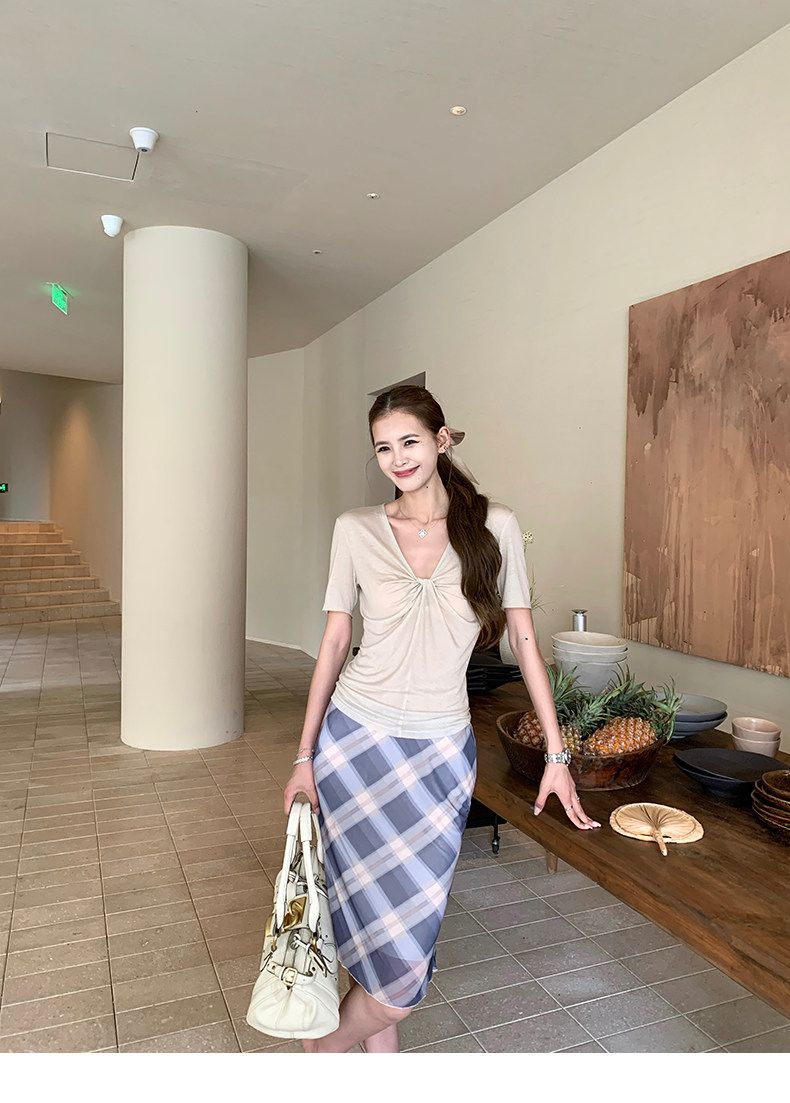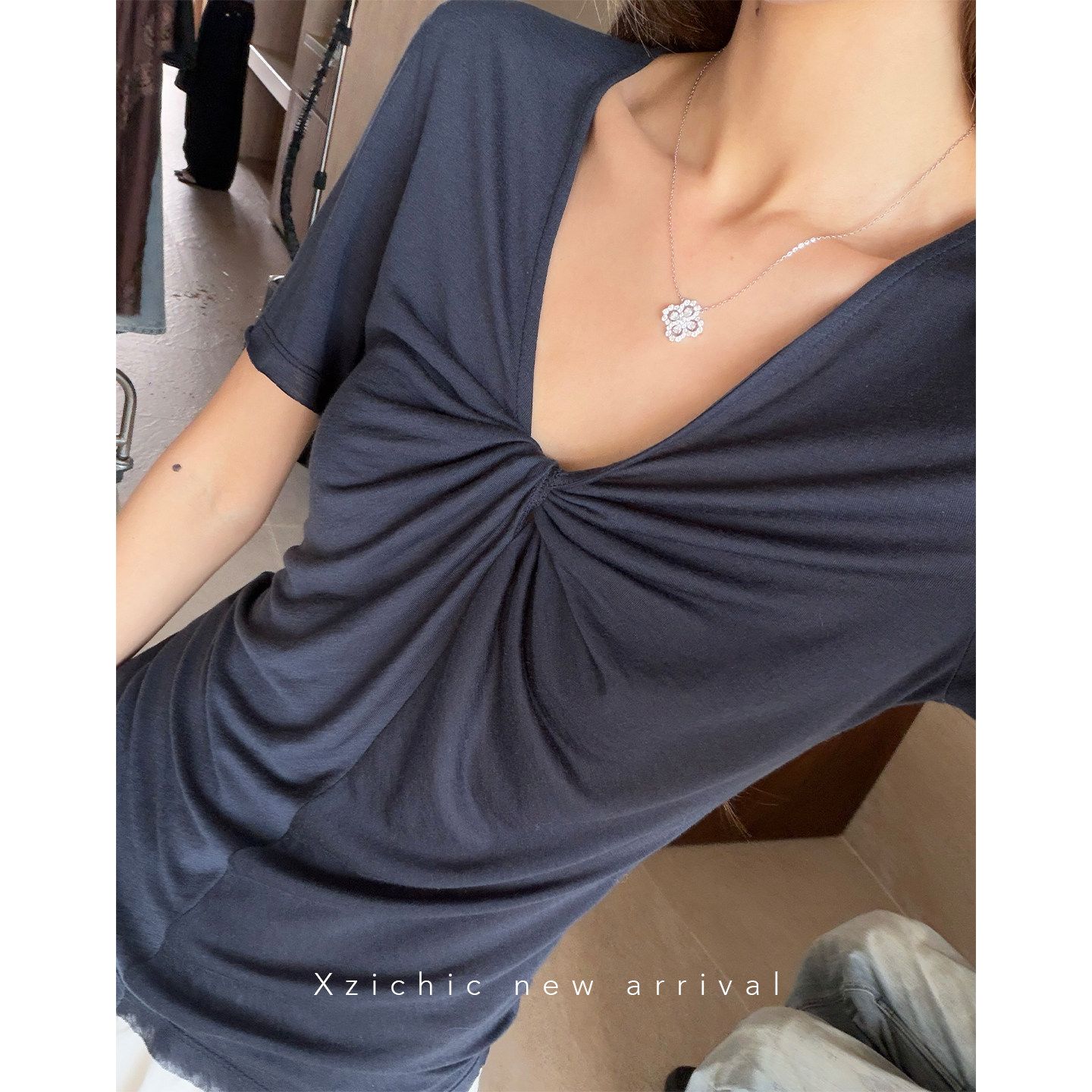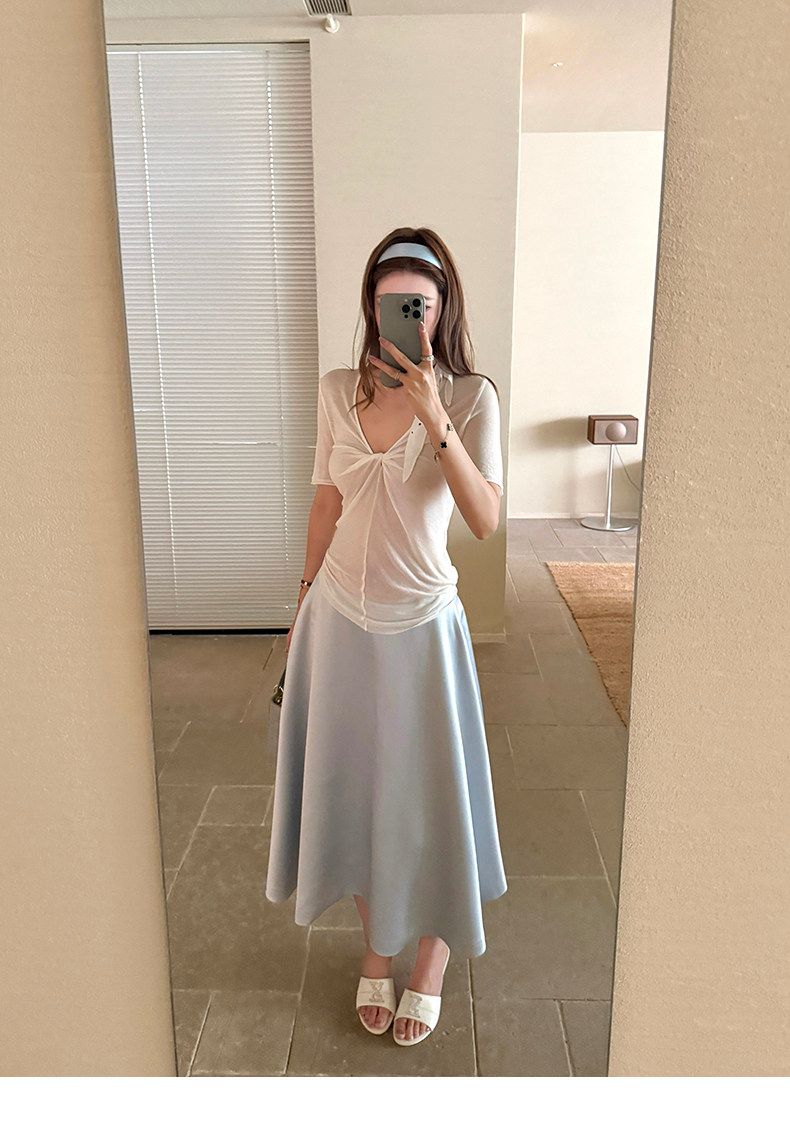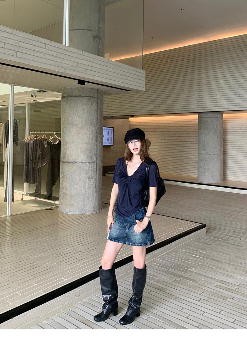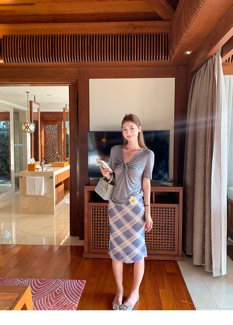 실사 정가 회색 V넥 불규칙 긍정적 인 어깨 반팔 티셔츠 여성 여름 디자인 센스 작은 대중 몸매 가꾸기 허리 수축 맨위