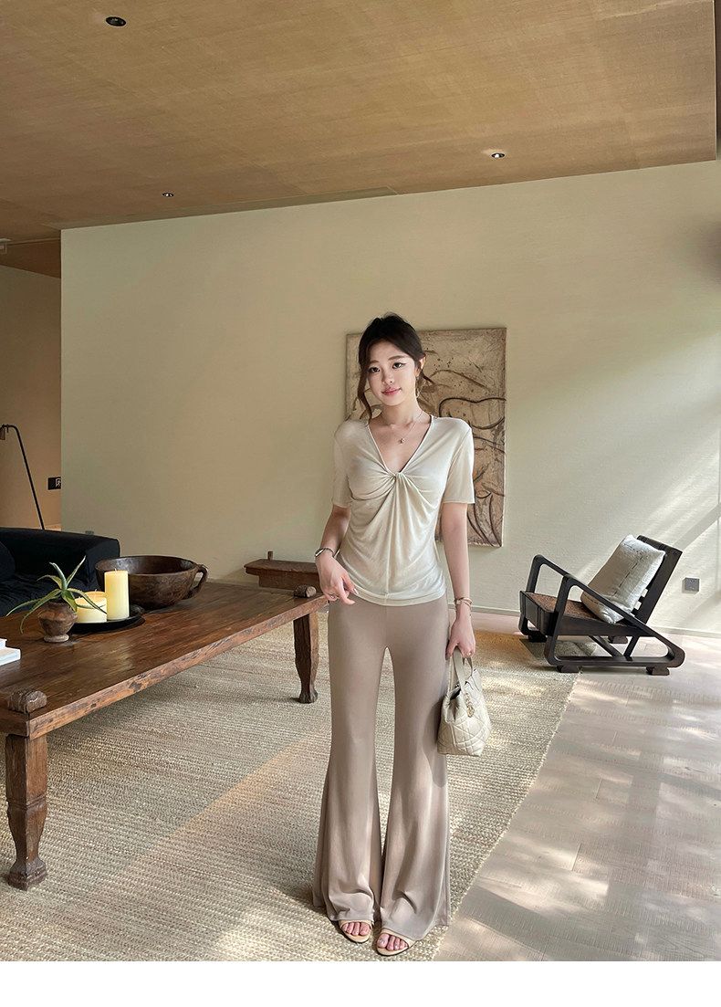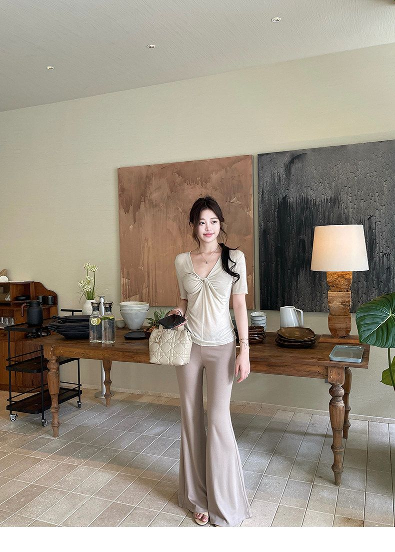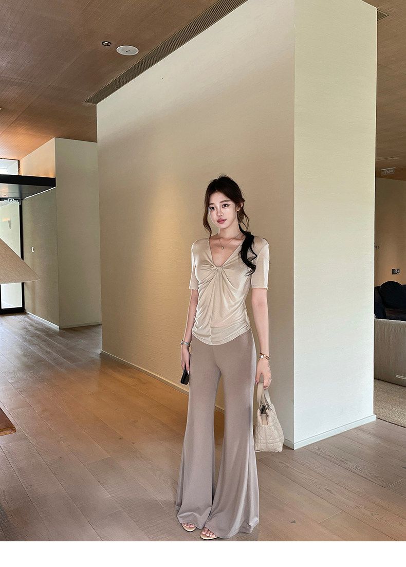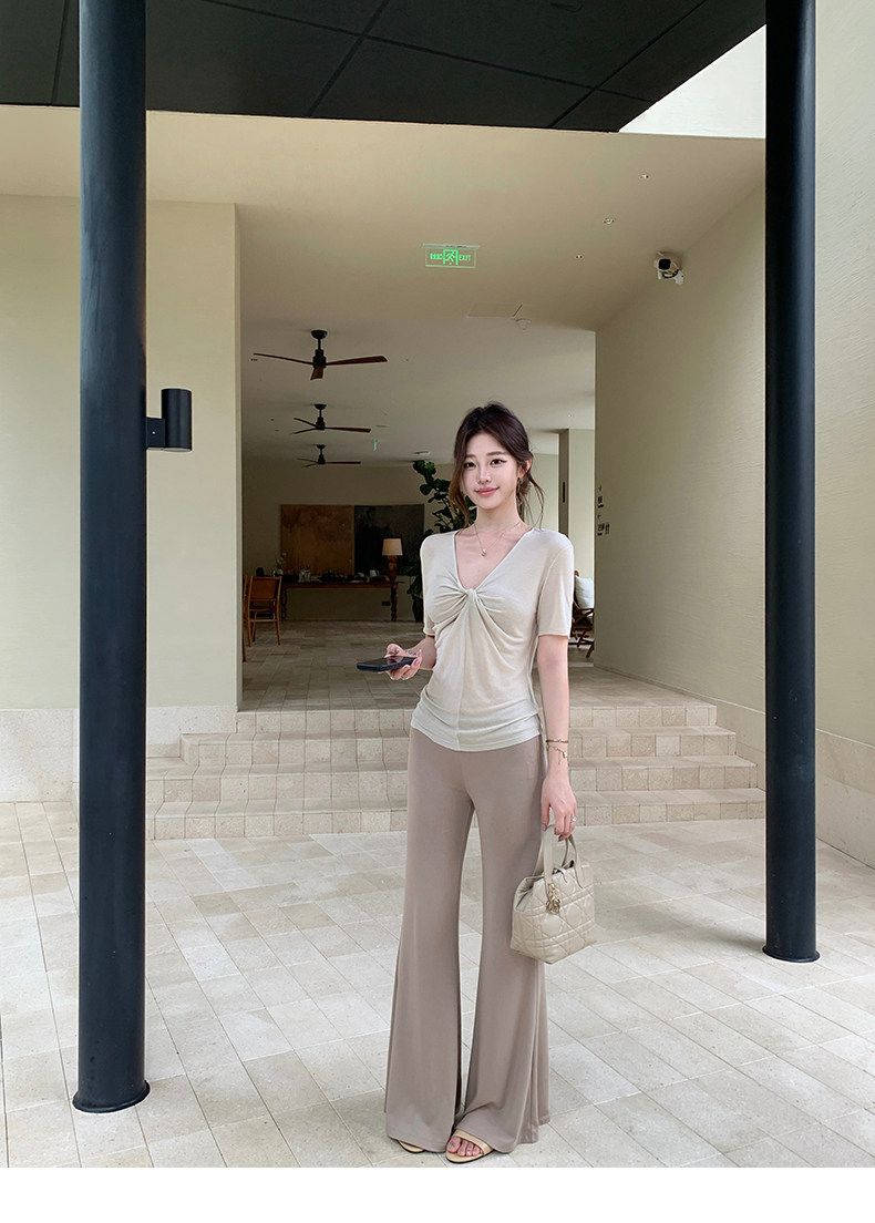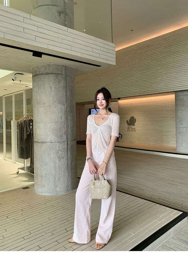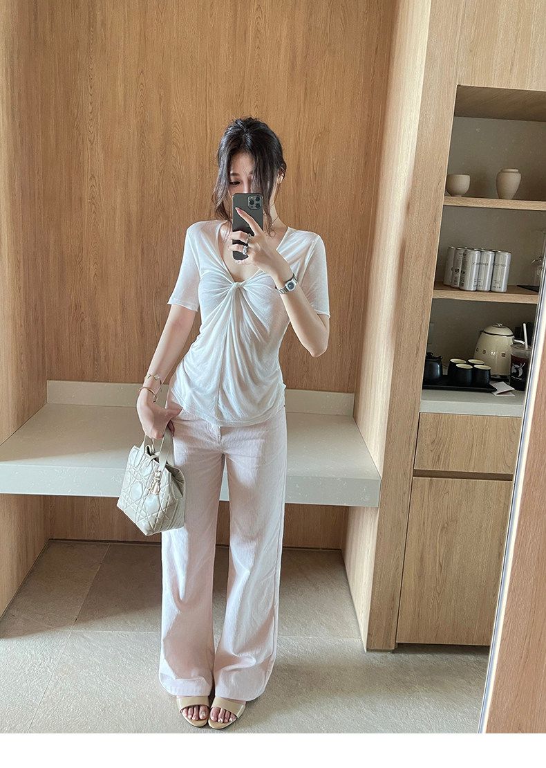 실사 정가 비스듬한 칼라 오프숄더 핫걸 반팔 티셔츠 스트레이트 캐주얼 와이드 레깅스 바지 여름 새로운 패션 세트