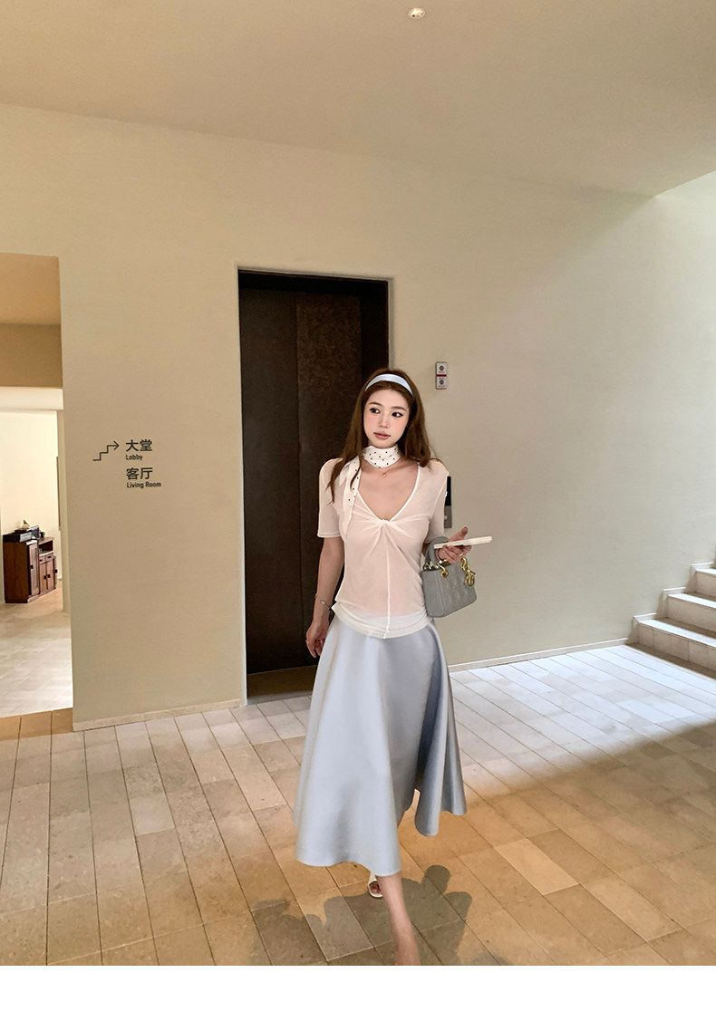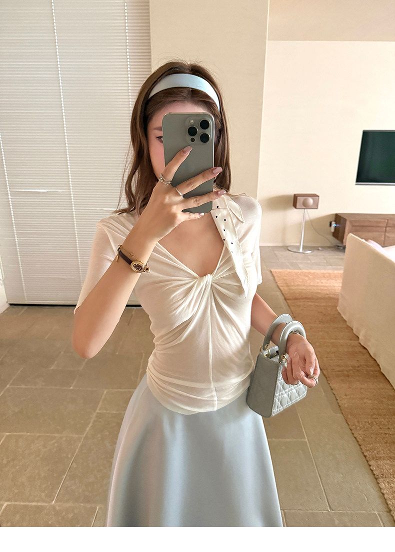 프랑스식 부드러운 레이스 조각 V넥 프릴 얼음 실크 반팔 여름 새로운 맨위 고급 센스 몸매 가꾸기 티셔츠 여성