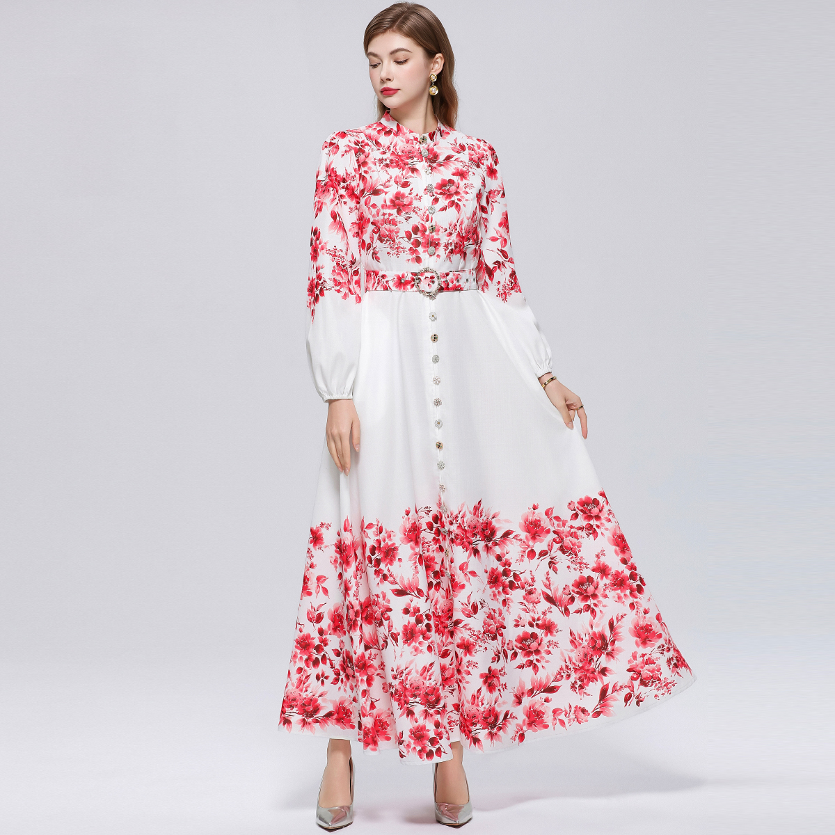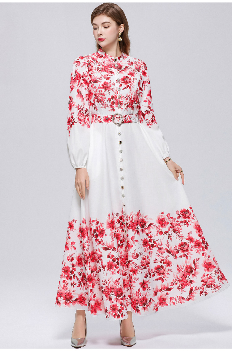 출퇴근 바람 레트로 프린트 스탠드 칼라 싱글 줄 버튼 긴팔 치마 허리 수축 큰 진자 드레스 벨트 포함