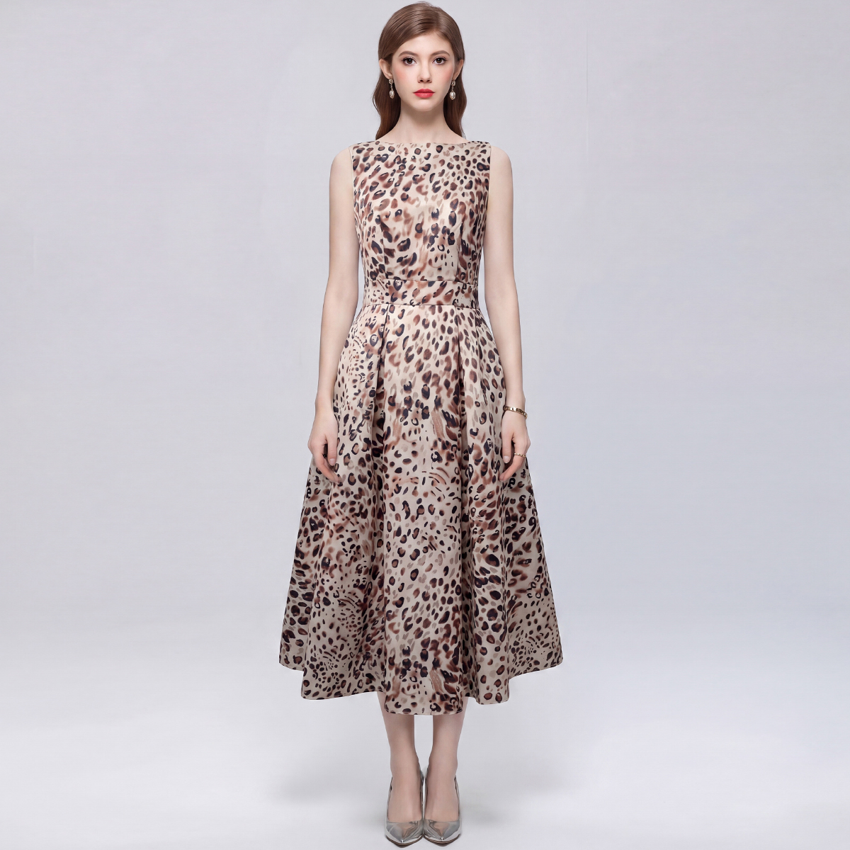 프랑스식 고급 센스 민소매 프린트 하이웨이스트 드레스 3 차원 자르기 허리 수축 A라인 스커트