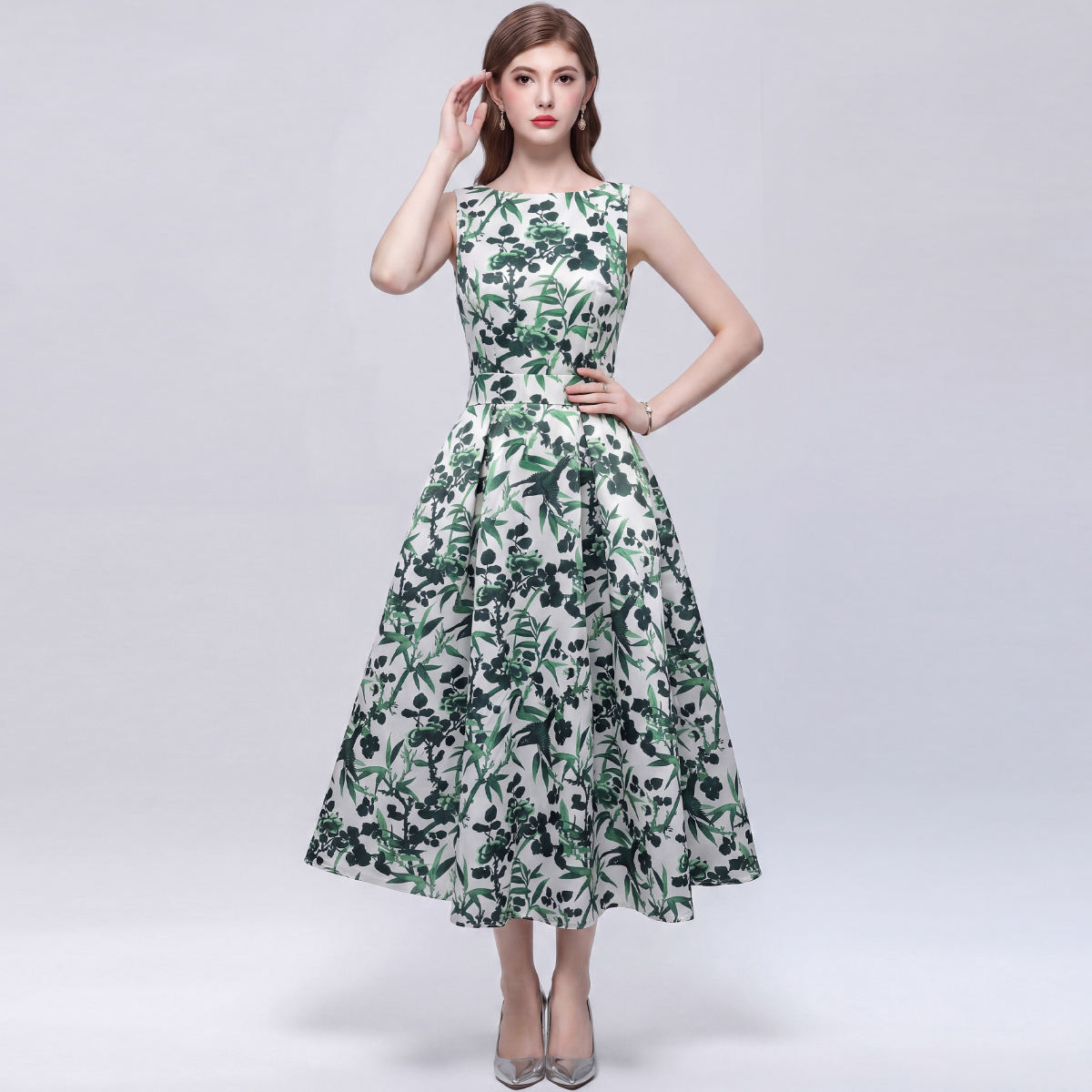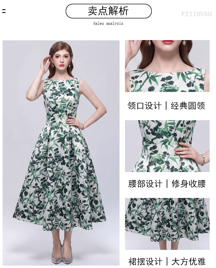 프랑스식 고급 센스 민소매 프린트 하이웨이스트 드레스 3 차원 자르기 허리 수축 A라인 스커트