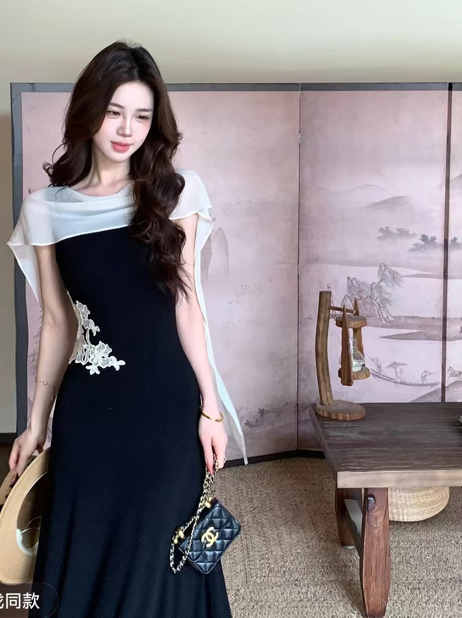 잉크 실 숙박 화이트 새로운 중식 자수 몸매 가꾸기 아니요 해체 패치워크 쉬폰 숄 드레스