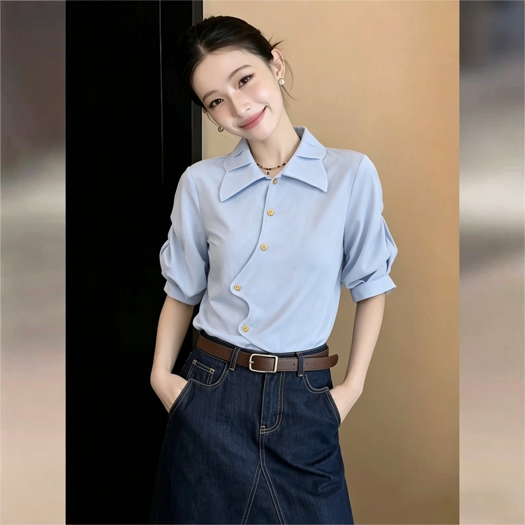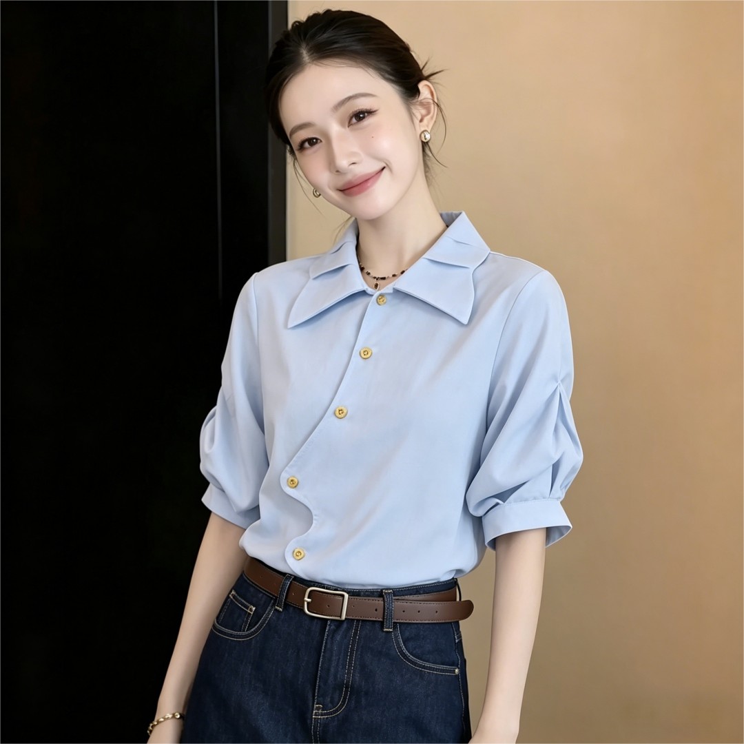 실사 프랑스식 스탠드 칼라 칠보 반팔 티셔츠 스타일 여성 셔츠 2026 여름 빛 요리 한 작은 대중 아니요 명중 섹션 맨위