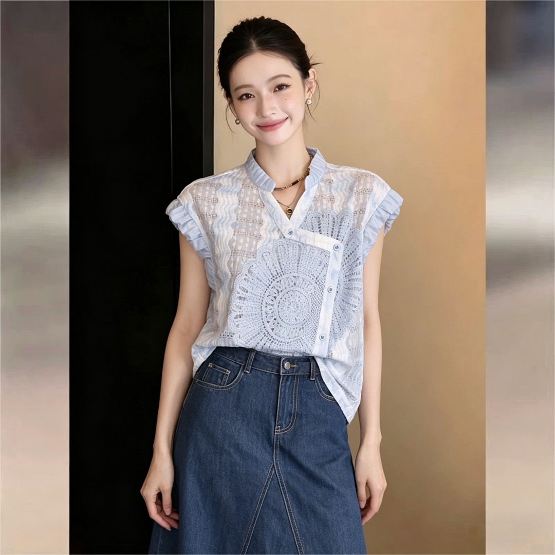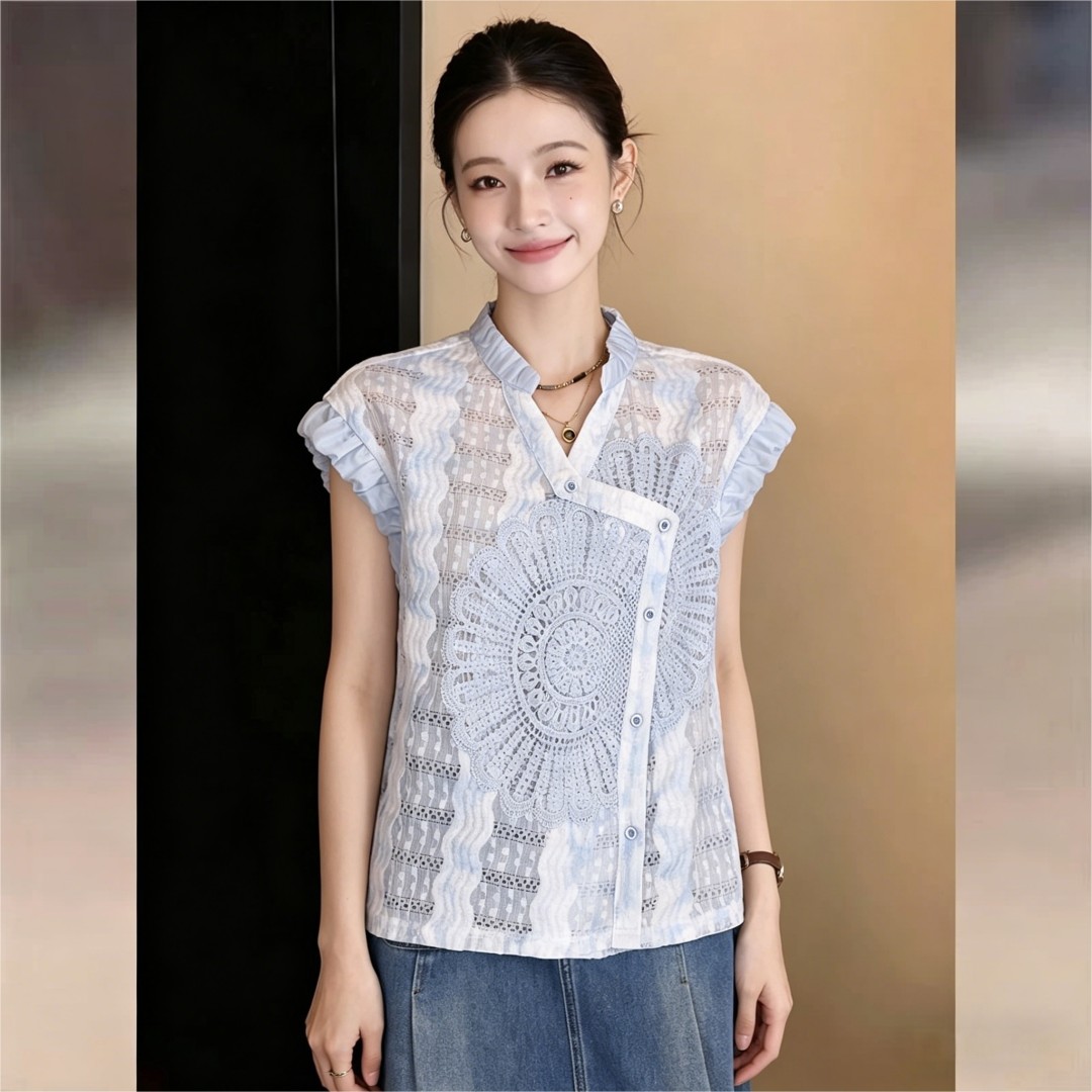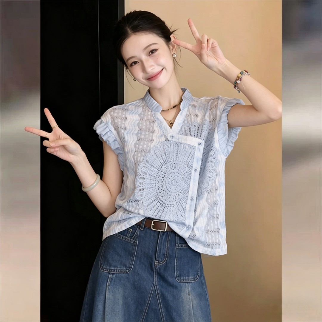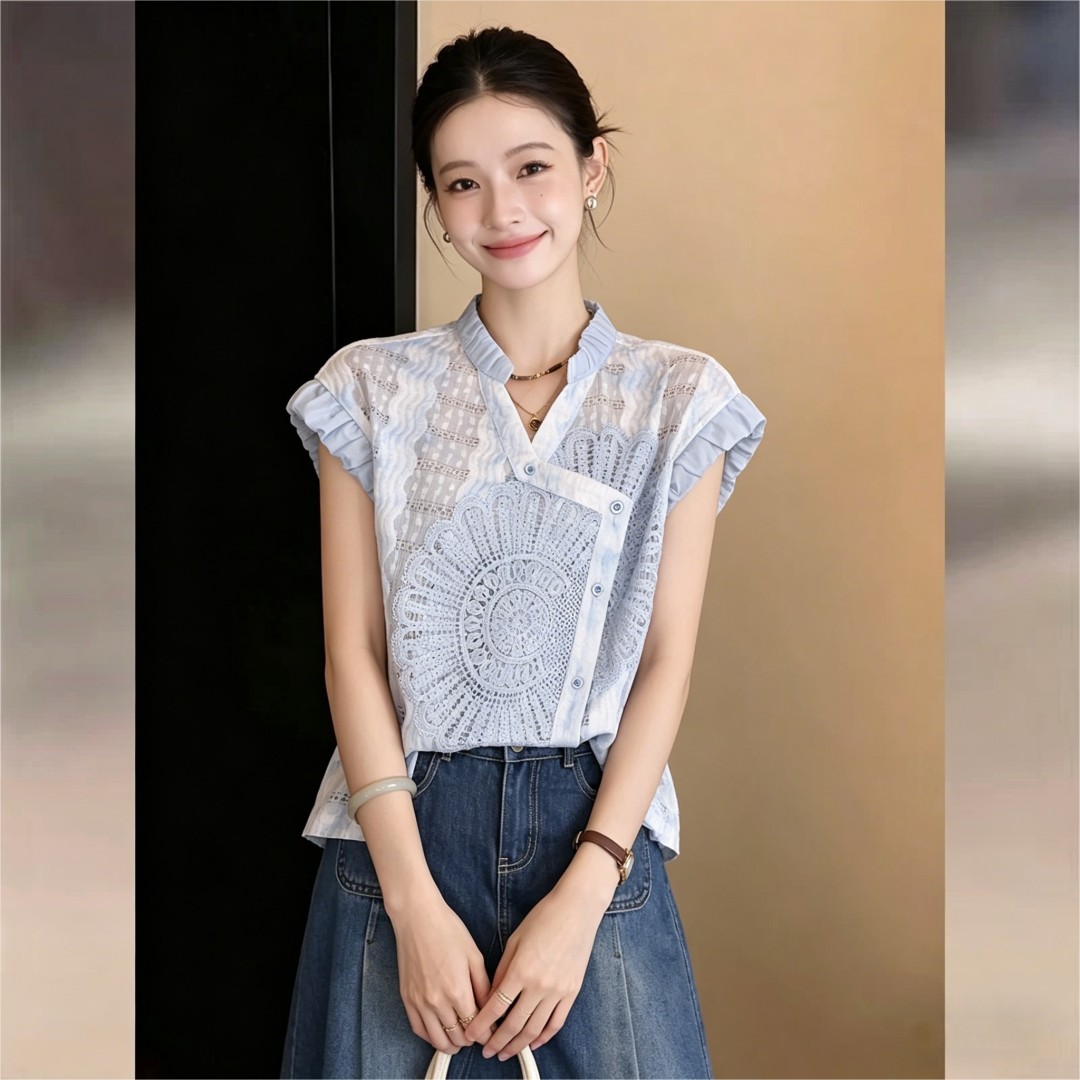 실사 프랑스식 홀로우 아웃 레이스 조각 Feifei 소매 셔츠 여성 2026 여름 새로운 작은 대중 슬림해 보이는 맨위