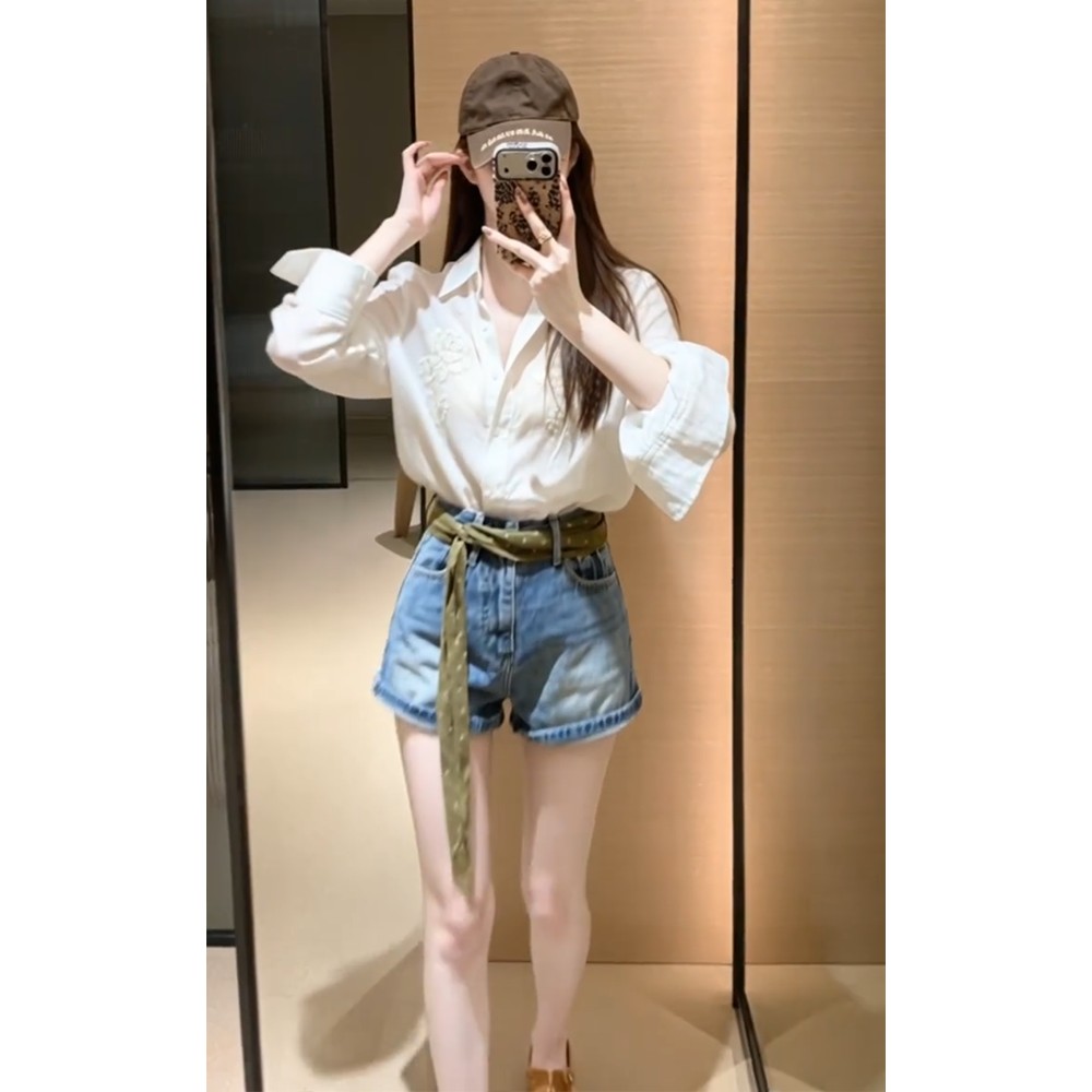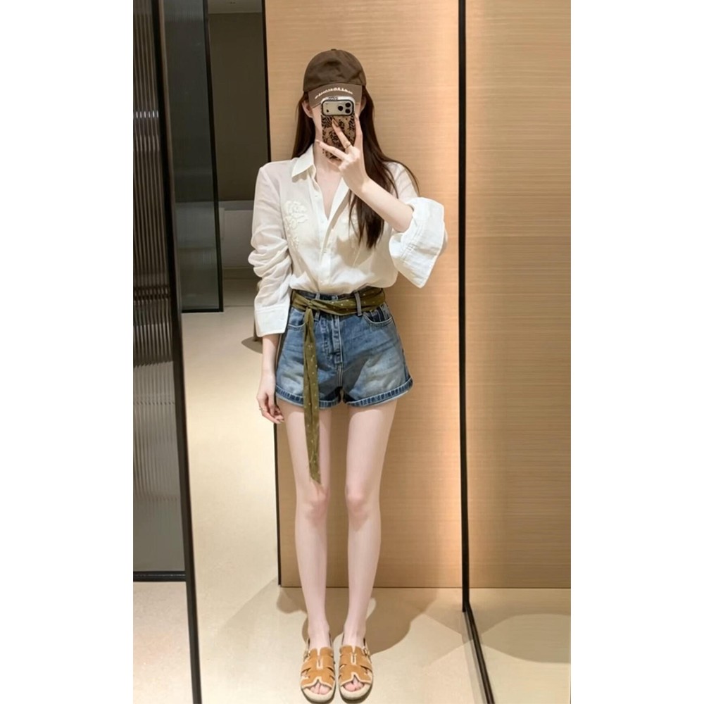 정가 재고 있음 프랑스식 디자인 센스 꽃 자수 셔츠 맨위 여성 하이웨이스트 슬림해 보이는 한 마디 청바지 세트