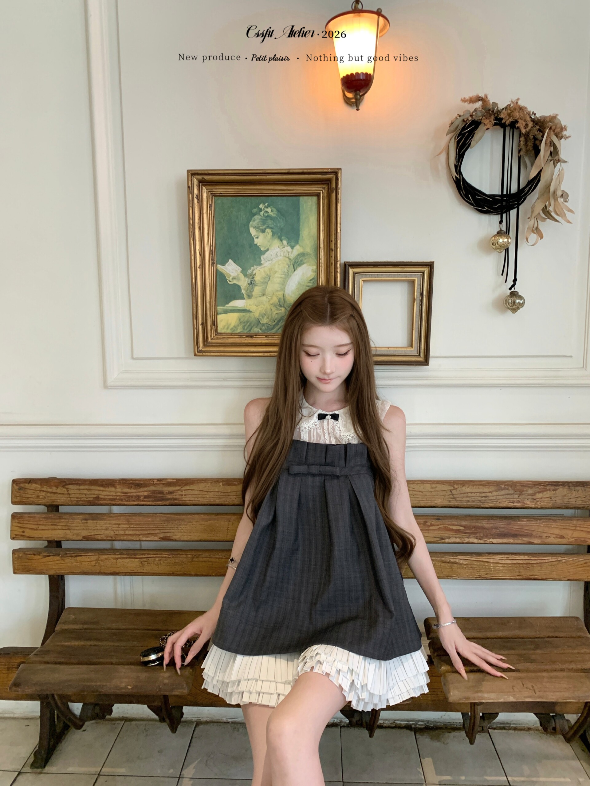 늦게 우산 우산 26 ss 슈퍼 신생 아이돌 배색 피터 팬 칼라 이중 버튼 셔츠 페이크 레이어드 점프 슈트 미니 스커트