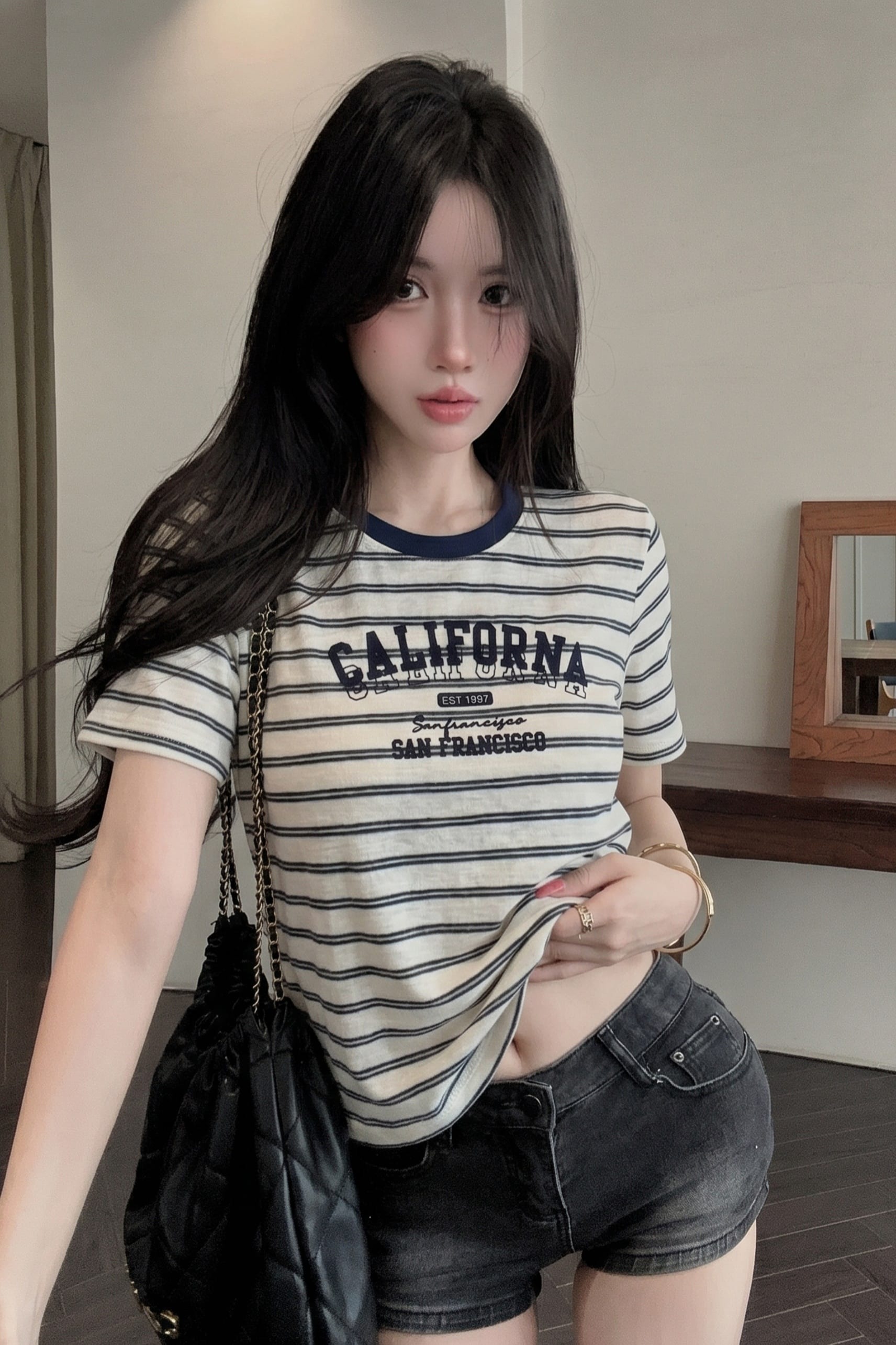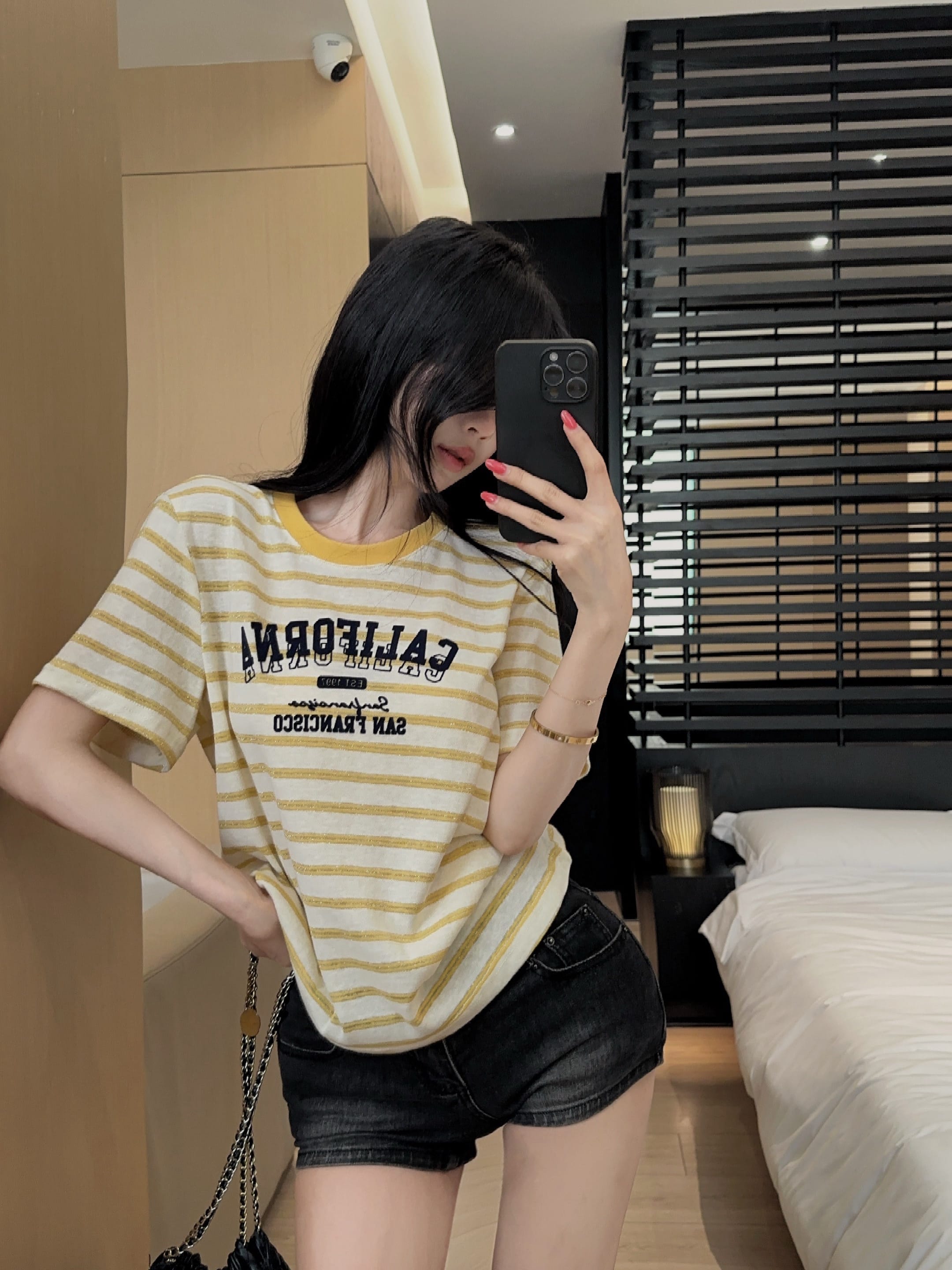 실사 정가 여름 새로운 디자인 센스 알파벳 식물 플러시 스트라이프 라운드 넥 반팔 티셔츠 여성 슬림해 보이는 만나는 맨위