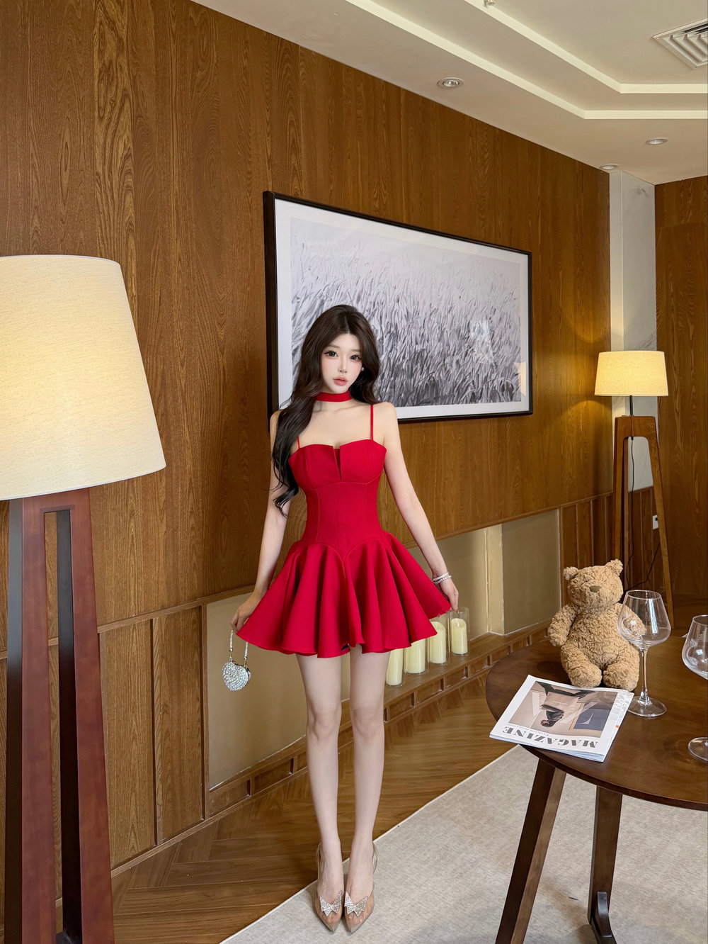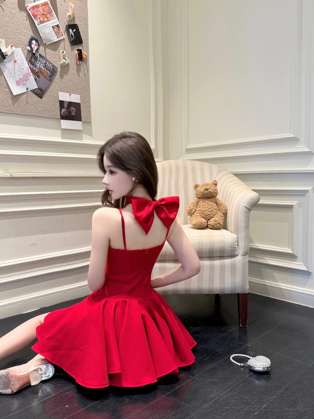 실사 분위기 센스 착용 가져 가라. 빨간색 순수한 욕망 섹시함 핫걸 행침 목 나비 매듭 슬립 퍼프 드레스