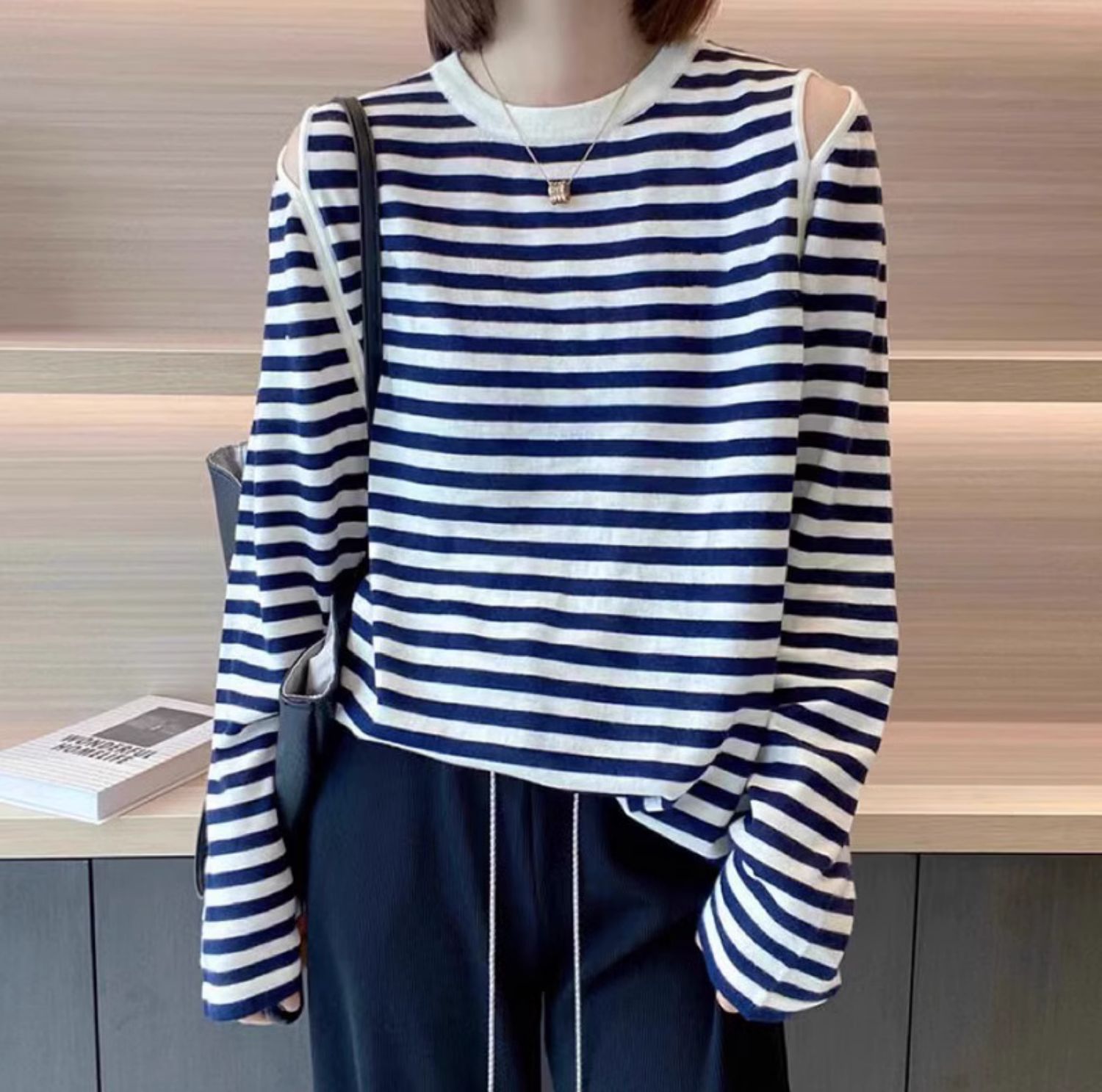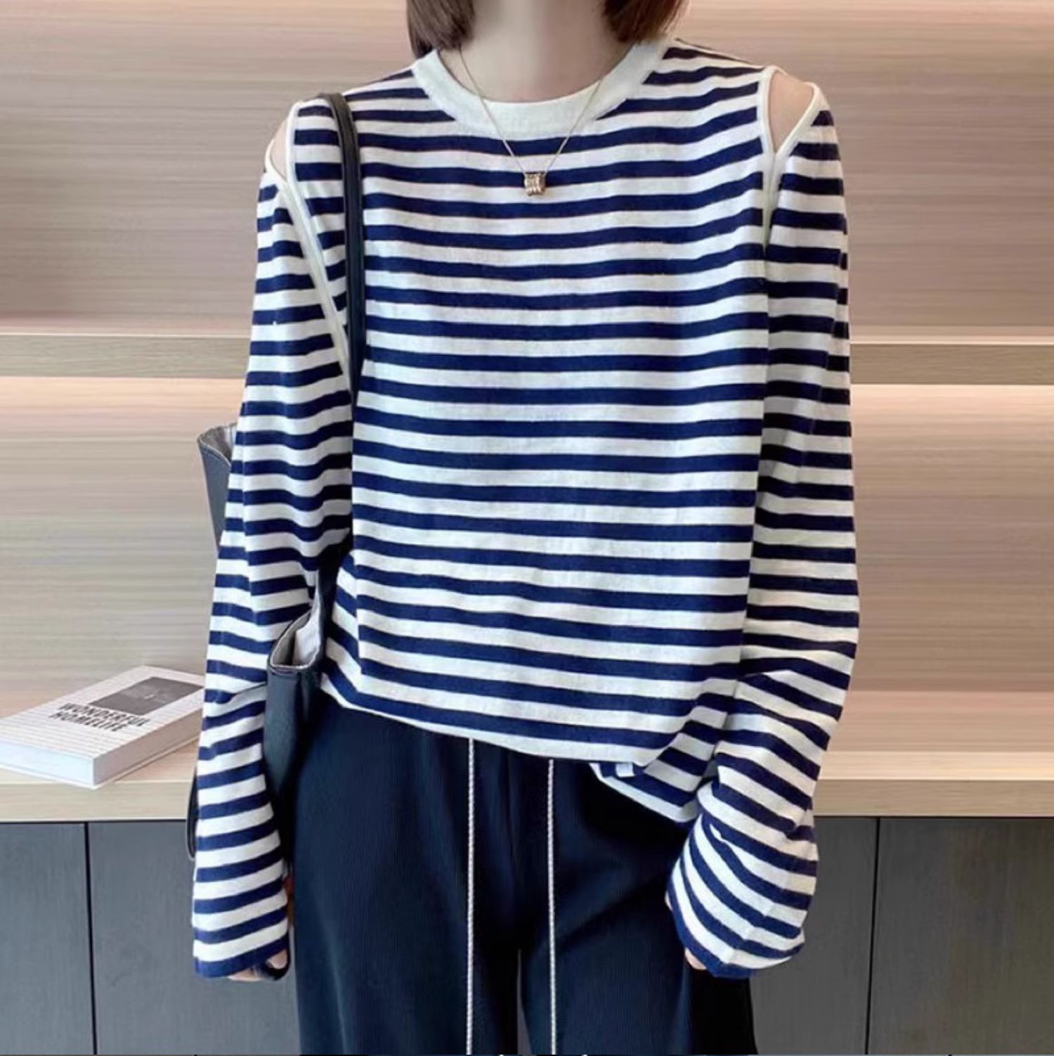 유럽 상품 2026 봄 가을 새로운 루즈핏 오프숄더 흑백 줄무늬 긴팔 티셔츠 여성 얇은 스타일 얼음 실크 니트 스웨터 맨위