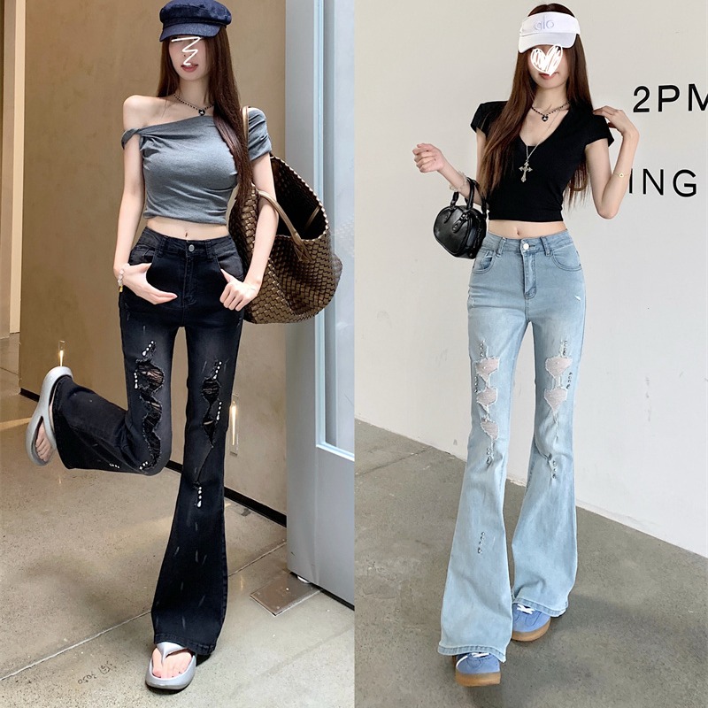 실사 정가 검정색 하이웨이스트 부츠컷 청바지 가을 폭발 핫픽스 찢어진 부분 바지 몸매 가꾸기 슬림해 보이는 나팔 바지