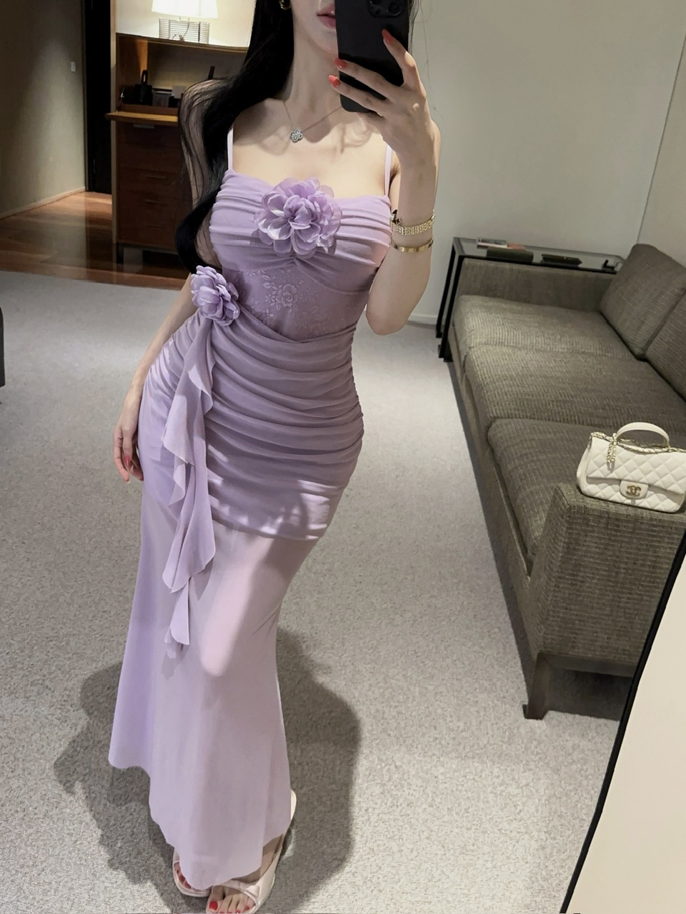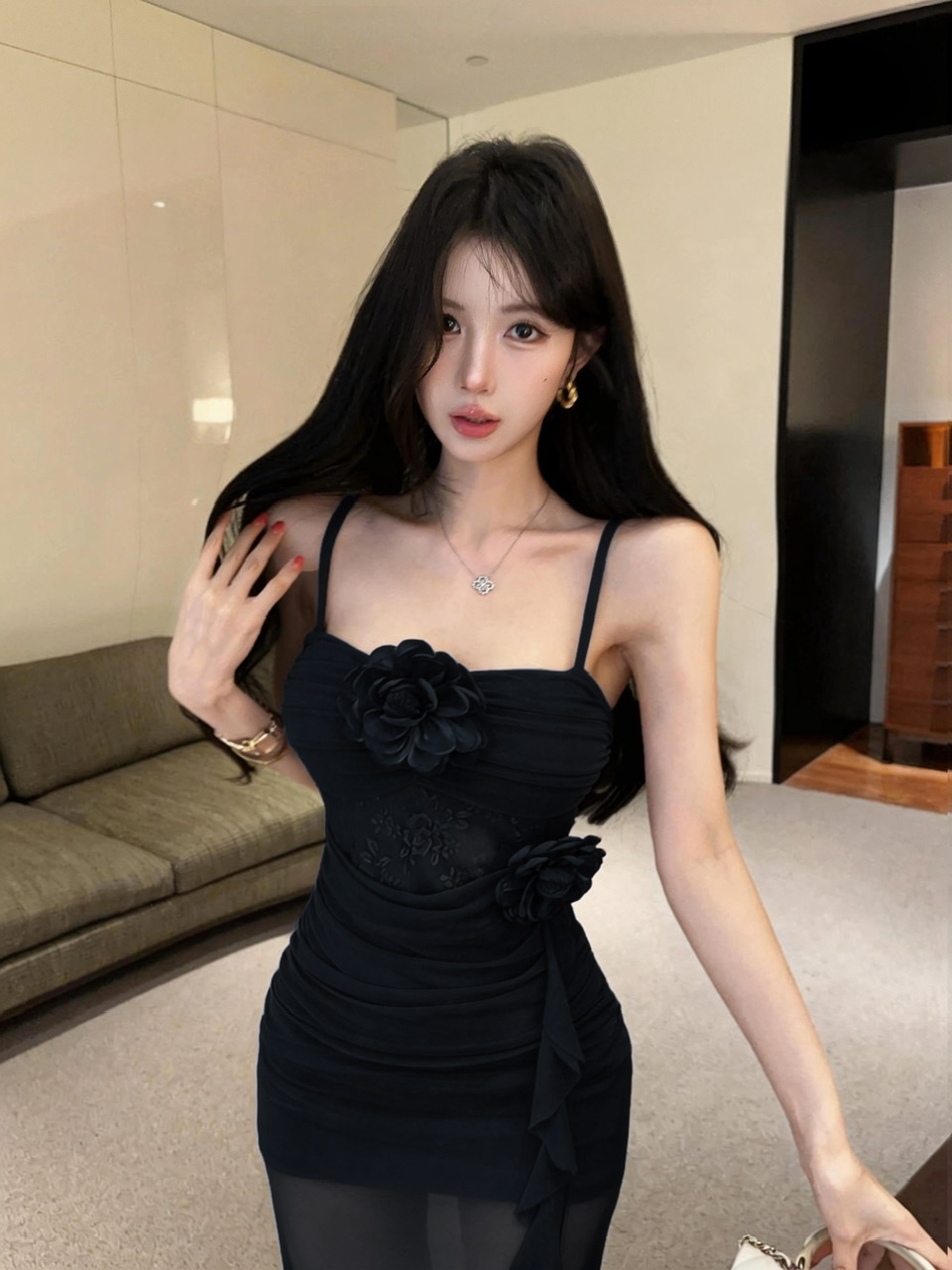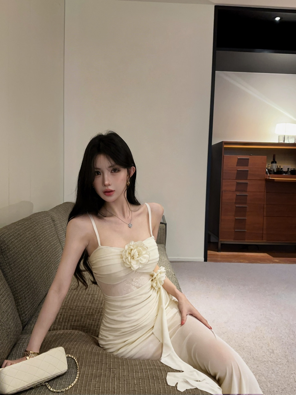 실사 프랑스식 섹시함 새틴 아세트산 슬립 디자인 센스 주름 허리 수축 슬림해 보이는 드레스