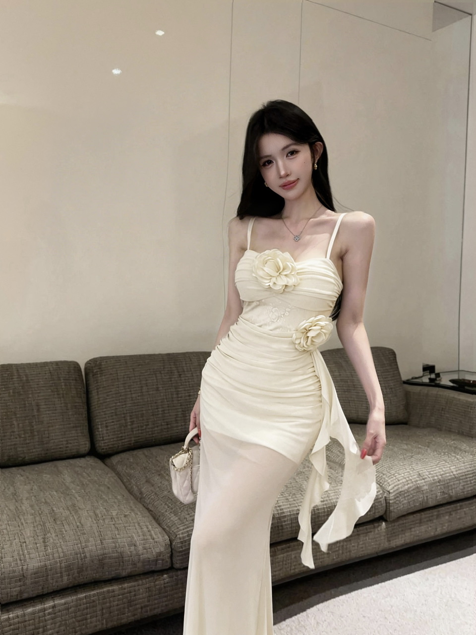 실사 프랑스식 무거운 작업 3 차원 꽃 디자인 센스 허리 수축 망사 불규칙 휴가 드레스