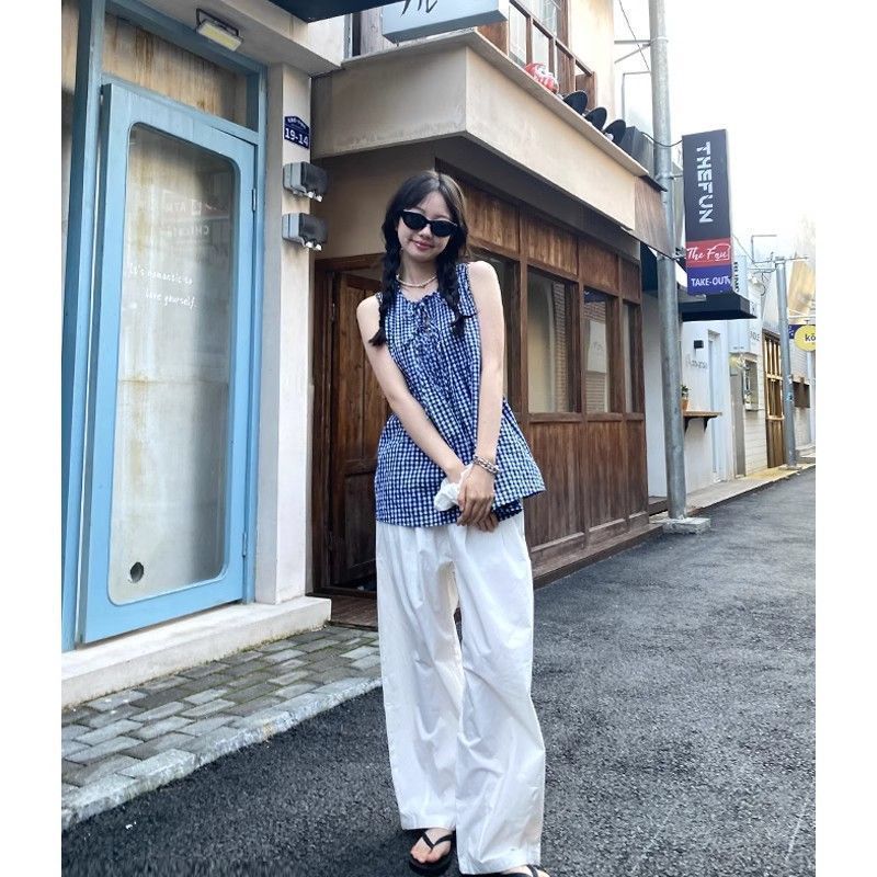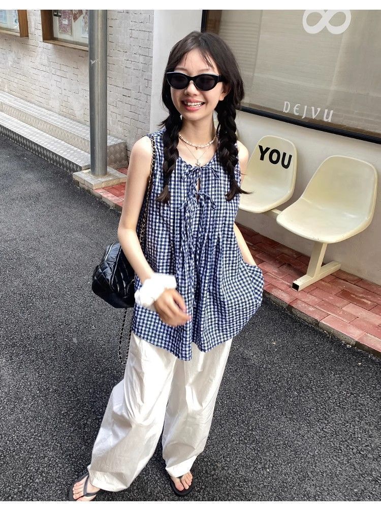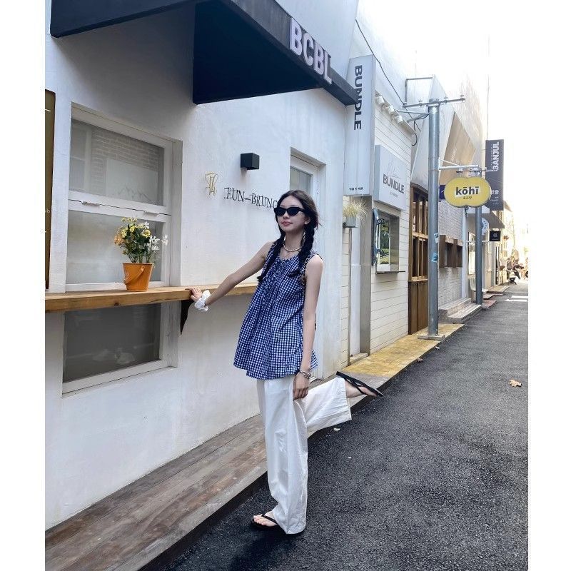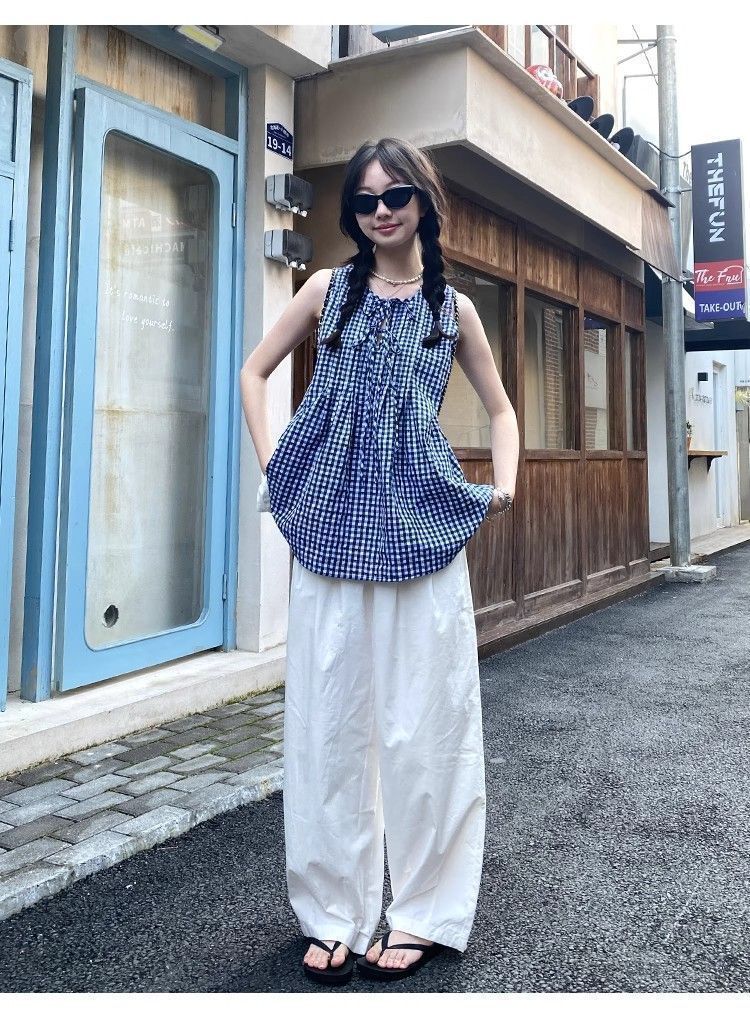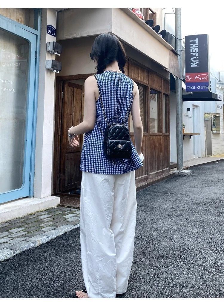 일곱 일곱 깃털 일본식 블루 화이트 체크무늬 민소매 셔츠 외출용 조끼 루즈핏 허리 수축 한 마디 인형 셔츠 맨위 여성 여름