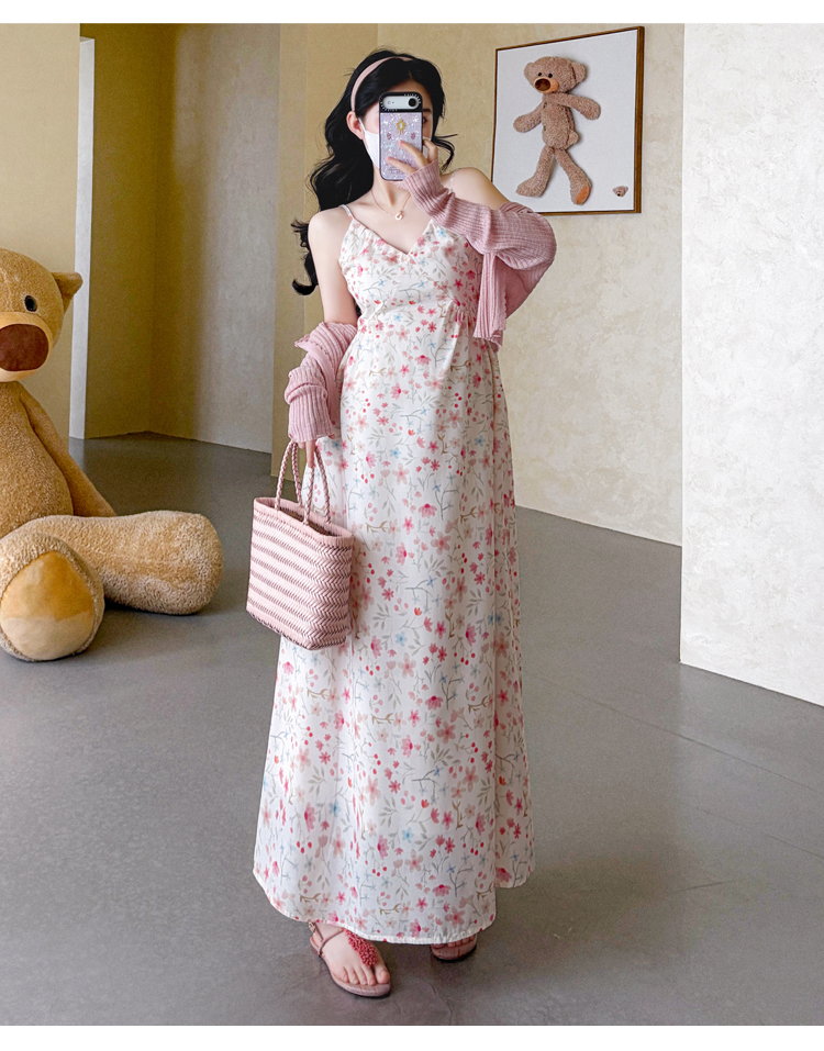 실사 새로운 임산부 여름 드레스 꽃무늬 쉬폰 임산부 슬립 드레스 작은 열림 셔츠 투피스 세트 빅 사이즈 임산부 세트