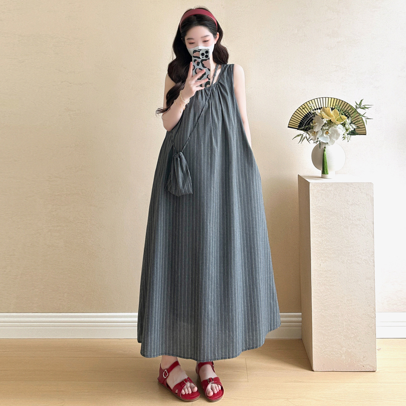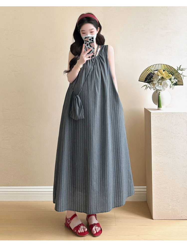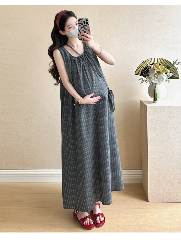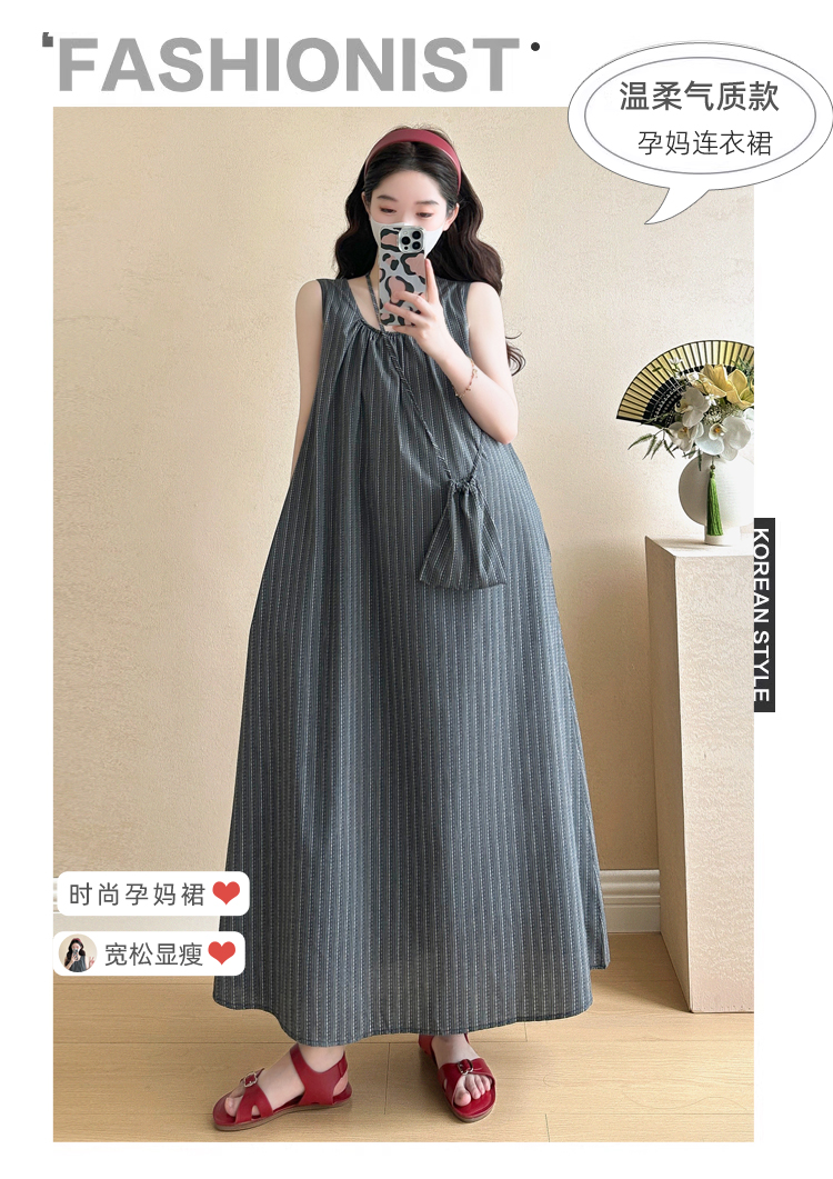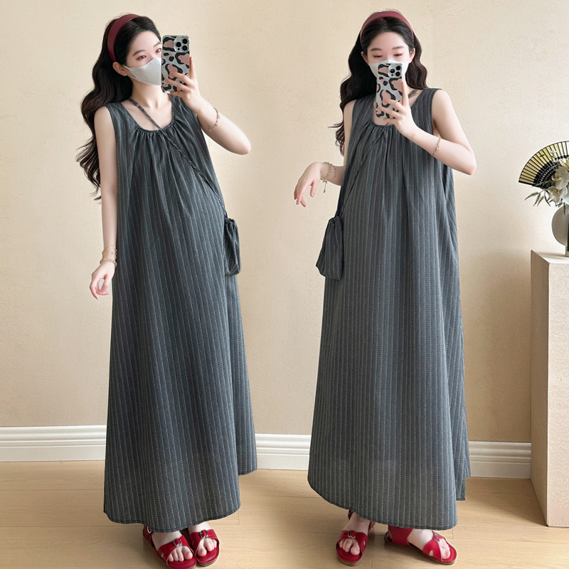 실사 새로운 출산 착용 순면 스트라이프 임산부 조끼 스커트 한국 스타일 느슨함 센스 빅 사이즈 임산부 드레스