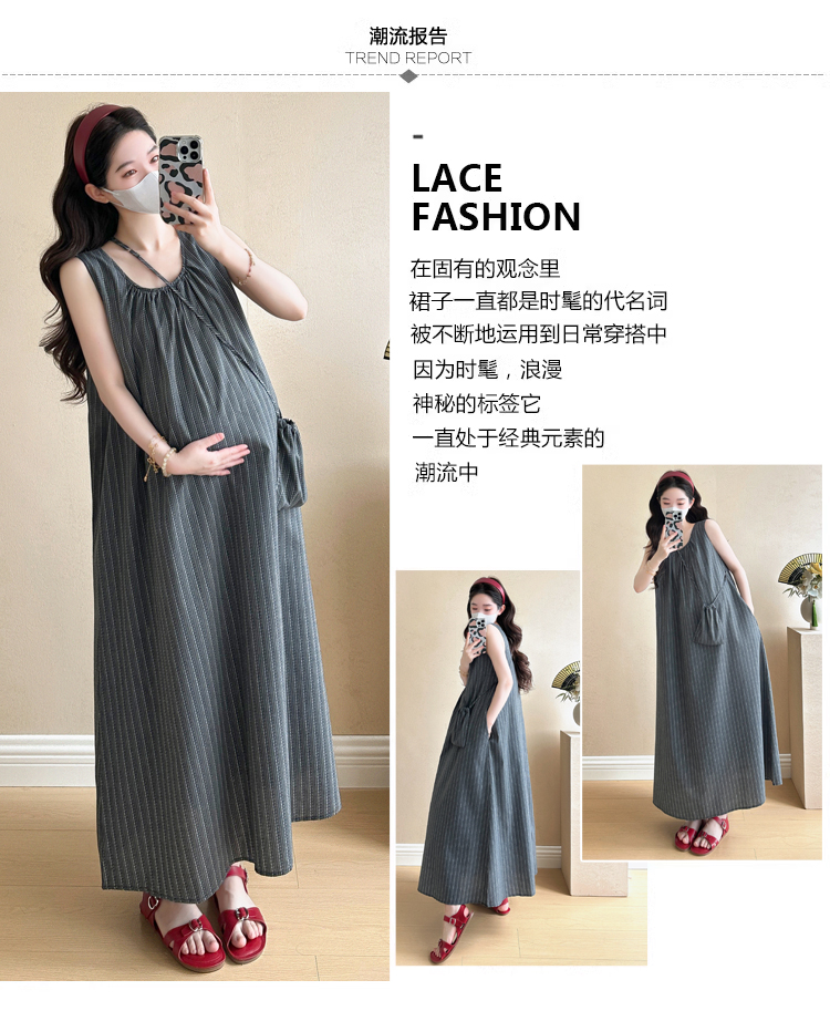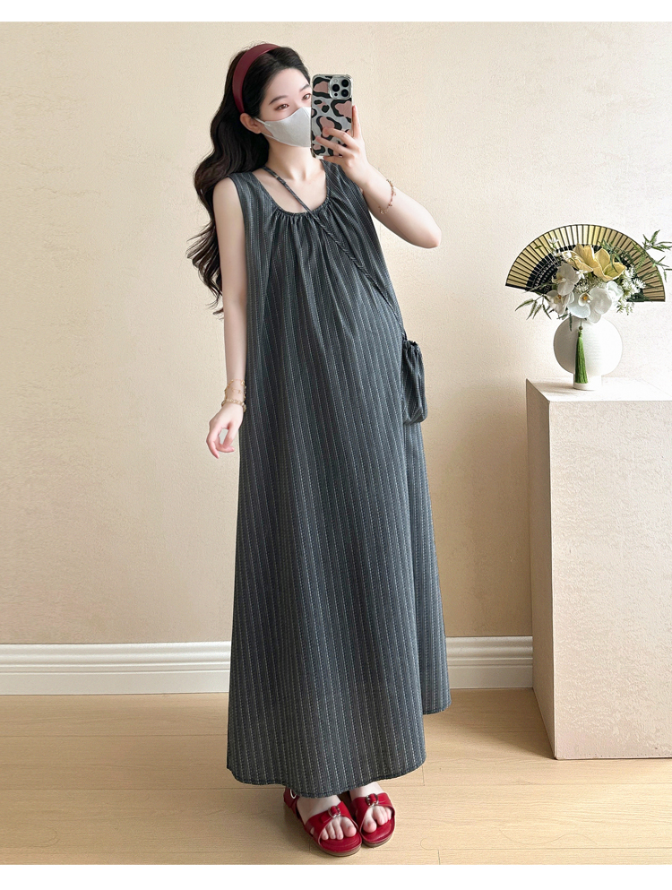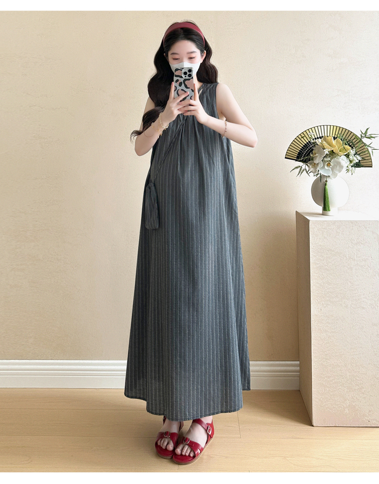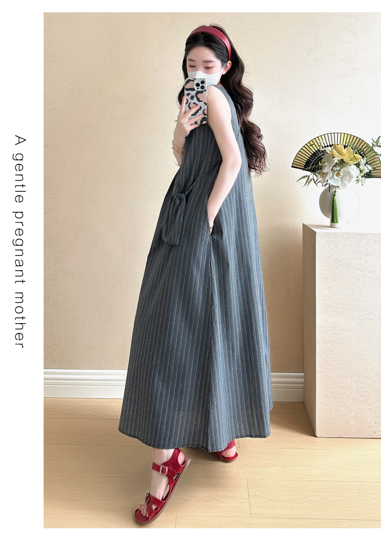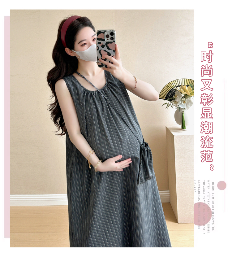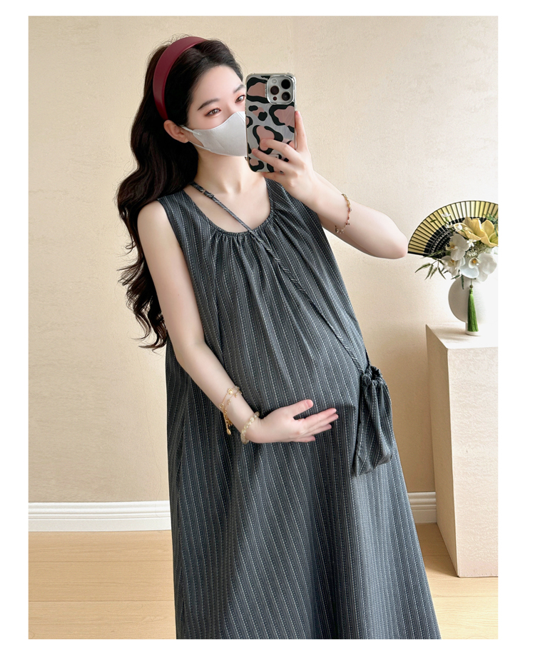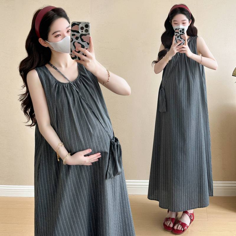 실사 새로운 임산부 여름 드레스 스트라이프 니트 임산부 조끼 스커트 한국 스타일 임산부 드레스 출산 착용