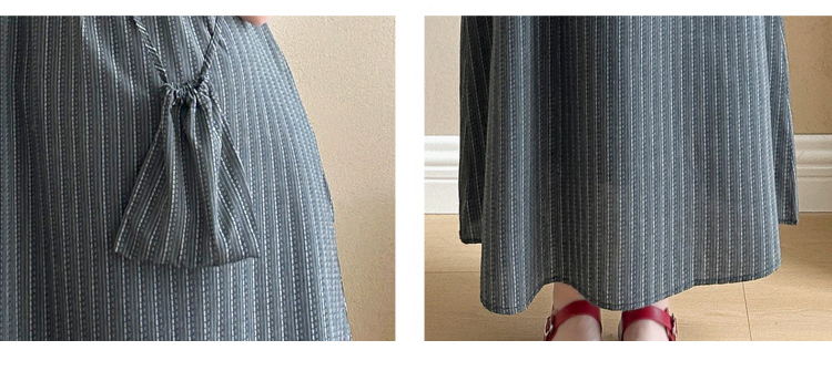 정가 실사 회색 스트라이프 오프숄더 니트 스웨터 여성 가을 하이웨이스트 플리츠 롱 스커트 부드러운 느긋한 바람 투피스 세트
