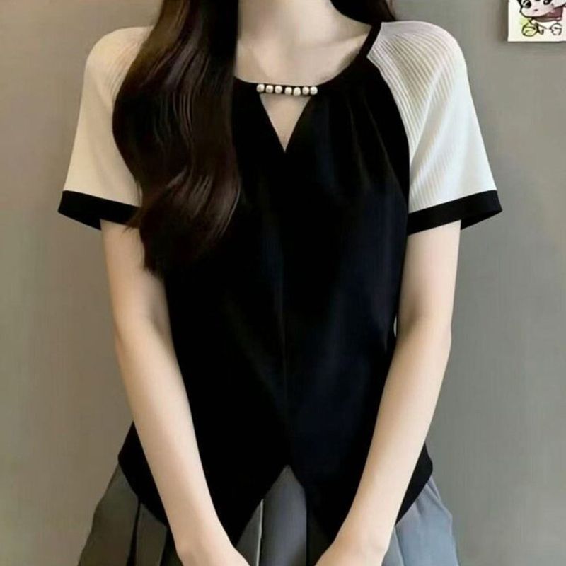 패션 다용도 배색 삽입 어깨 소매 반팔 티셔츠 여성 2026 여름 새로운 몸매 가꾸기 슬림해 보이는 Chic chic 맨위