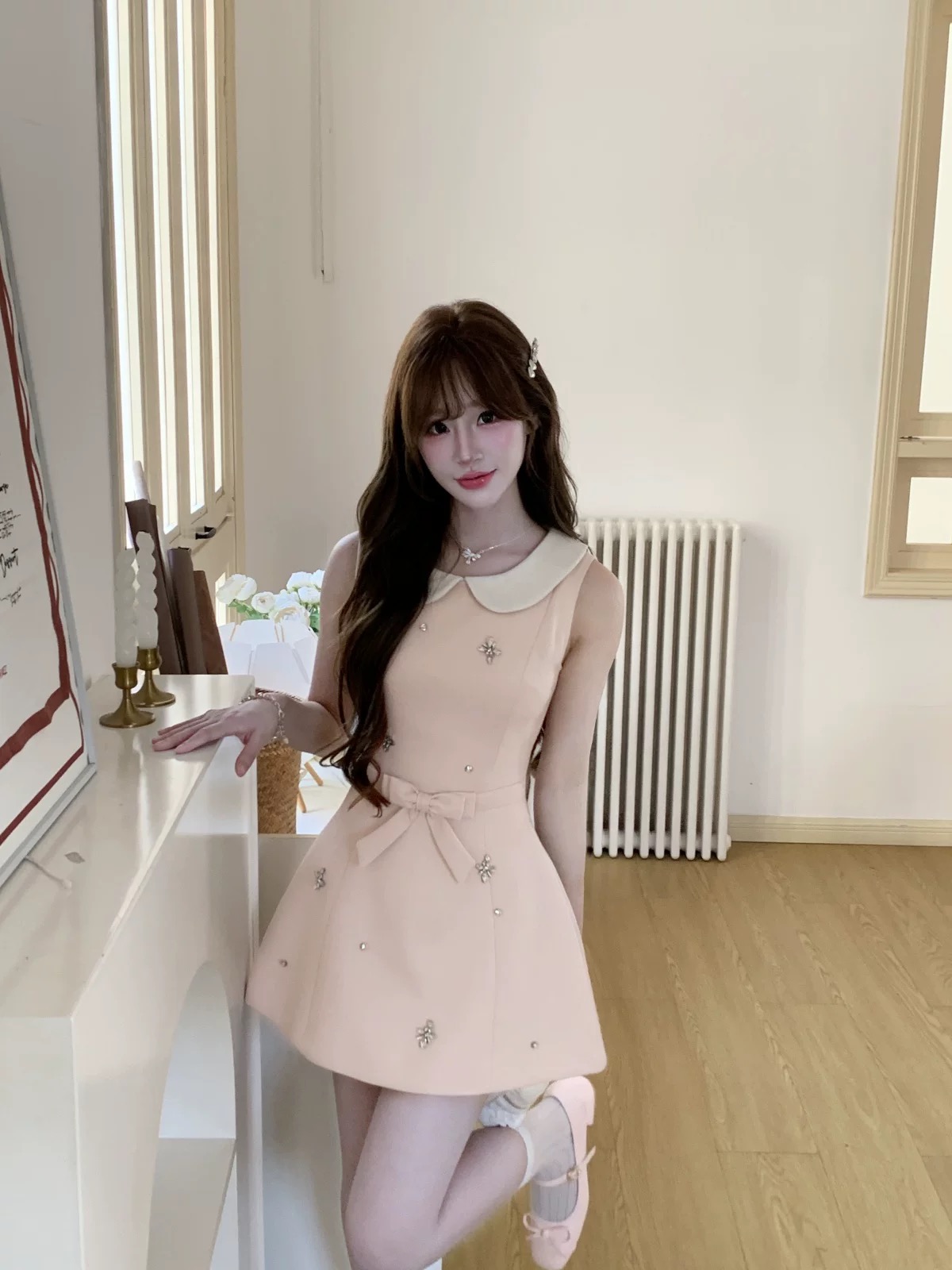 늦게 우산 우산 26 ss 슈퍼 신생 아이돌 배색 피터 팬 칼라 이중 버튼 셔츠 페이크 레이어드 점프 슈트 미니 스커트