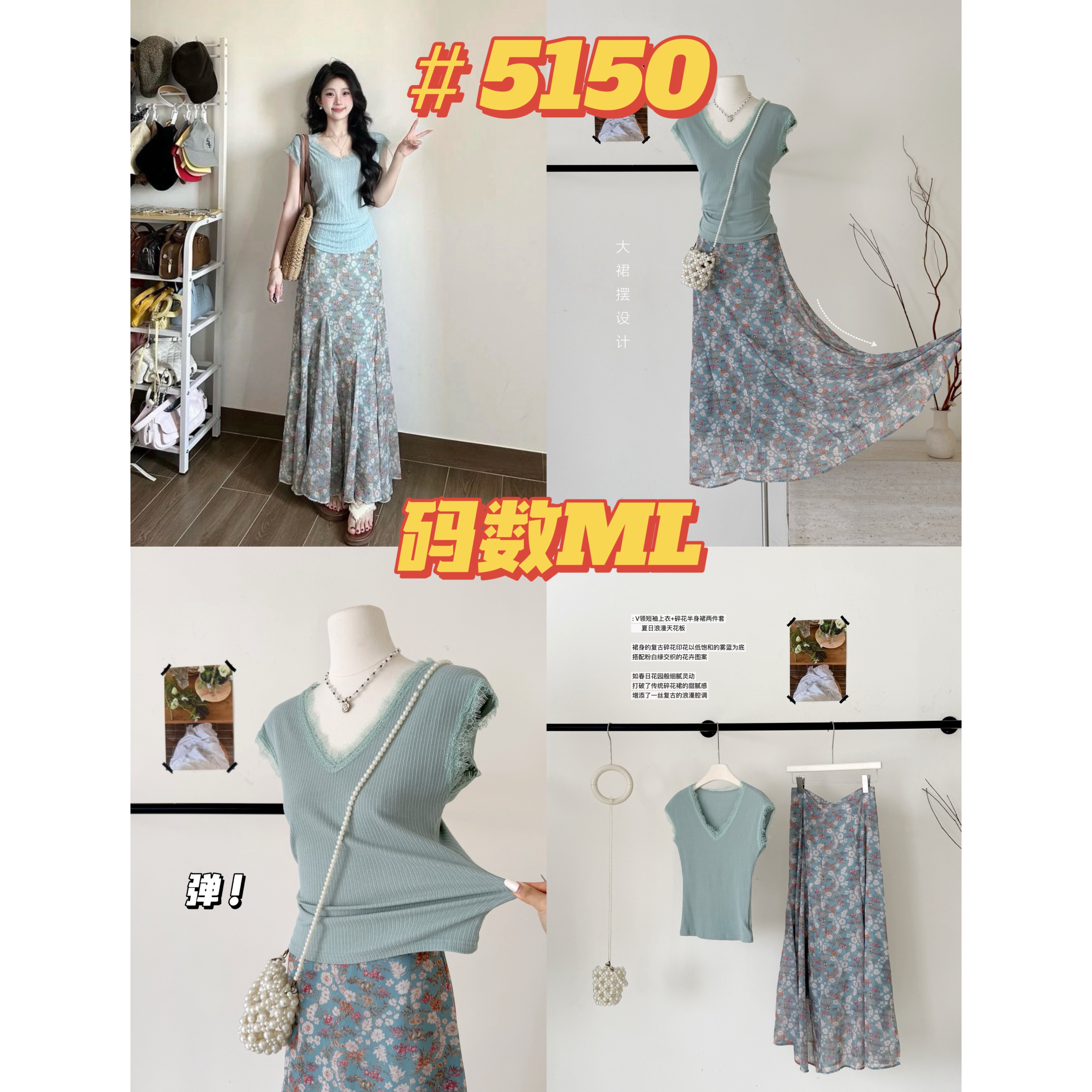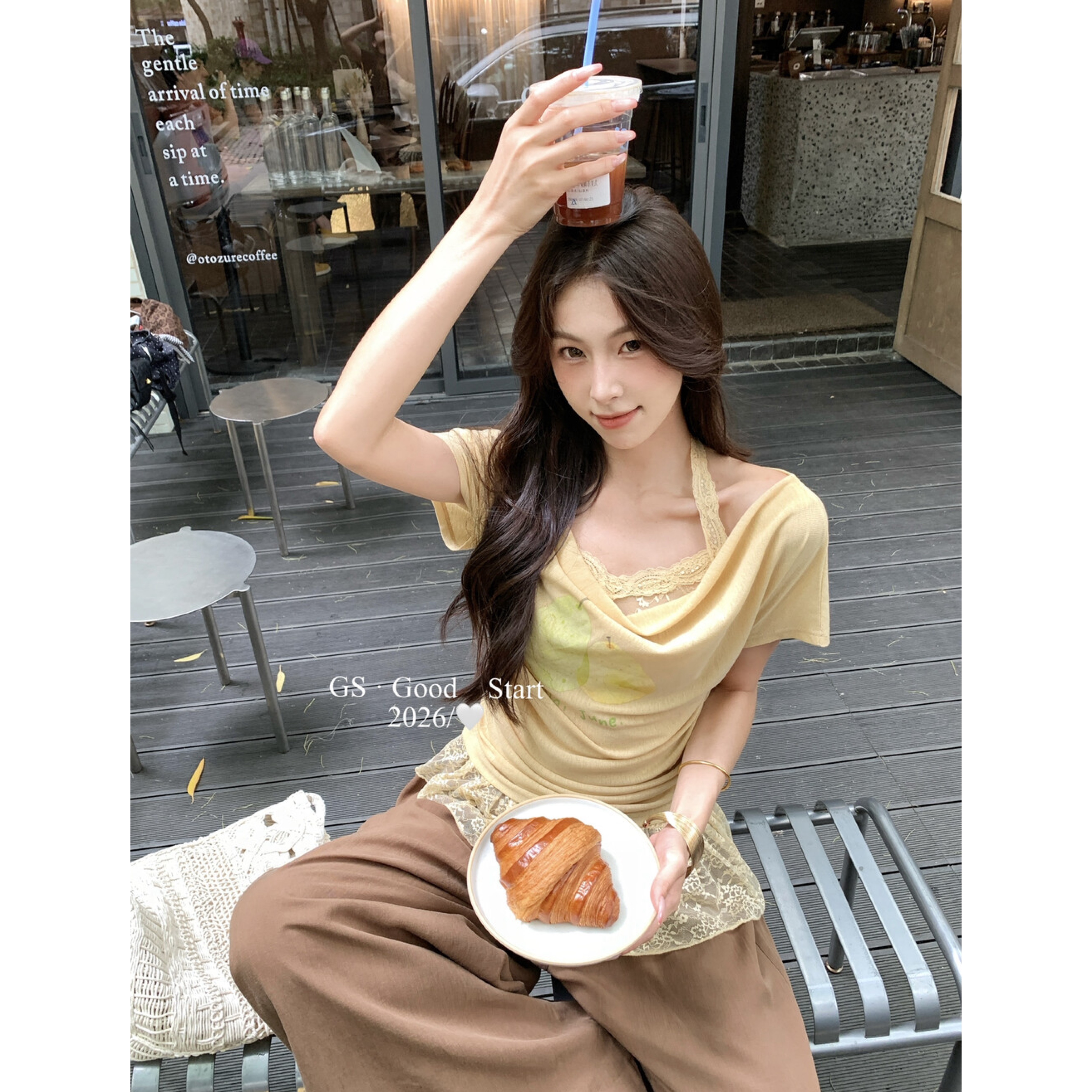 gs.good start 한 부서 부드러운 여름 분위기 센스 캐주얼 프린트 작은 셔츠 레이스 조끼 세트