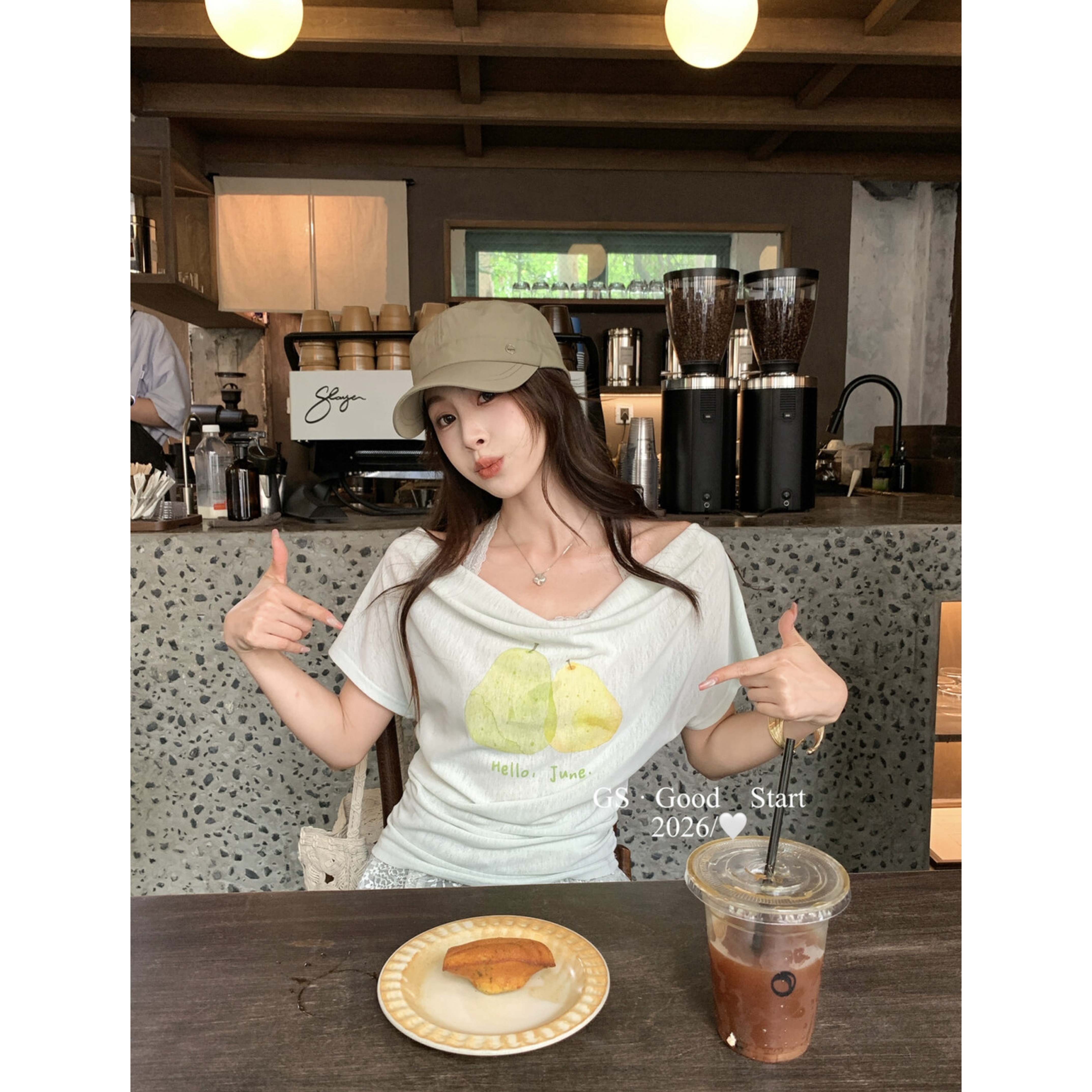 녹색 페이크 레이어드 행침 목 스타일 니트 반팔 티셔츠 여성 인사이드 가져 가라. 수 있습니다. 외출용 쇼트 스타일 긍정적 인 어깨 작은 맨위 2026 여름