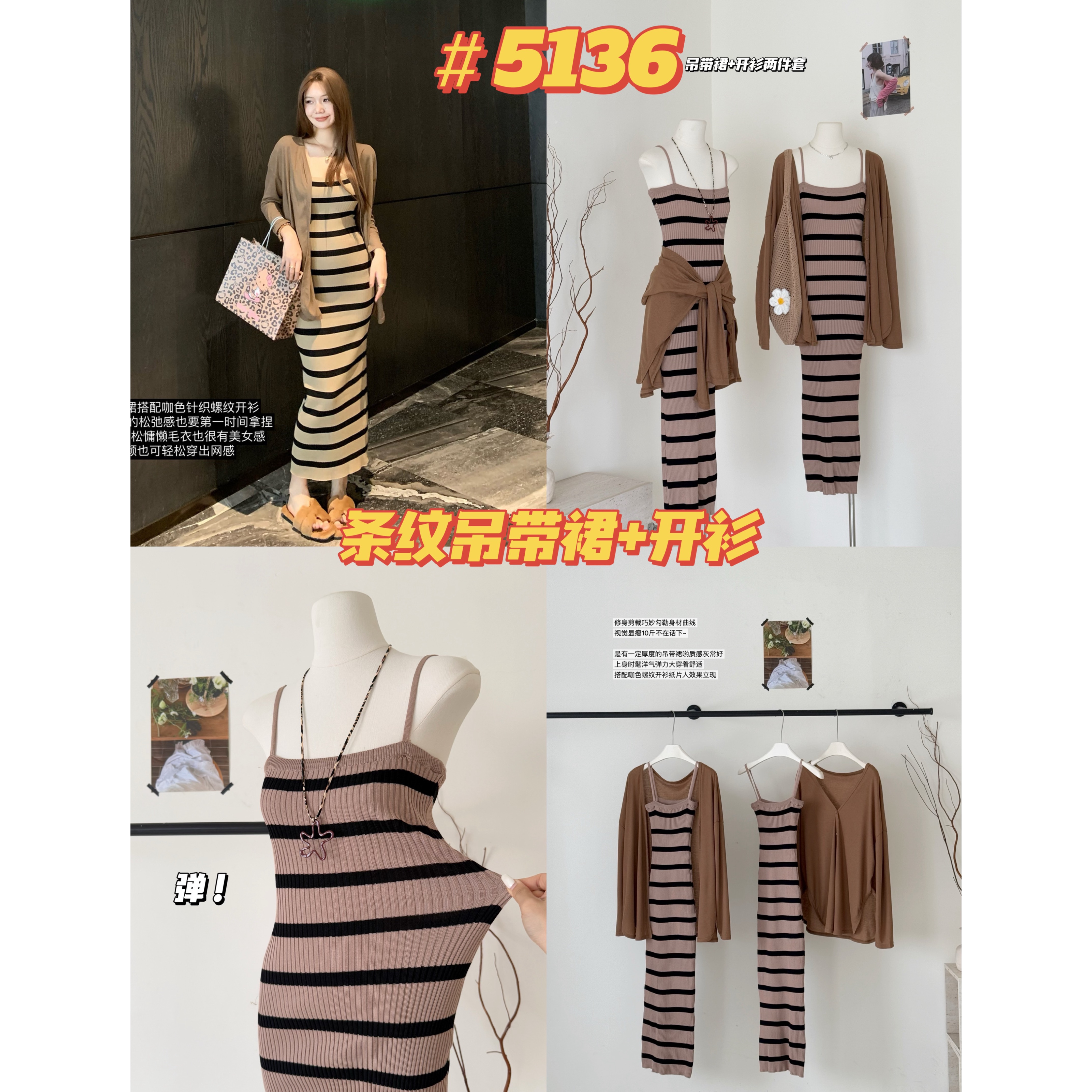 우 웃음 스트라이프 초기 언어 느슨함 센스 편안함 슬림해 보이는 좋은 착용 가져 가라. 조끼 롱 스커트 오픈 가디건 투피스 세트