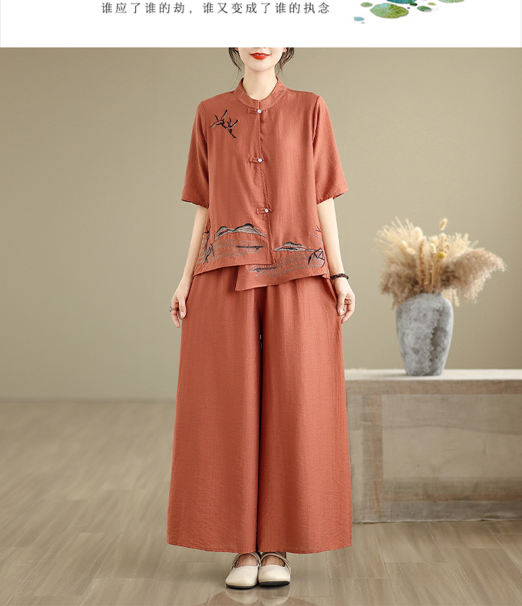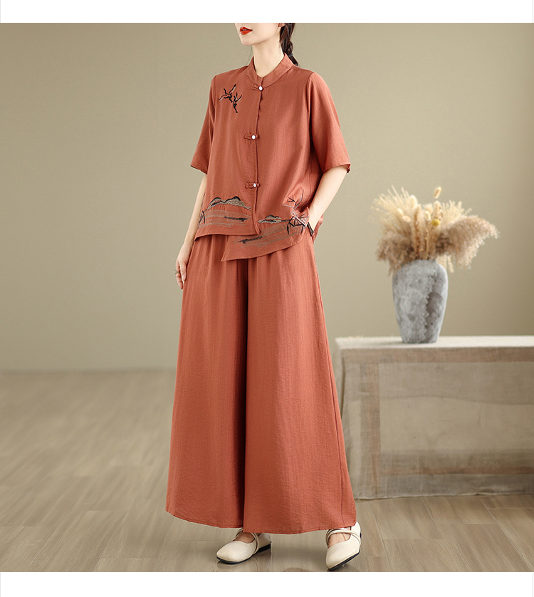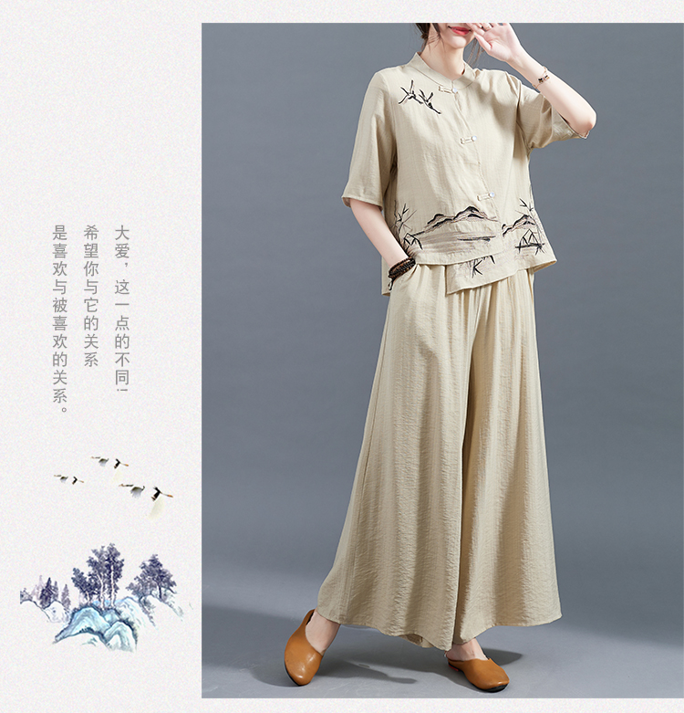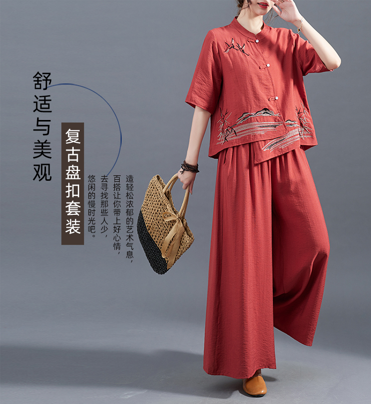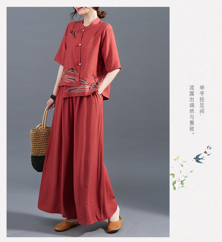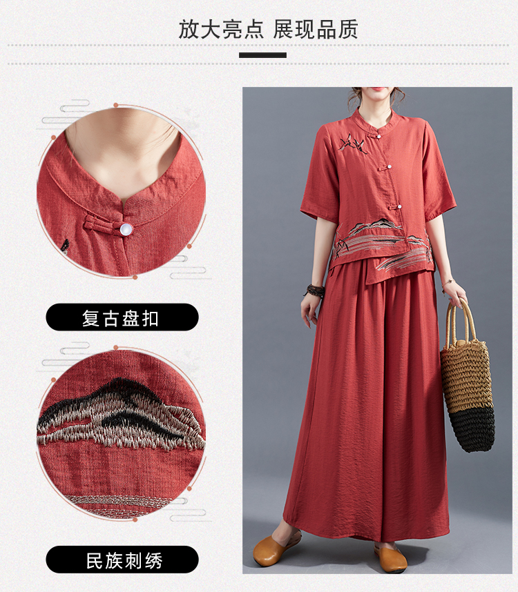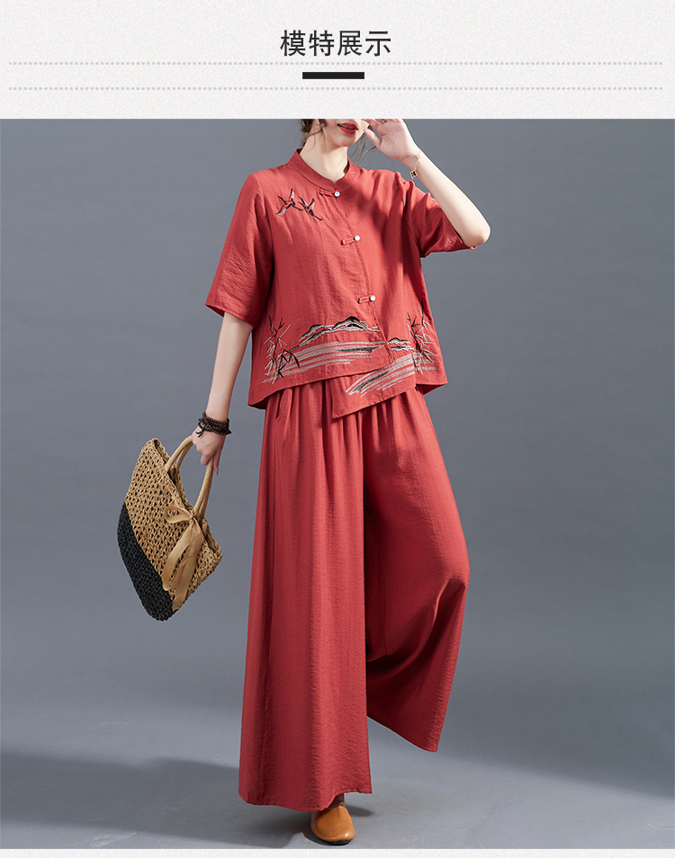 실사 2026 년 레트로 라미 작은 스탠드 칼라 자수 맨위 프린트 넓은 다리 길이 바지 투피스 세트