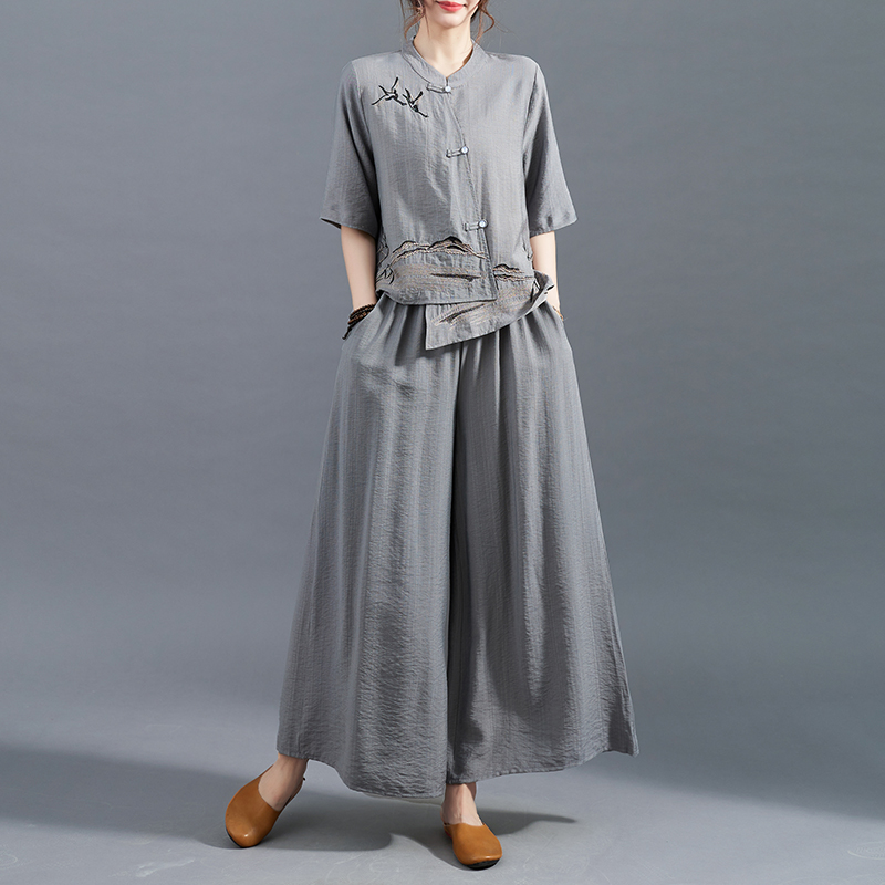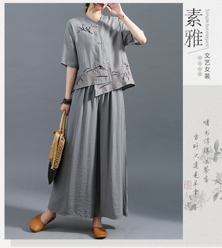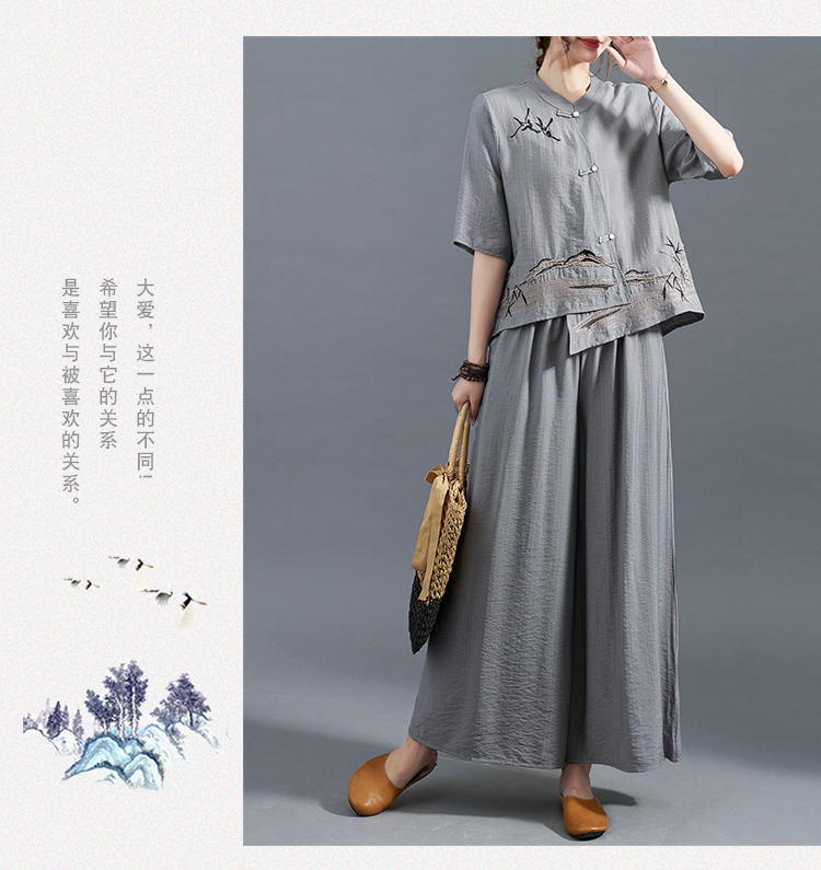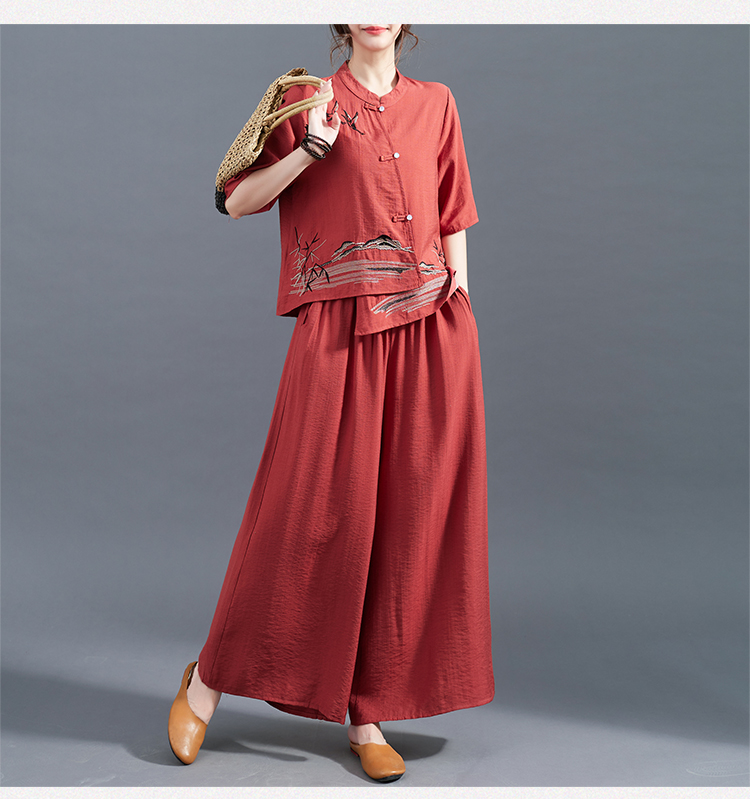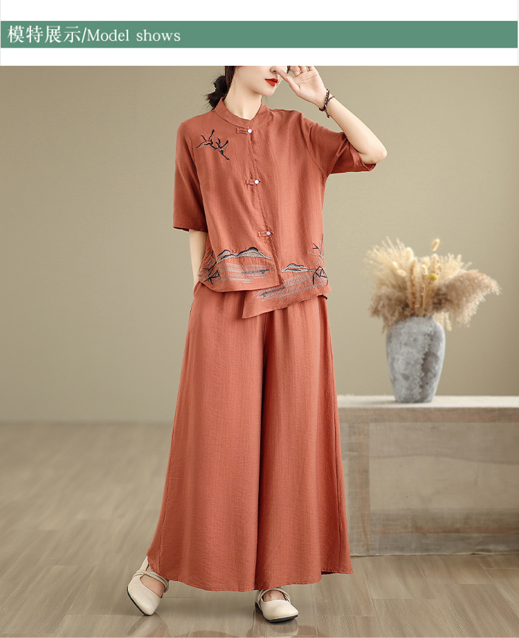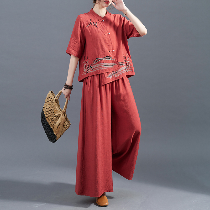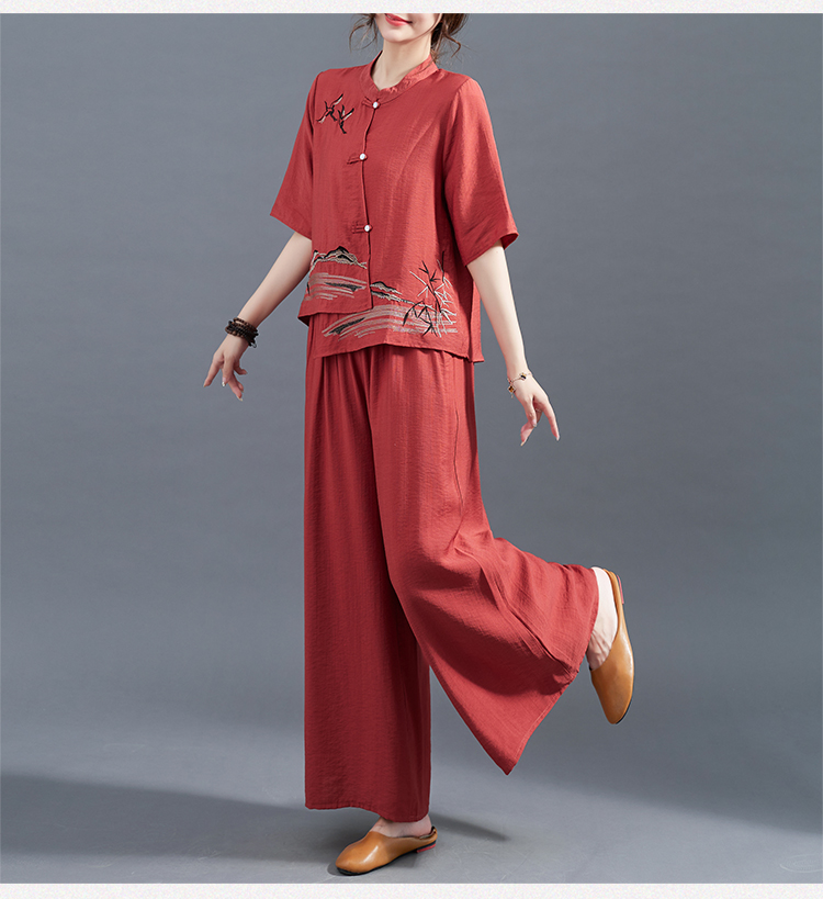실사 2026 년 레트로 라미 작은 스탠드 칼라 자수 맨위 프린트 넓은 다리 길이 바지 투피스 세트