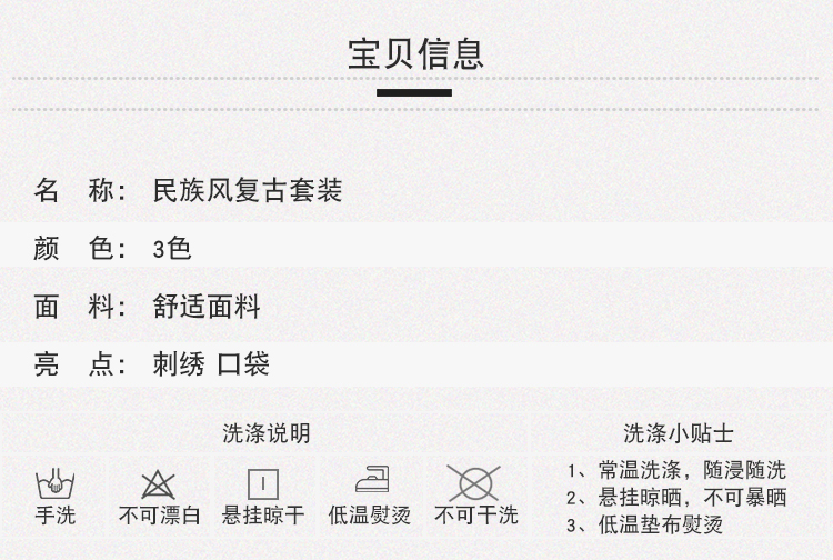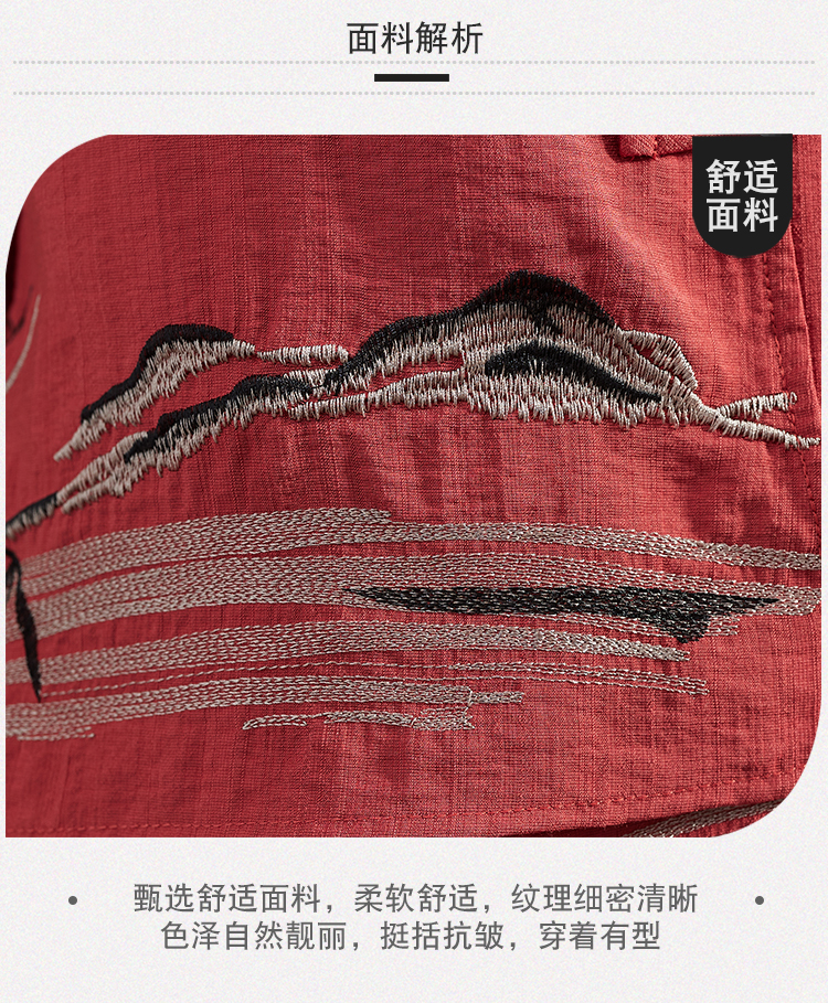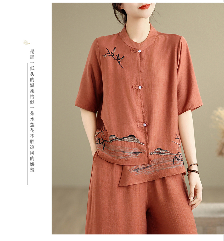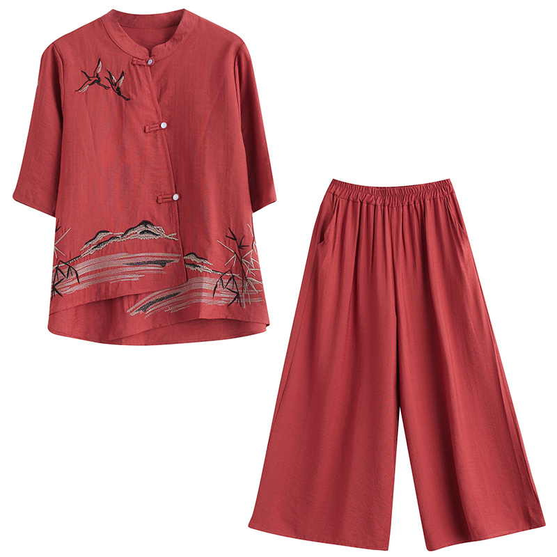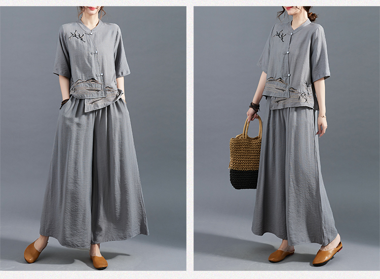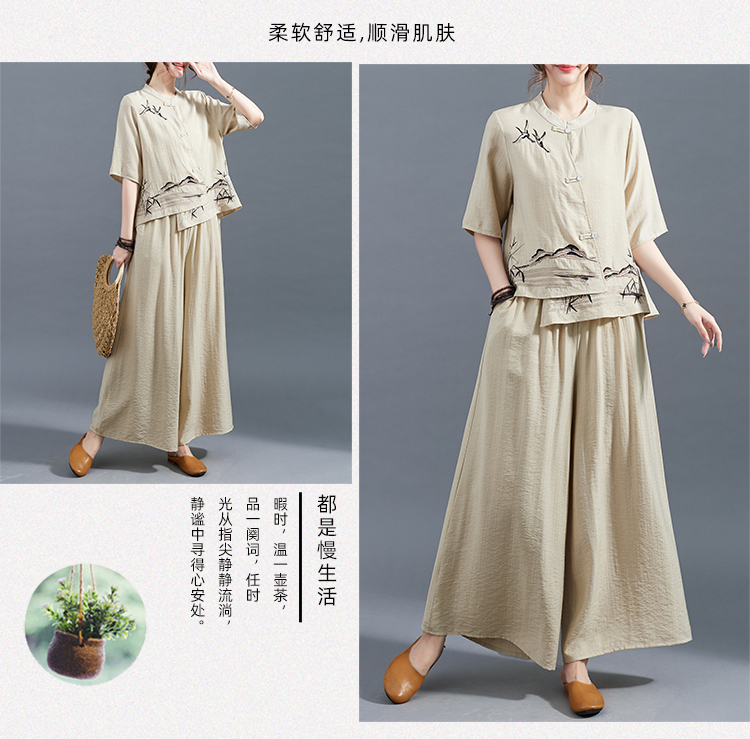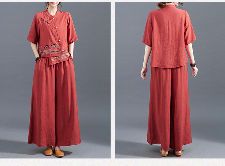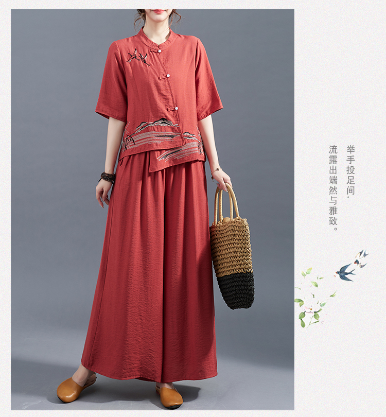 실사 2026 년 레트로 라미 작은 스탠드 칼라 자수 맨위 프린트 넓은 다리 길이 바지 투피스 세트