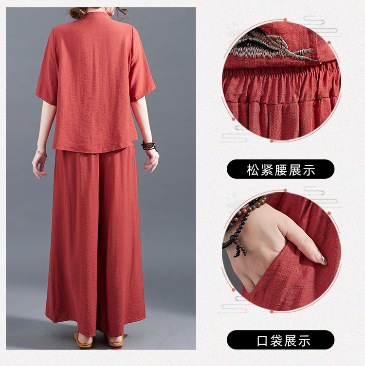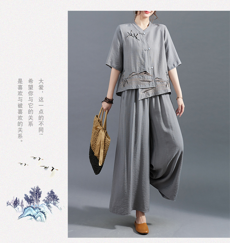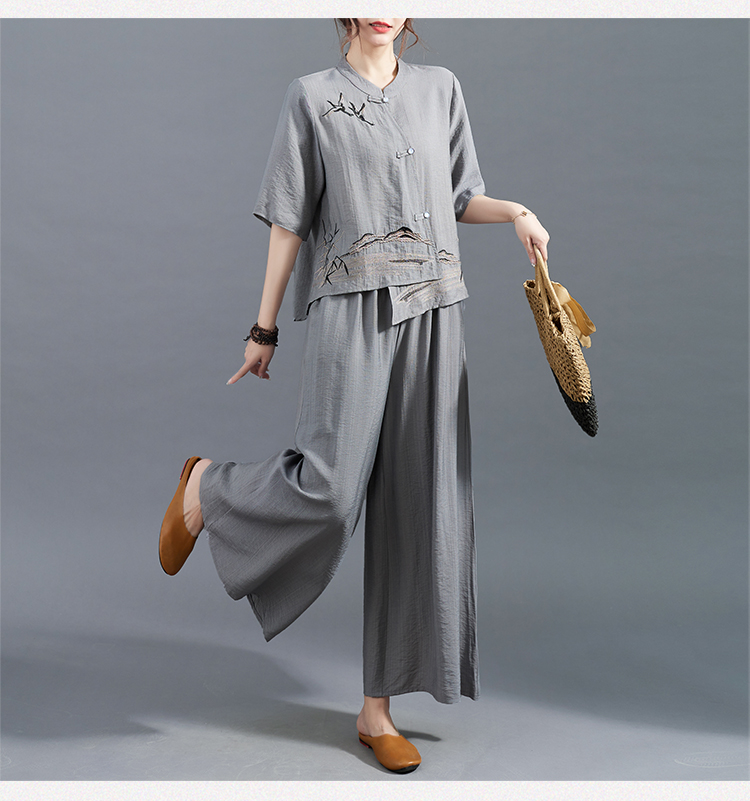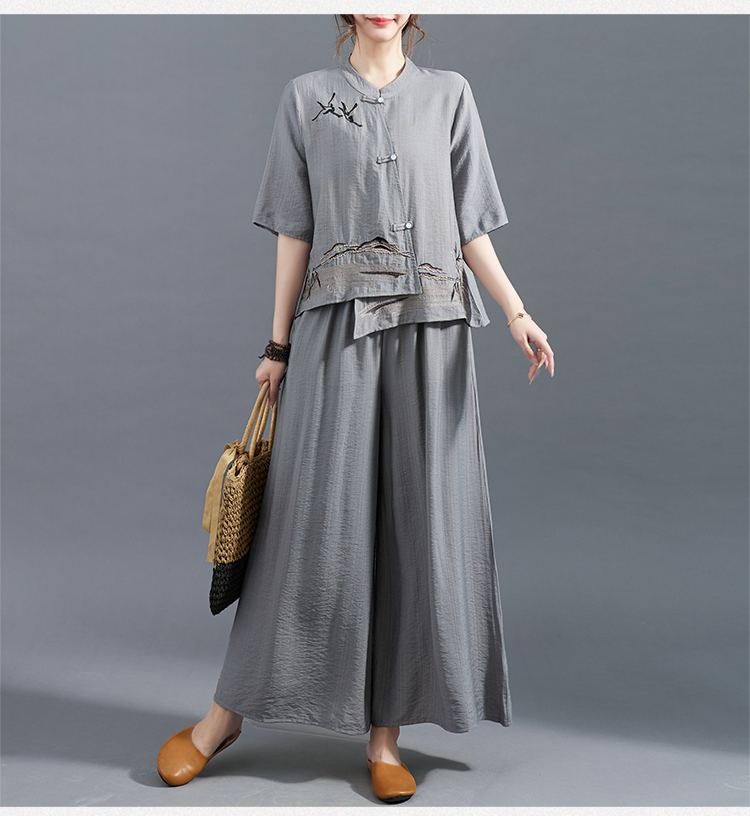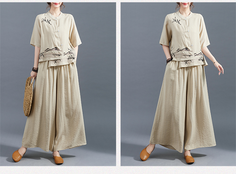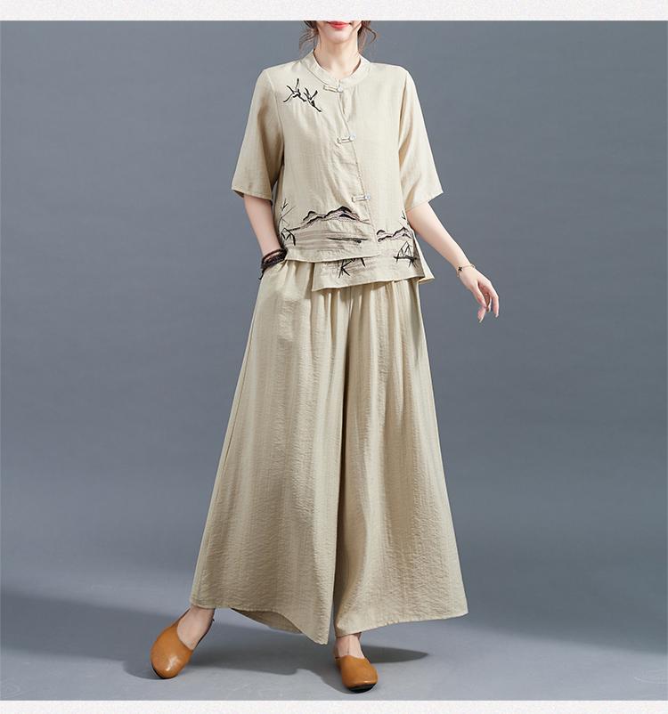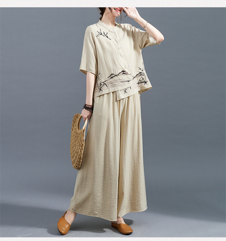 실사 2026 년 여름 새로운 레트로 문예 아마 자수 맨위 넓은 다리 길이 바지 투피스 세트