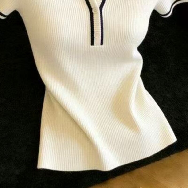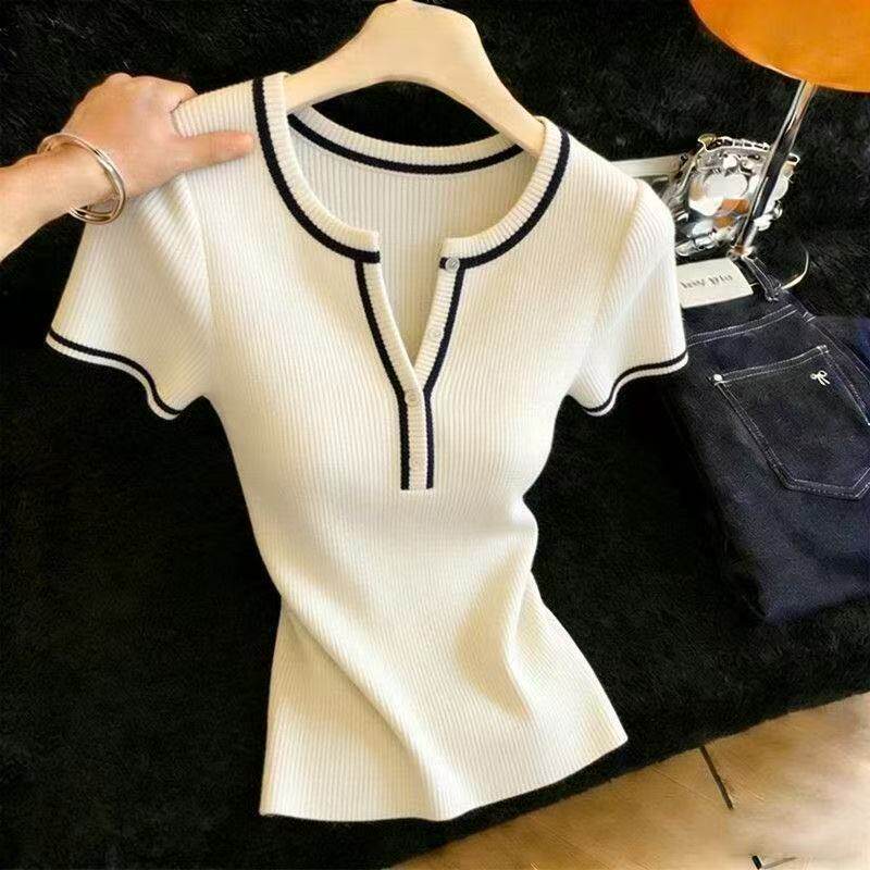 배색 V넥 얼음 실크 반팔 니트 스웨터 여성 여름 얇은 스타일 핫걸 허리 수축 티셔츠 한 부서 고급 센스 유럽 상품 맨위