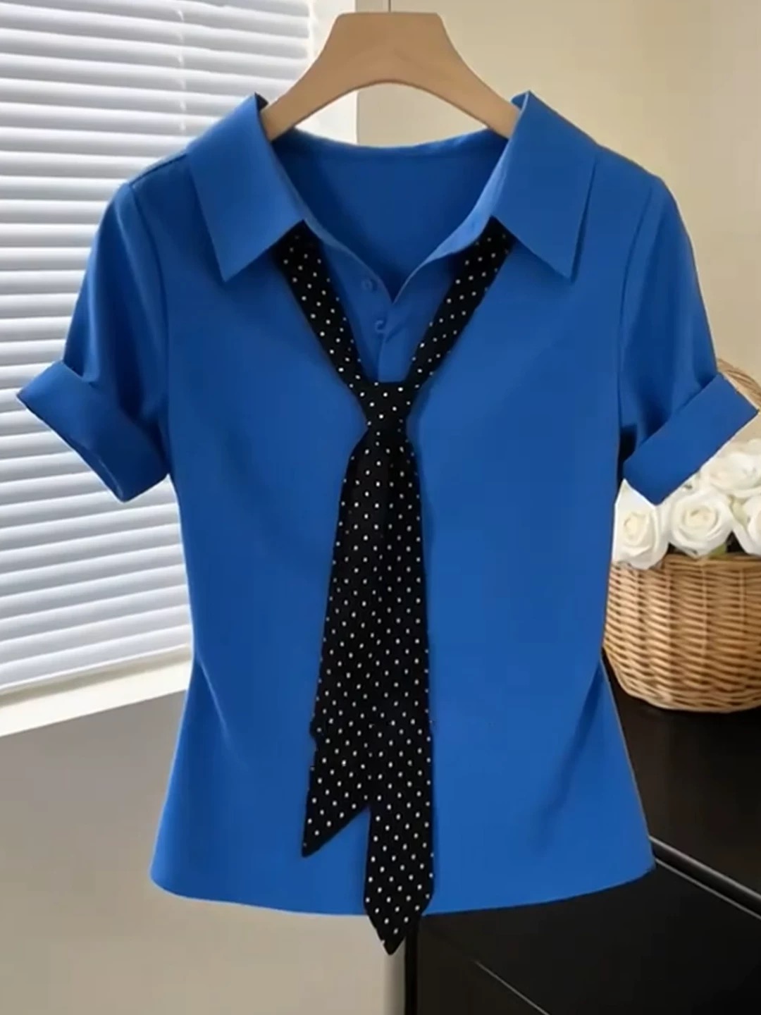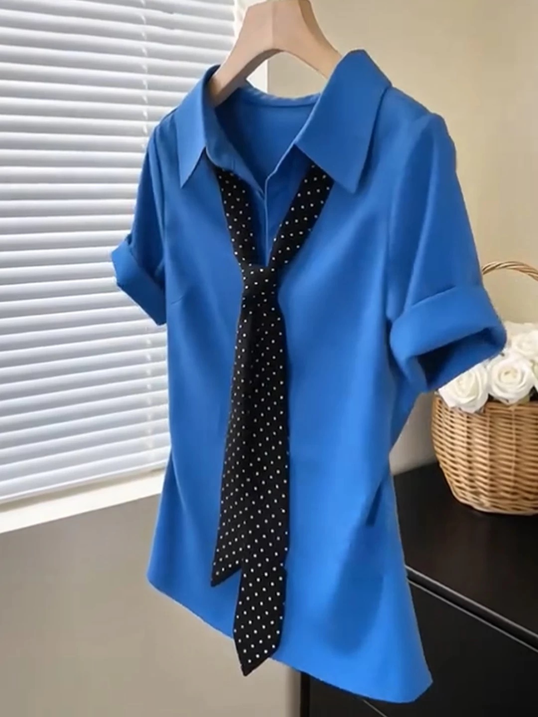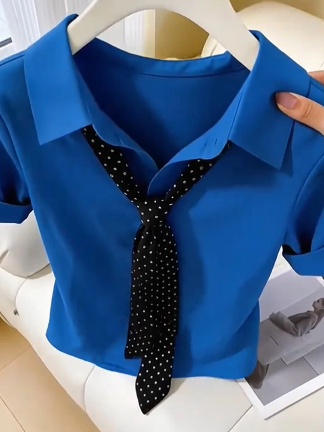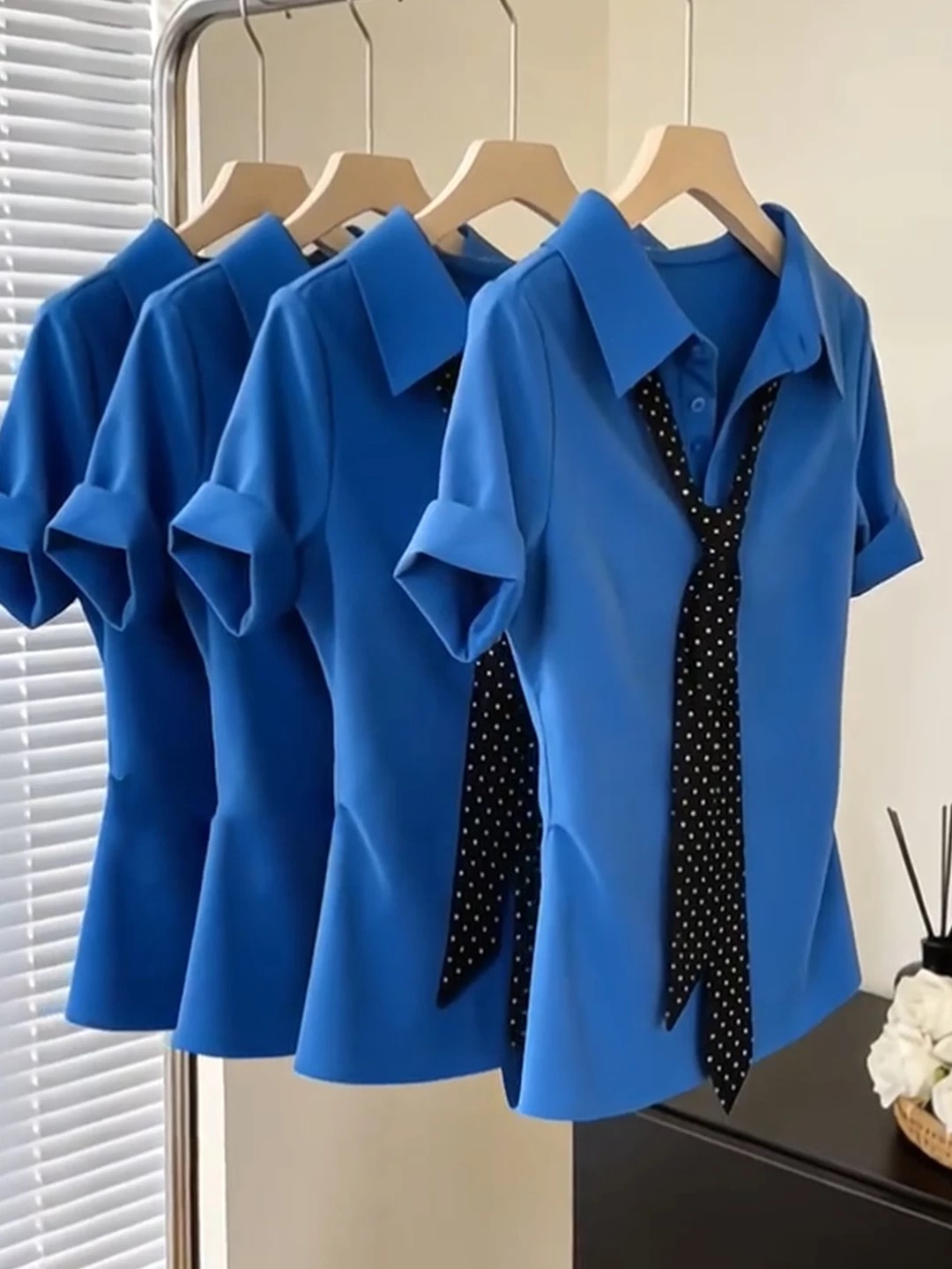 학원 스타일 품격 넥타이 파란색 반팔 셔츠 여성 의류 2026 여름 새로운 캐주얼 세련된 폭발 짧은 맨위