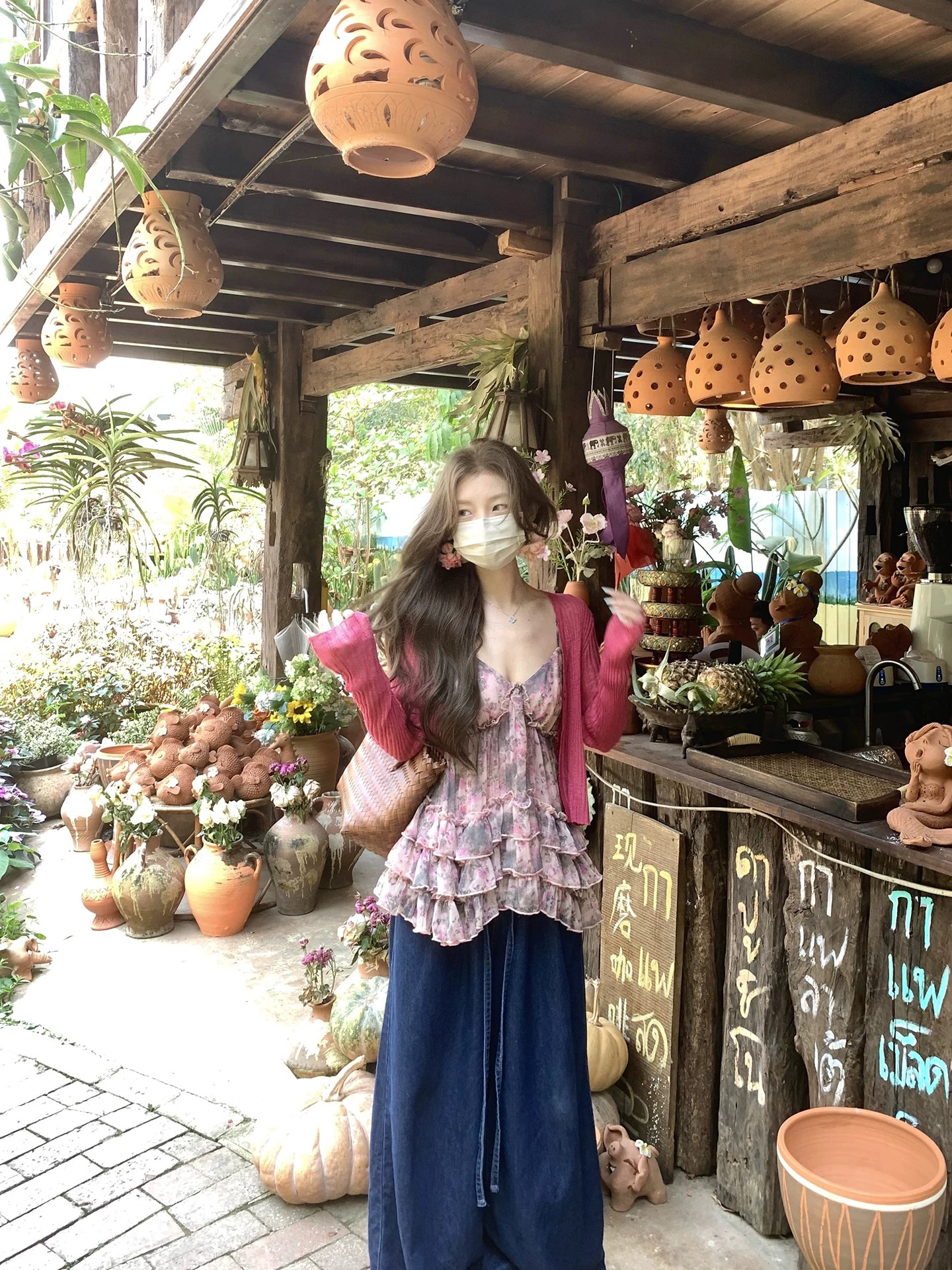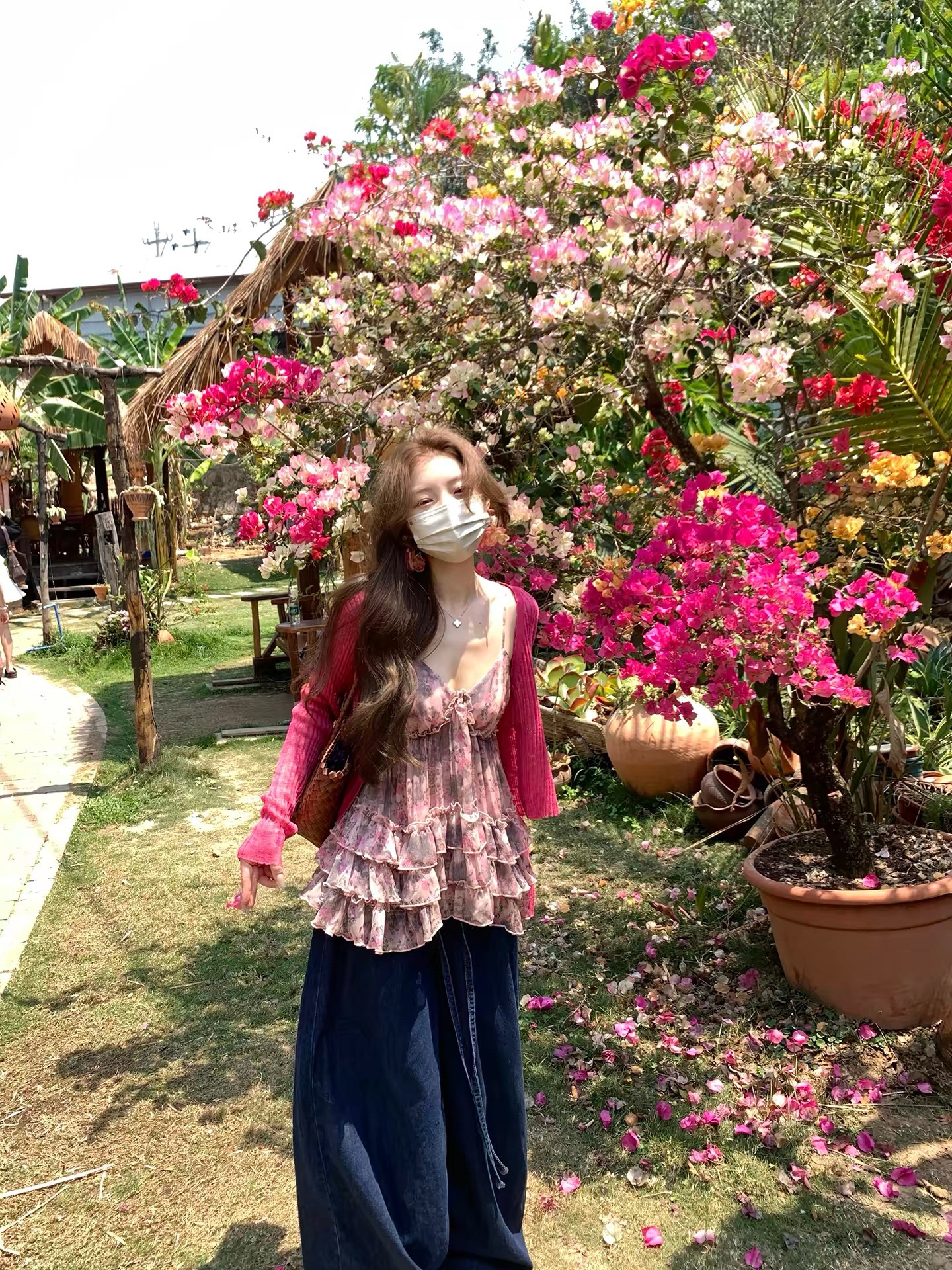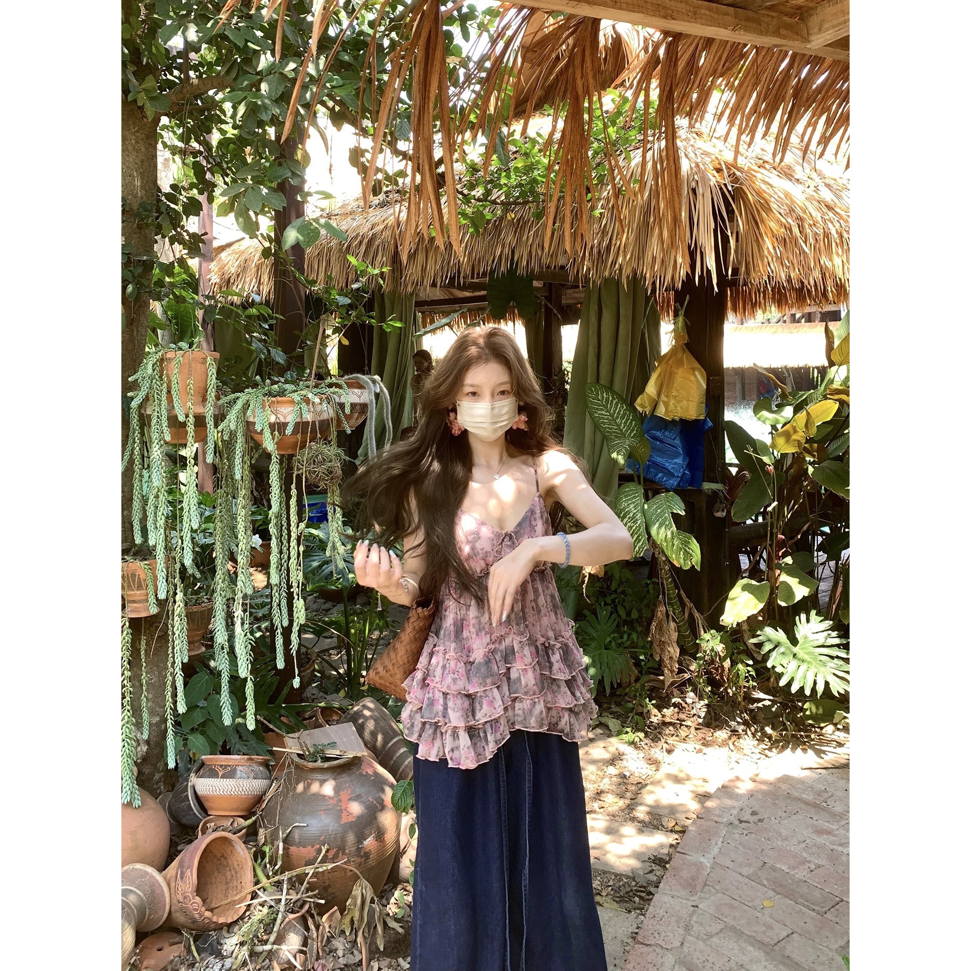 향나무 믹스 재스민 ~ 중 바람 V넥 꽃무늬 여성 셔츠 여름 새로운 프릴 쇼트 스타일 맨위 반신 스커트