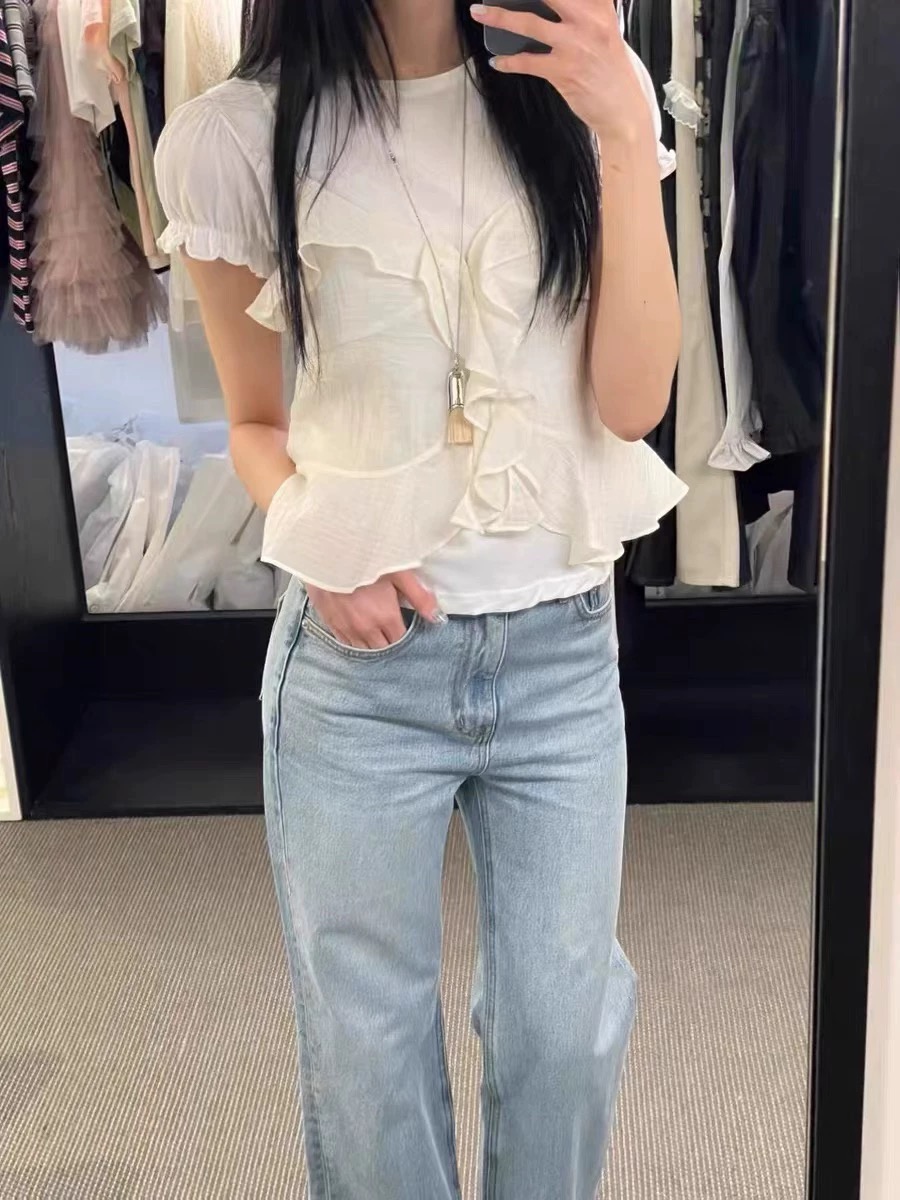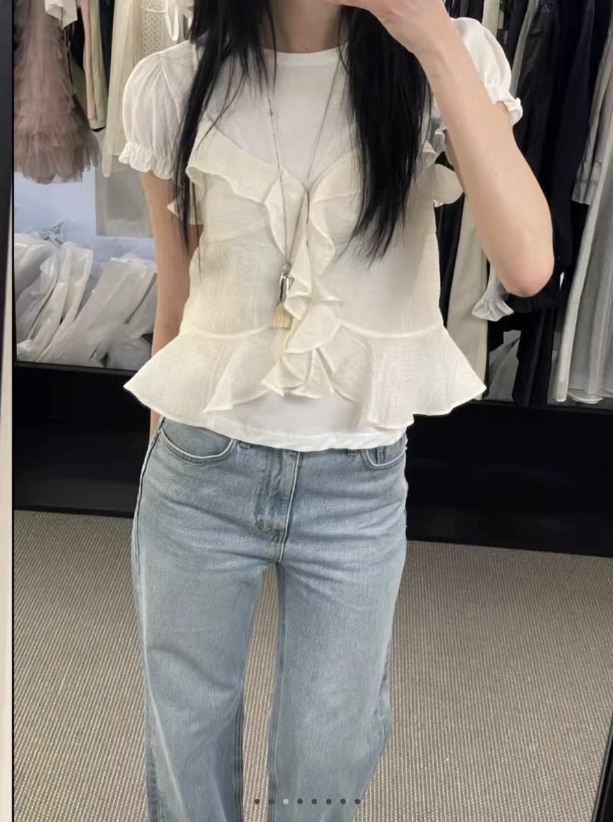 실사 새로운 중식 국풍 반팔 셔츠 2026 여름 새로운 여성 몸매 가꾸기 허리 수축 거품 소매 레이스 쉬폰 블라우스