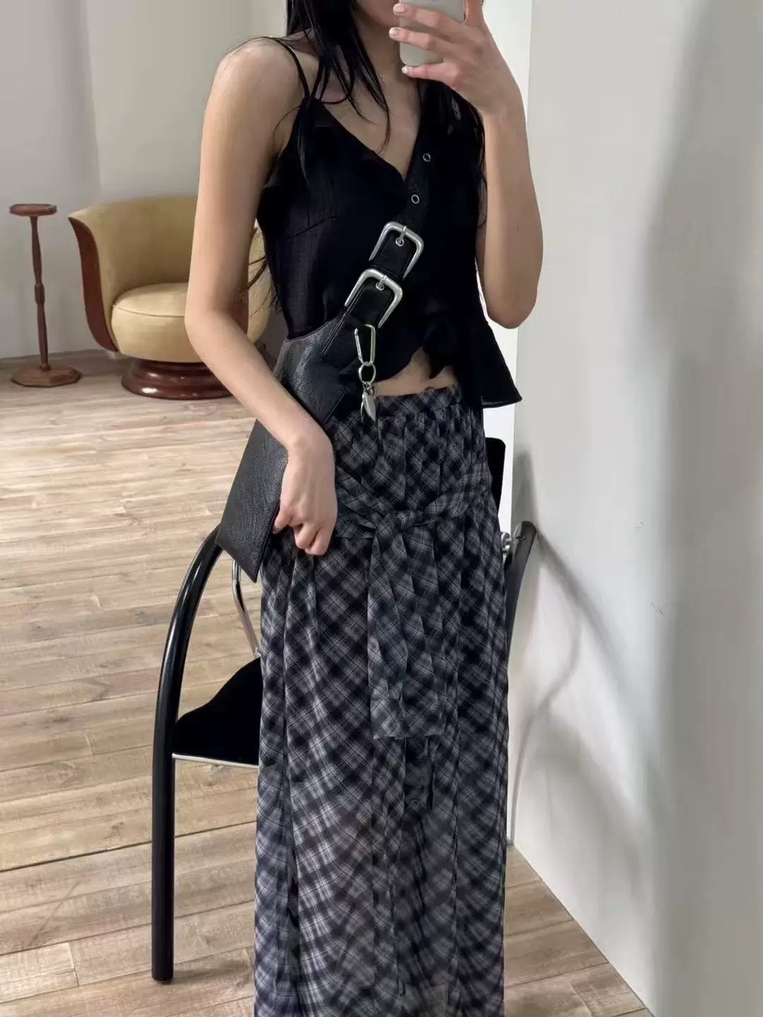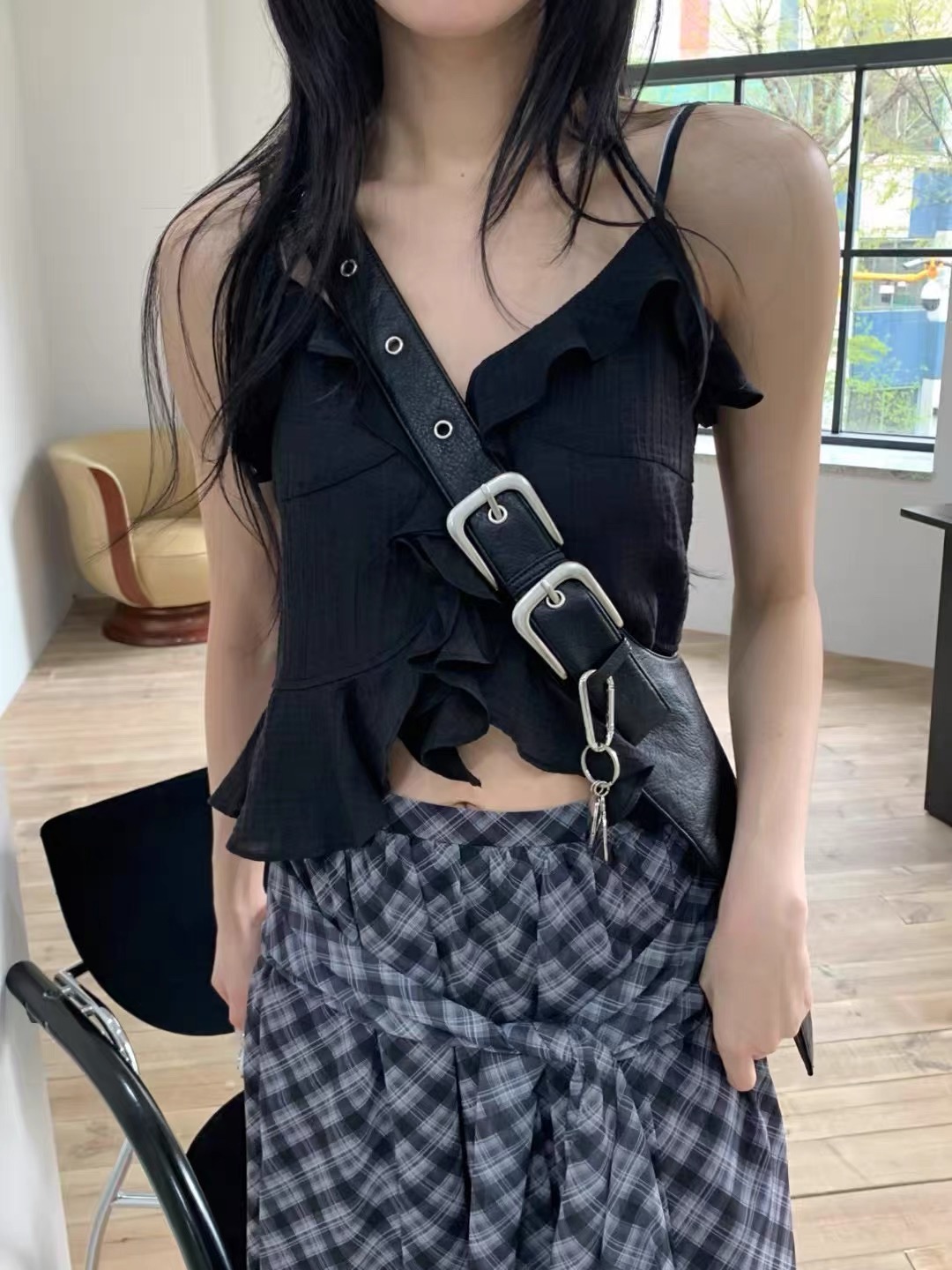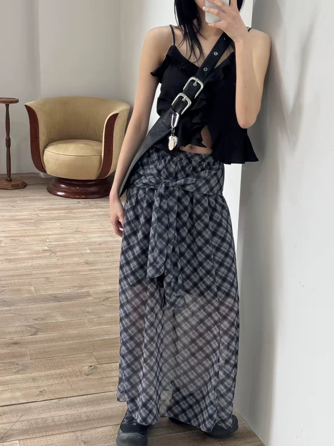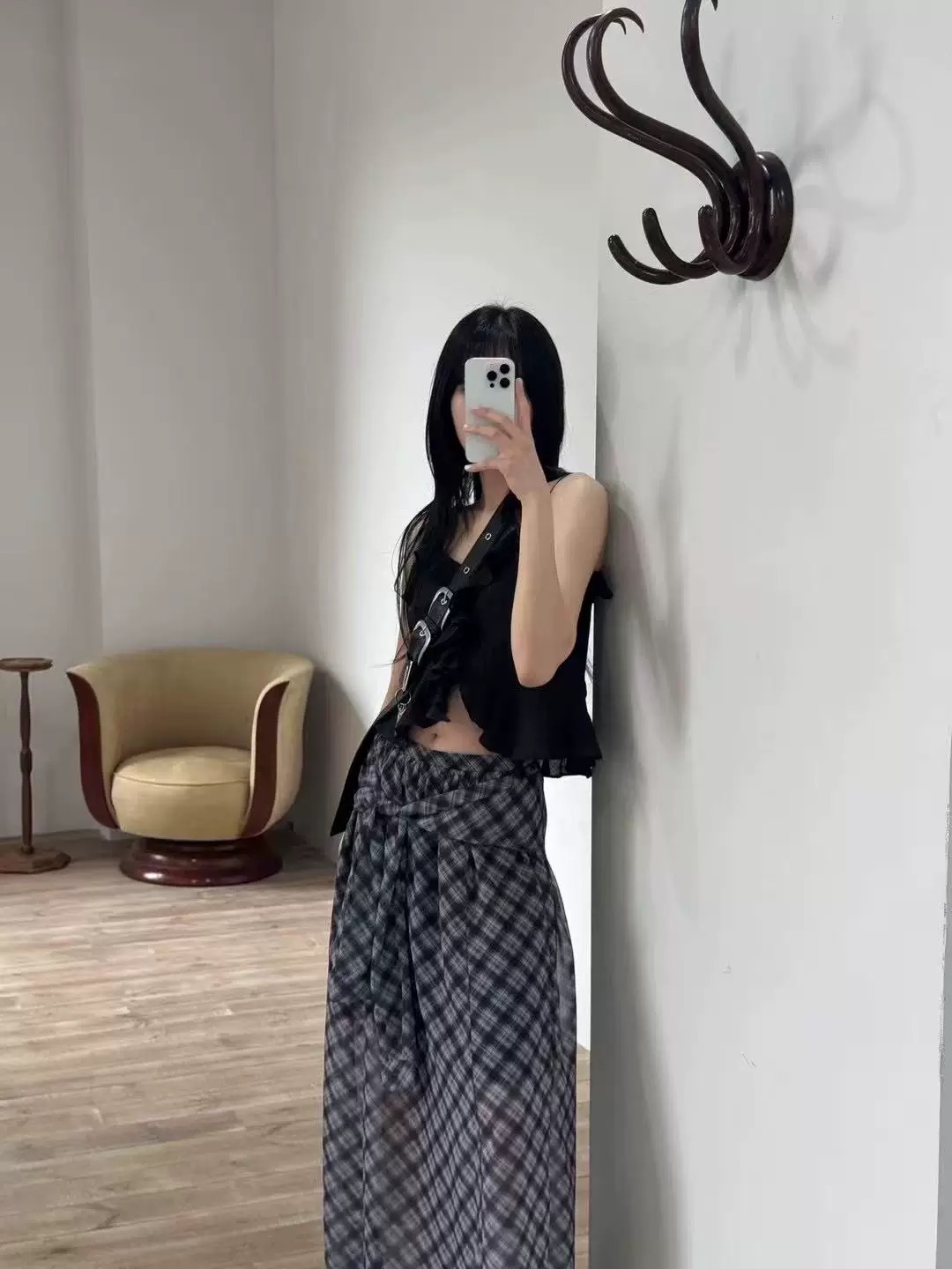 있음 선적 한국 ins 불규칙 프릴 우아한 센스 체크무늬 슬립 드레스