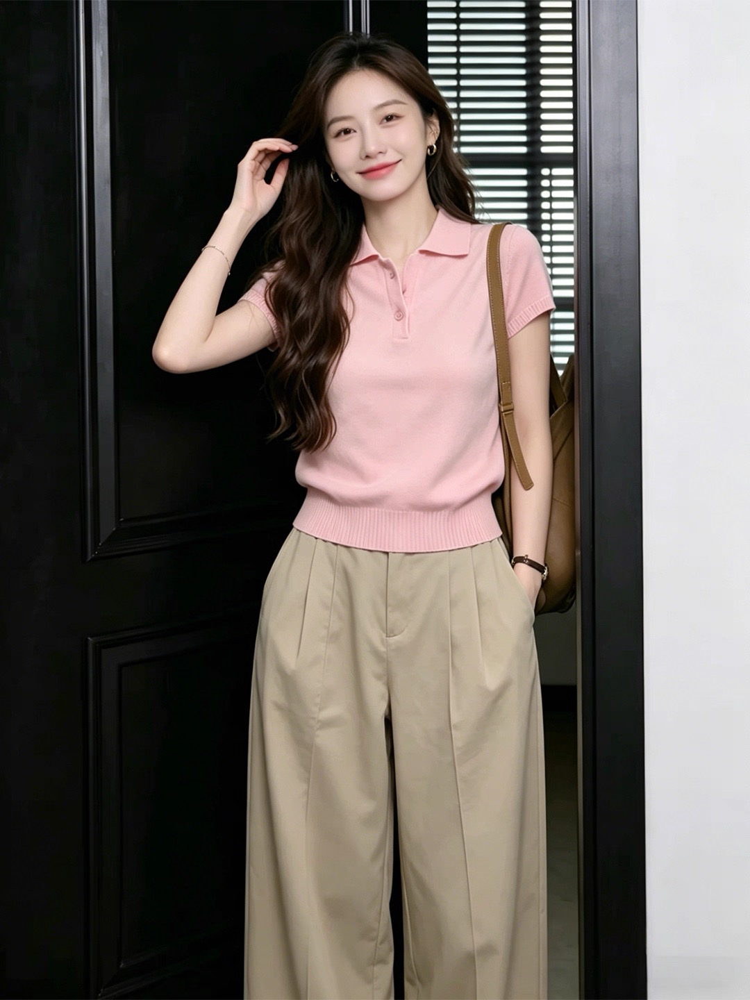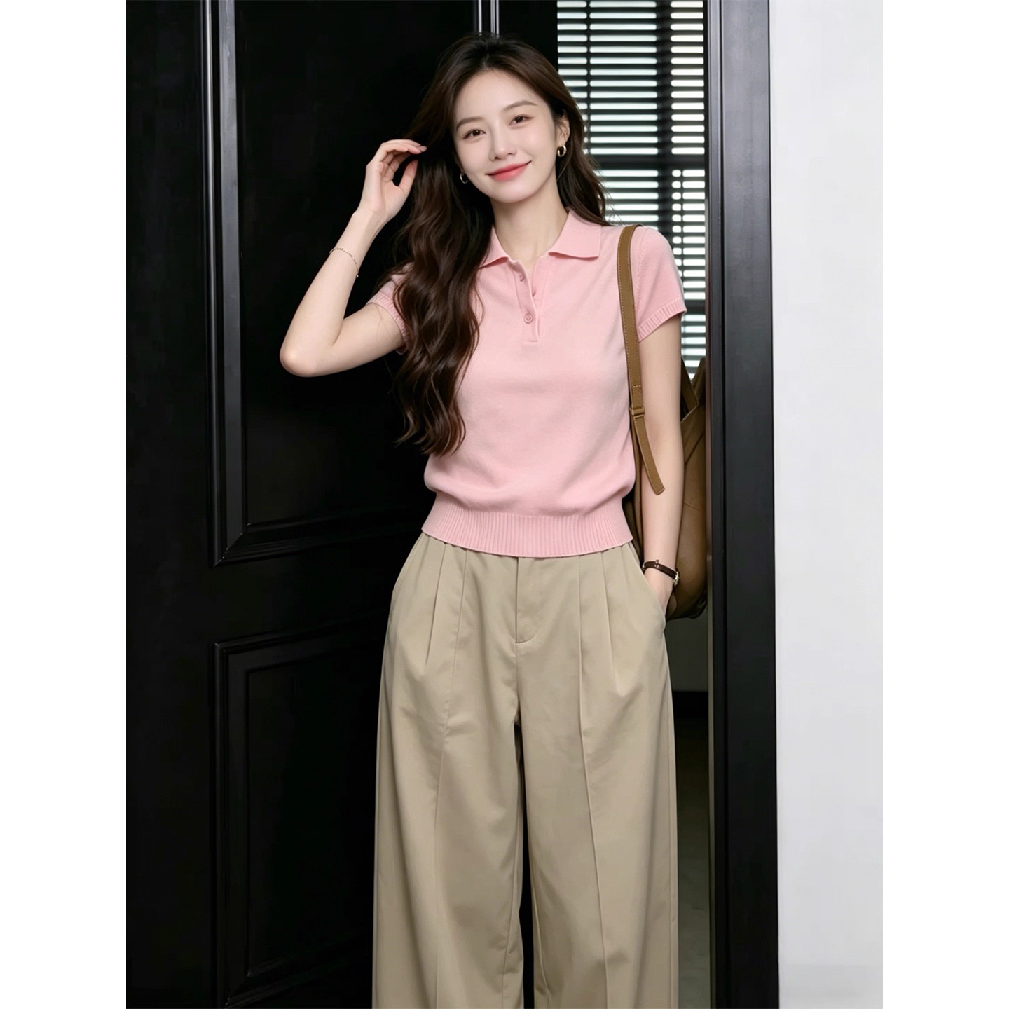 부드러운 느긋한 바람 핑크색 POLO 칼라 니트 반팔 세트 여성 여름 새로운 카키 색 와이드 레그 팬츠 투피스 세트