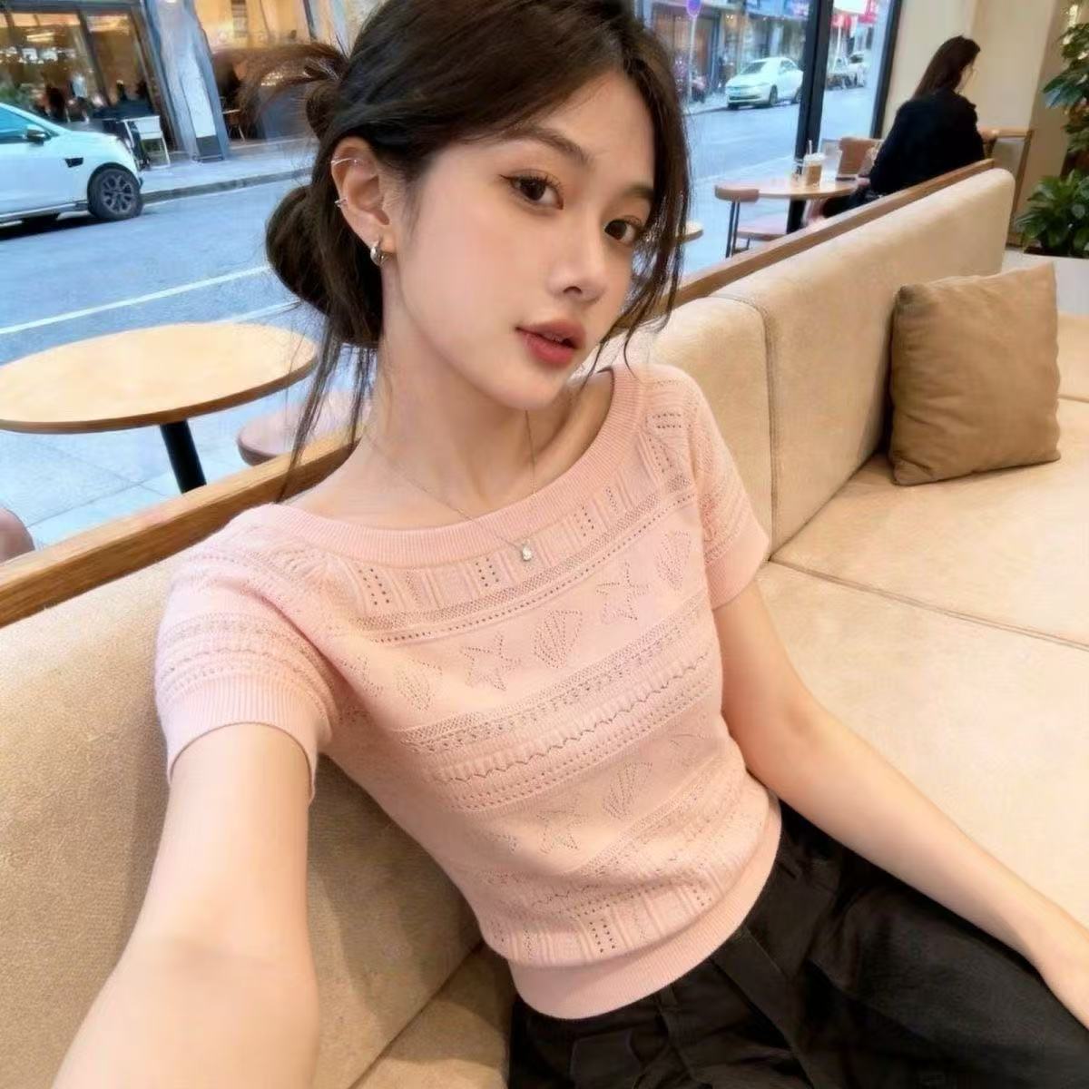 한 부서 부드러운 핫걸 바람 홀로우 아웃 여름 비스듬한 어깨 라이 경기 서울 주간 실크 반팔 슬림해 보이는 다용도 품격 니트 맨위
